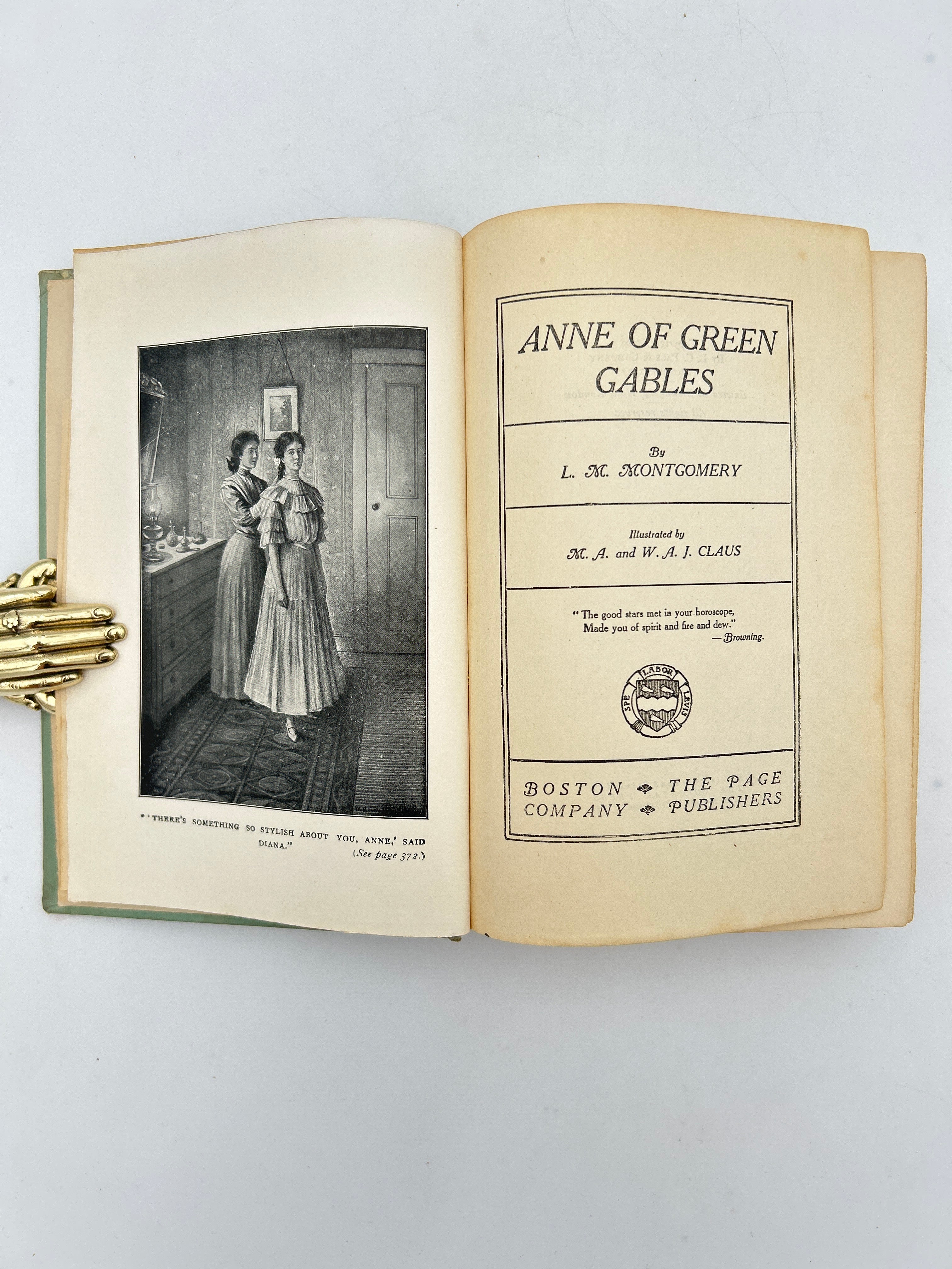Mint green cloth; cover color pastedown plate, gilt lettering on spine and cover, black and white illustrations by M.A. ad W.A.J. Claus; very nice copy with toning on spine that has colored to a light brown, fraying on upper and lower spine, intact. Early copy that is the most sought after title in the beloved Anne of Green Gables series.