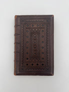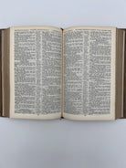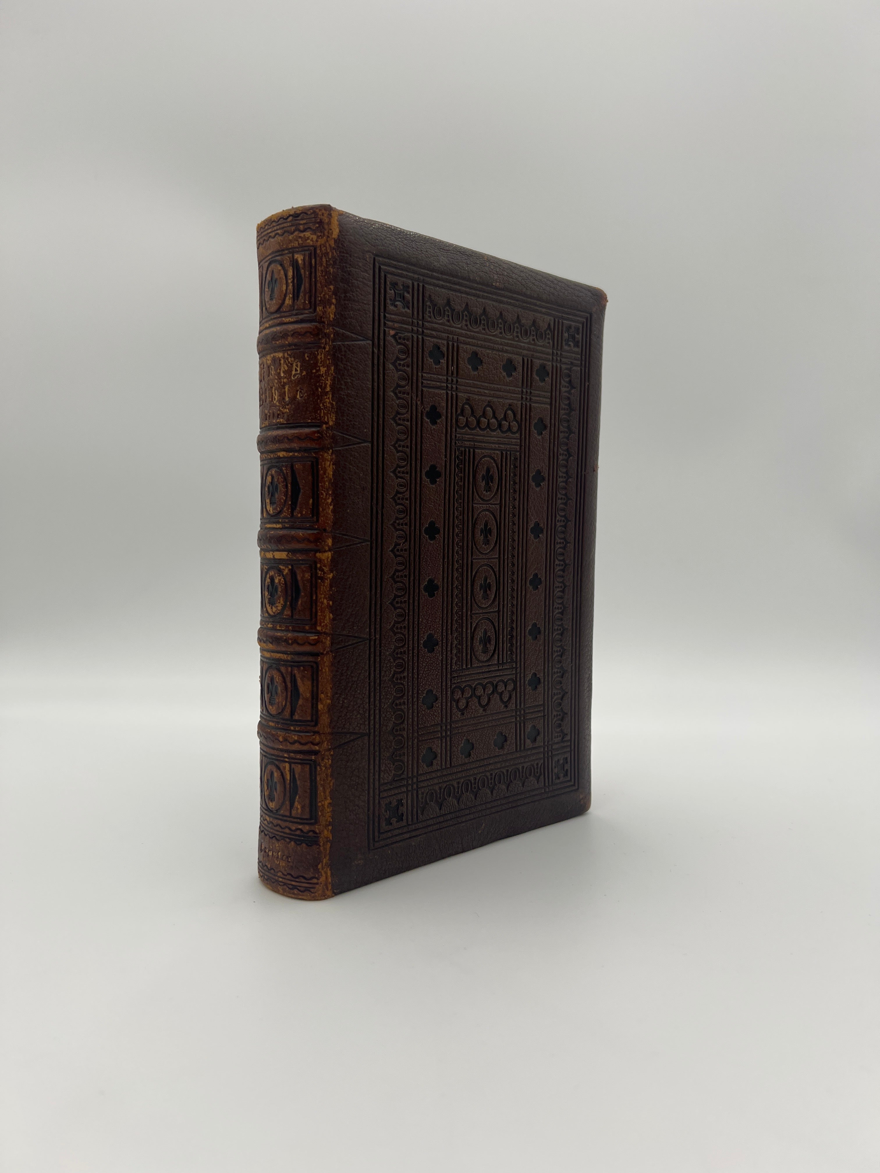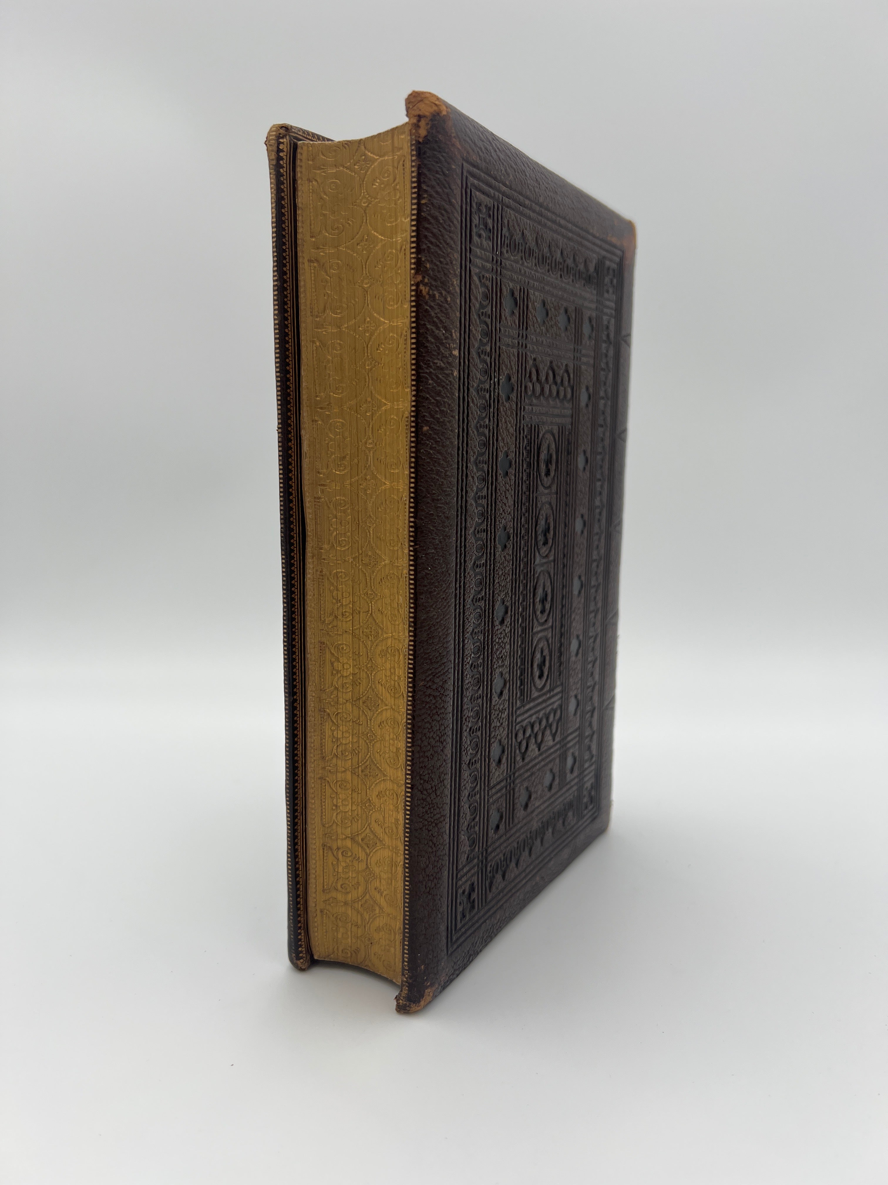 Beautiful rich brown embossed leather binding, five raised bands on spine, Holy Bible title on spine band, three edge gild, intact, very good condition.