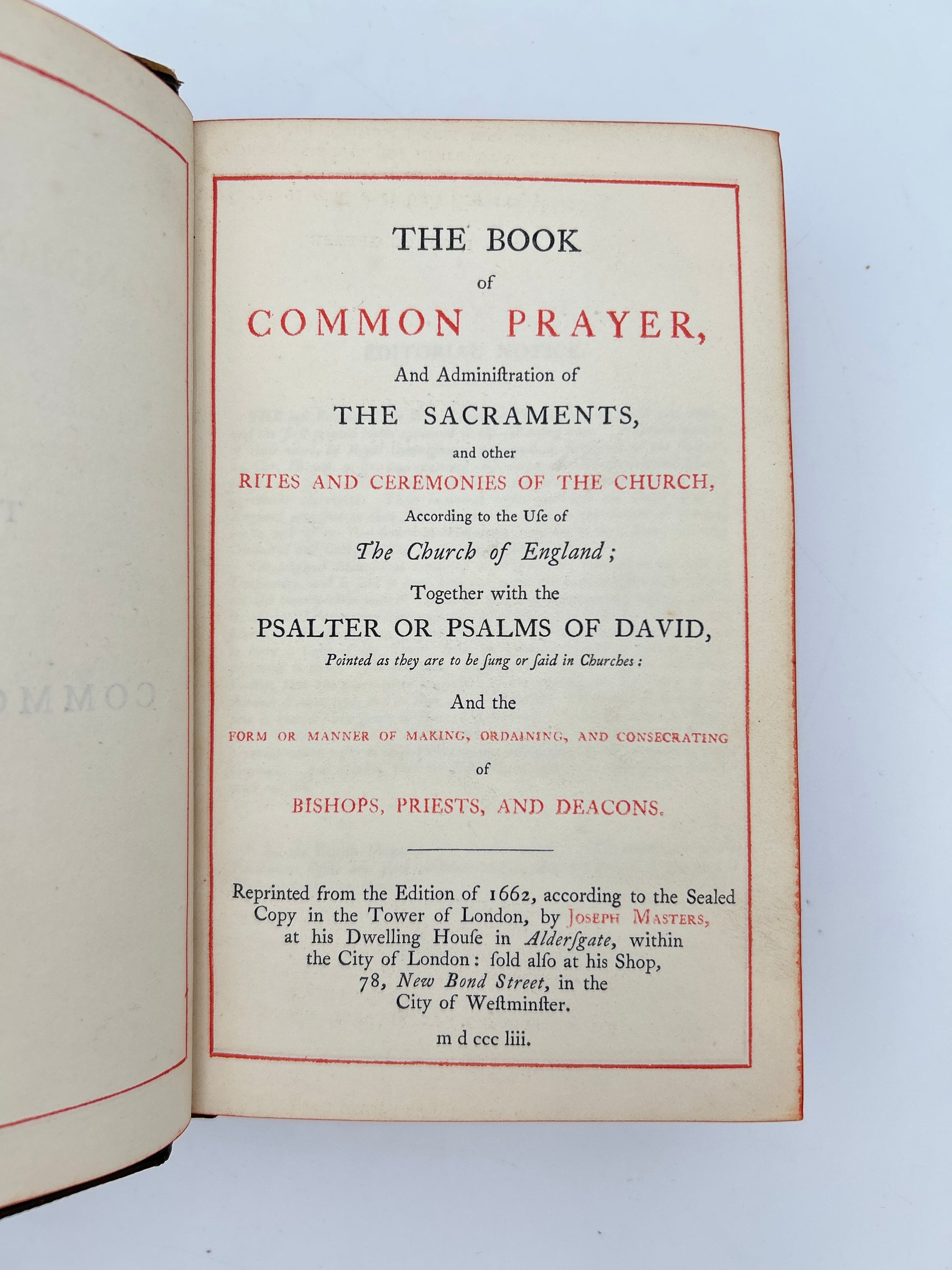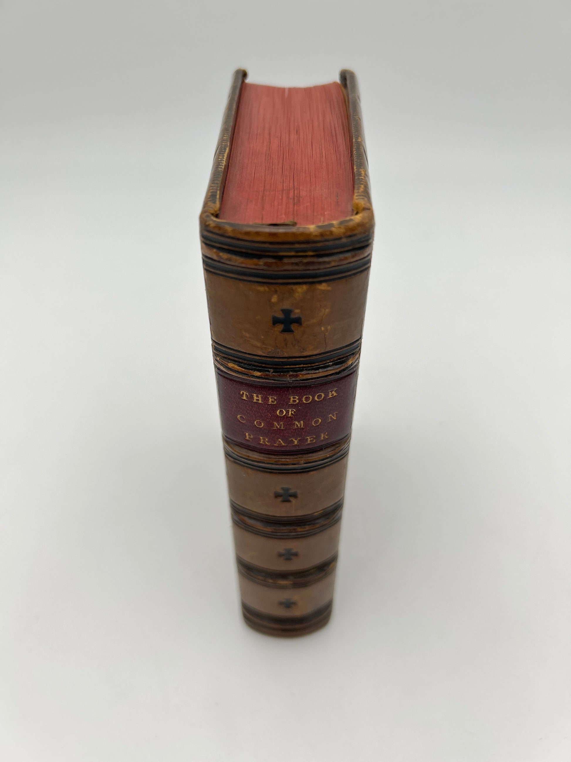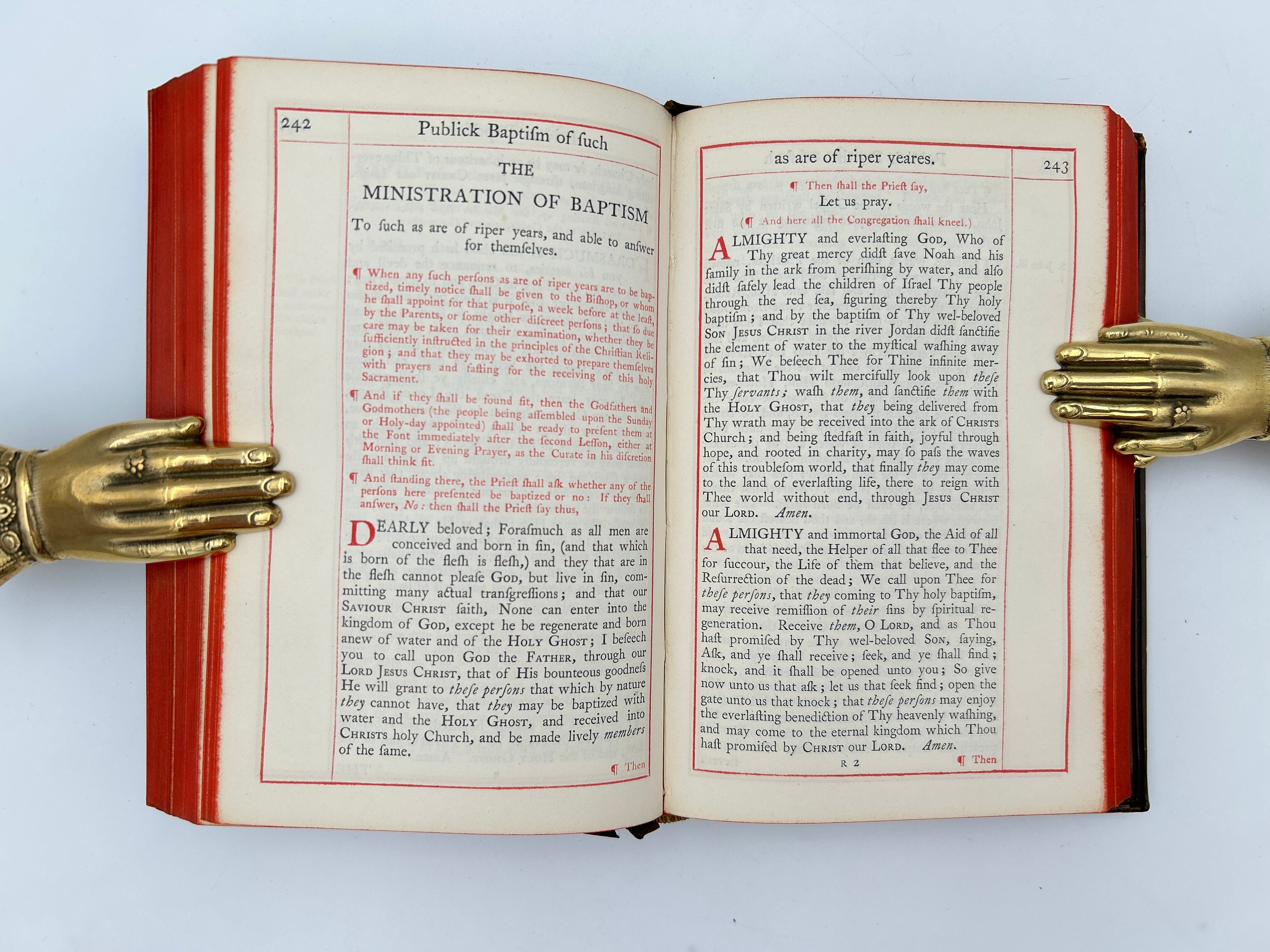 Full calf divinity or oxford binding, Inked raised bands, pallets, center tools to the panels and inked tooling to the boards. Pink edges. Red ruled throughout. Owner's name pasted to the end paper and written on the first blank. Marbled end papers. Contains the Sacraments and the Psalms of David. Slightly rubbed but still a charming example of this style. Very fine condition.