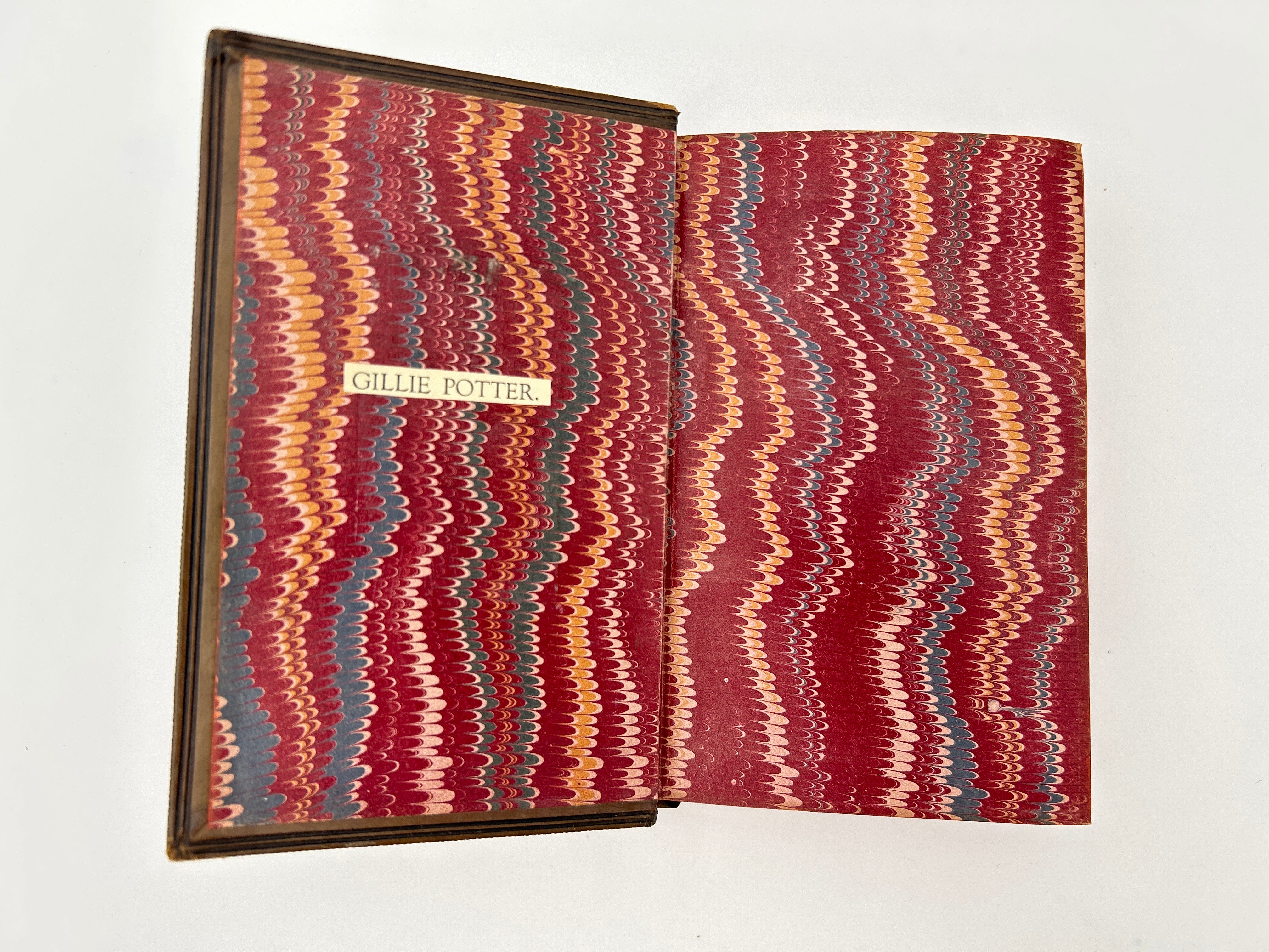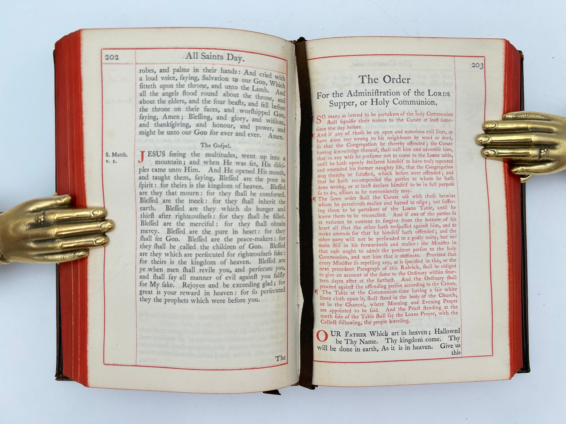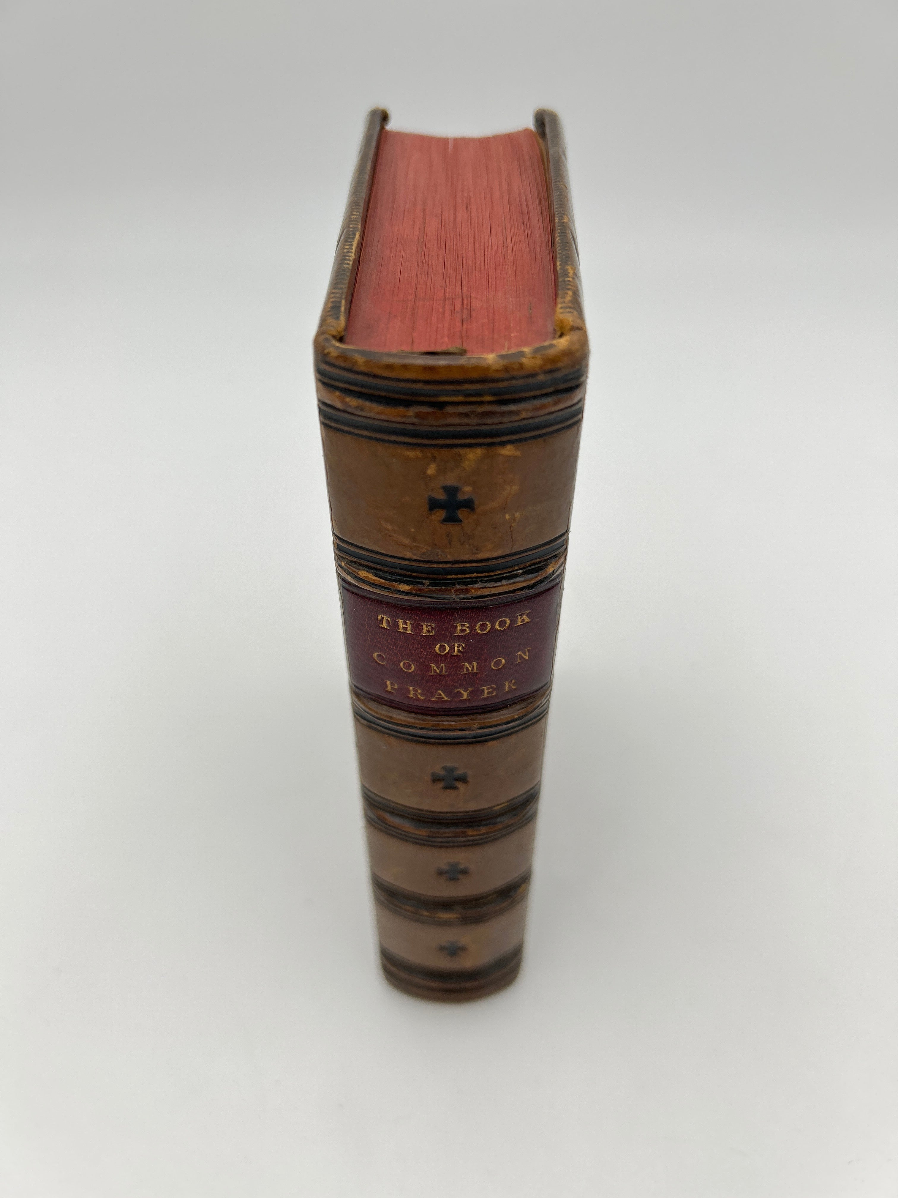 Full calf divinity or oxford binding, Inked raised bands, pallets, center tools to the panels and inked tooling to the boards. Pink edges. Red ruled throughout. Owner's name pasted to the end paper and written on the first blank. Marbled end papers. Contains the Sacraments and the Psalms of David. Slightly rubbed but still a charming example of this style. Very fine condition.
