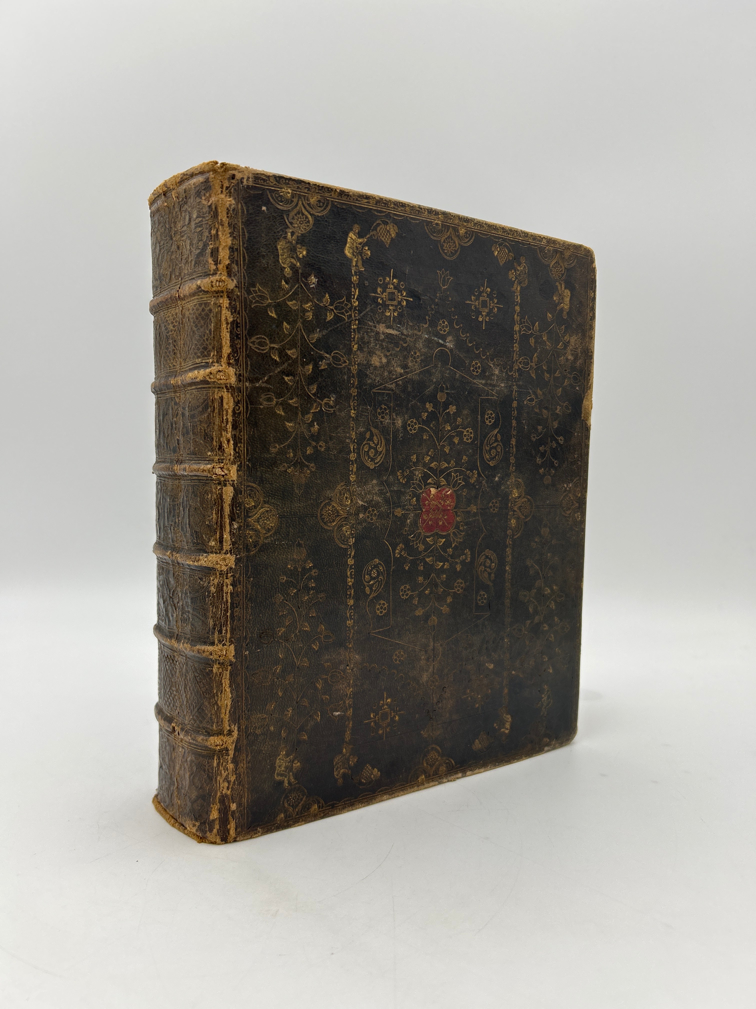 Brown leather binding with embossing on front, back and spine. Red leather inlay in center of upper and lower board. Six raised bands on spine. Red ruled pages. Gold gilding. Rubbing on all four corners and edges due to age, overall good condition.