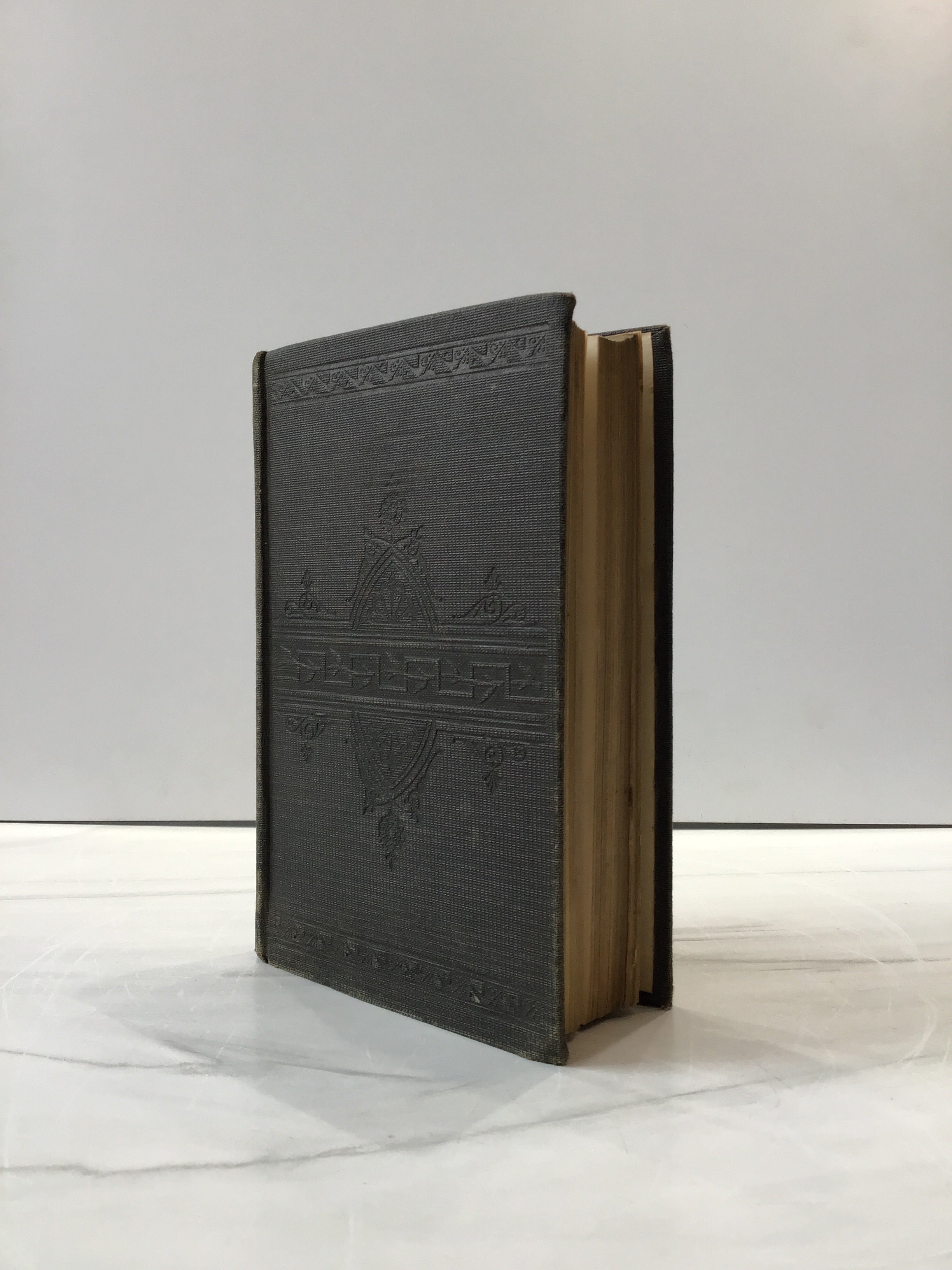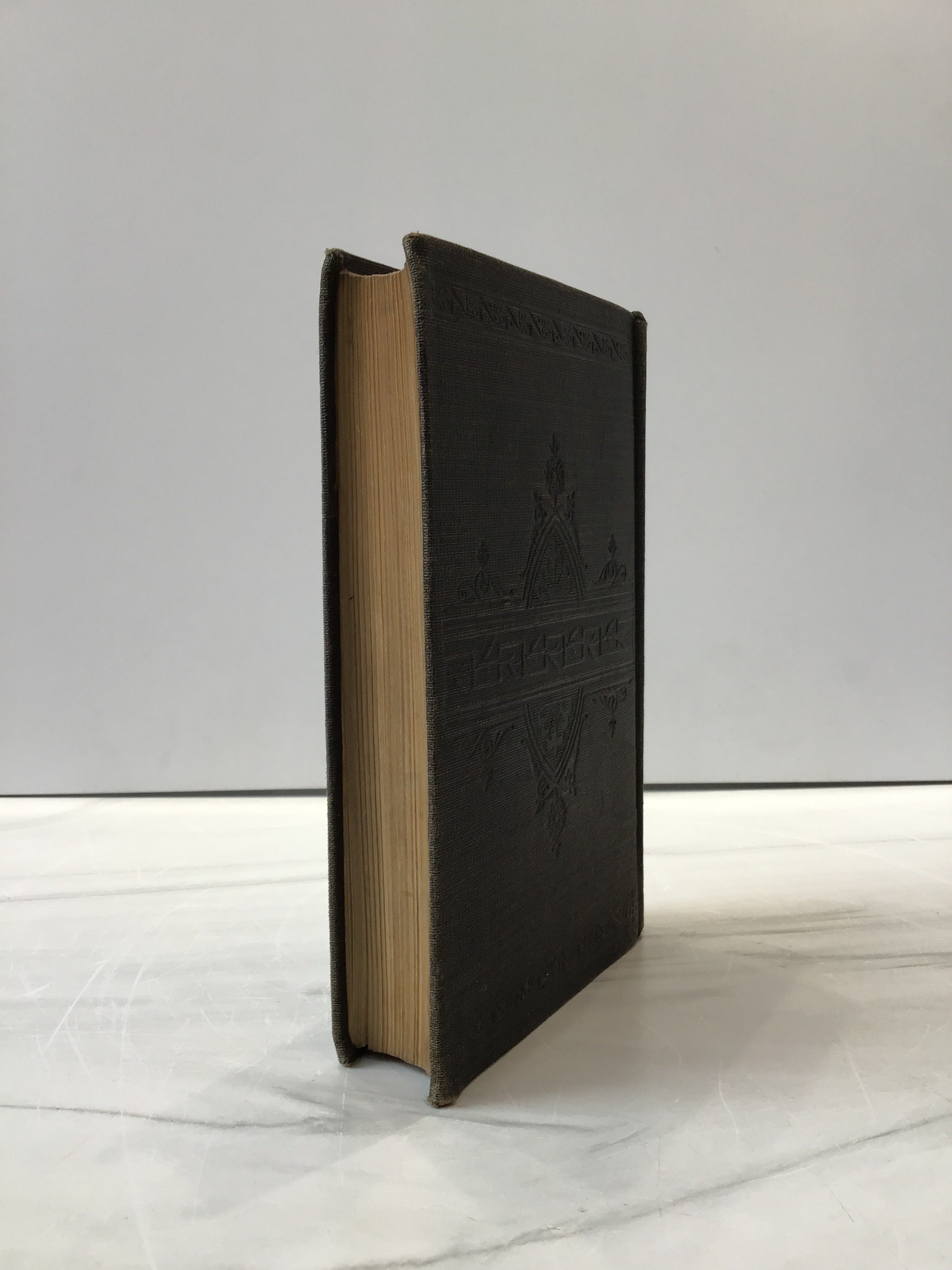 Black cloth cover with embossing on front and back covers. Gold lettering on spine
