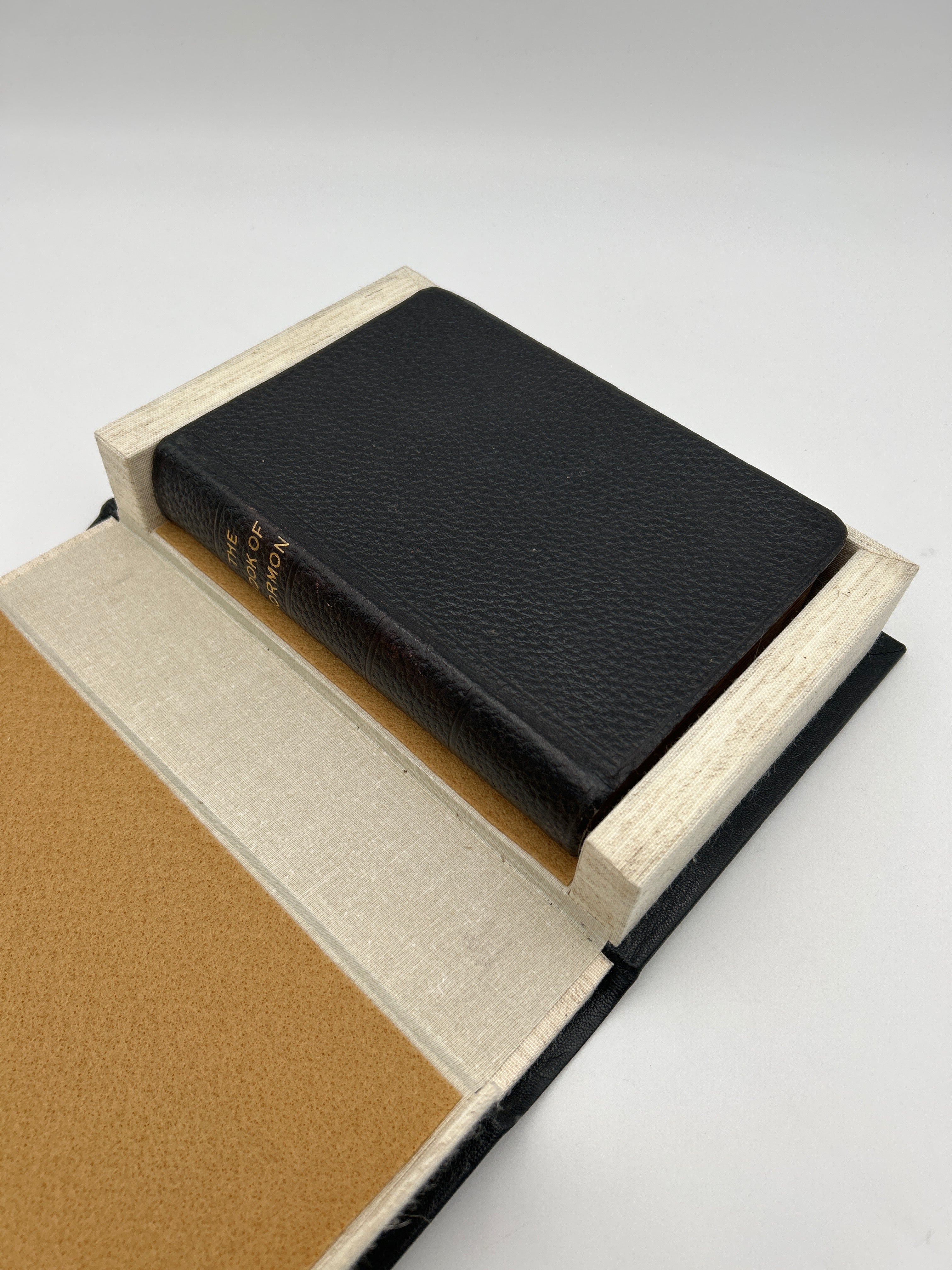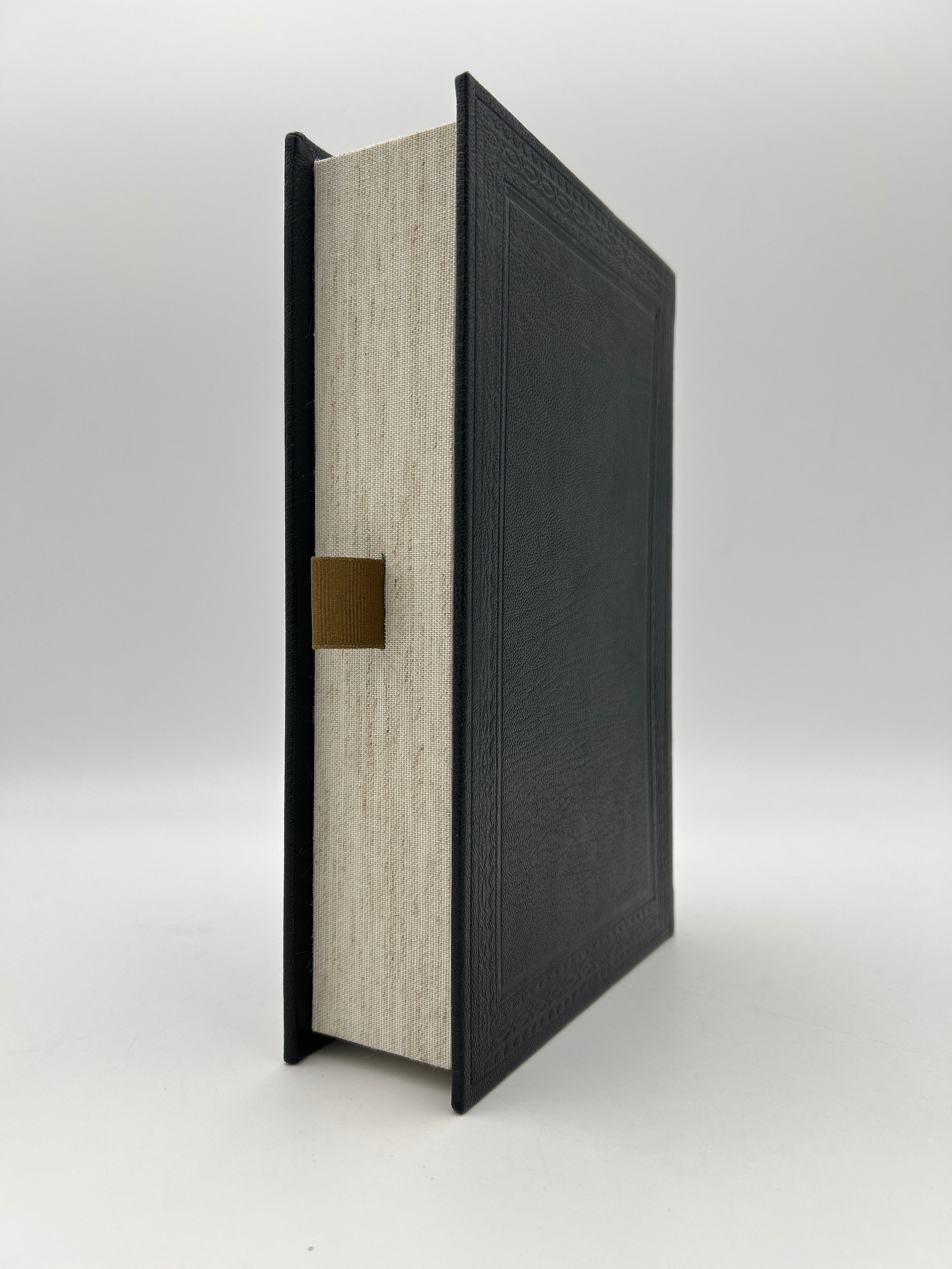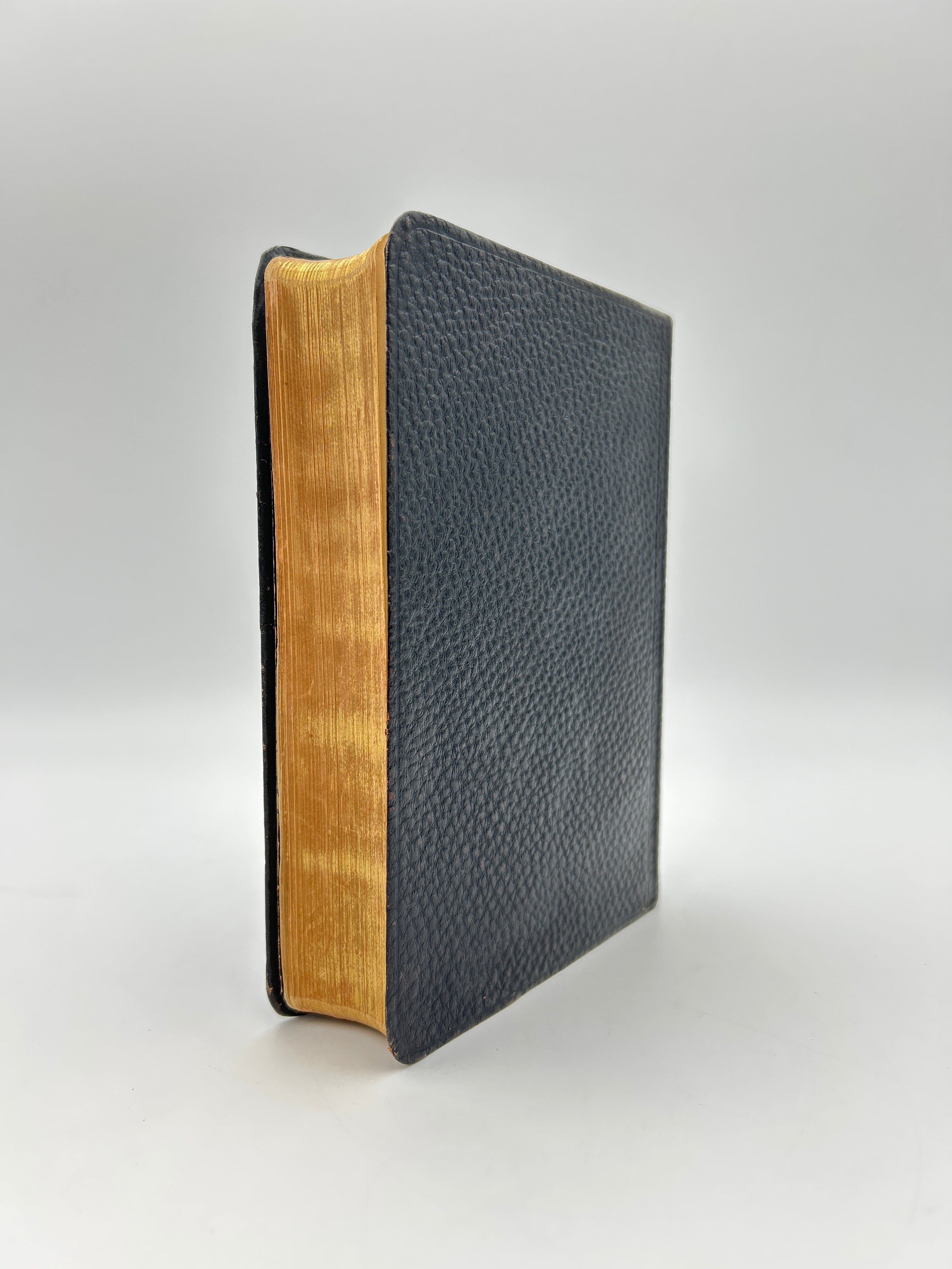 Black pebbled leather limp binding. Gilt lettering on the spine. Inscription on second black leaf. All gilt edges. Housed in a black clamshell with gilt lettering on the spine and a gold ribbon tab. Very fine condition.