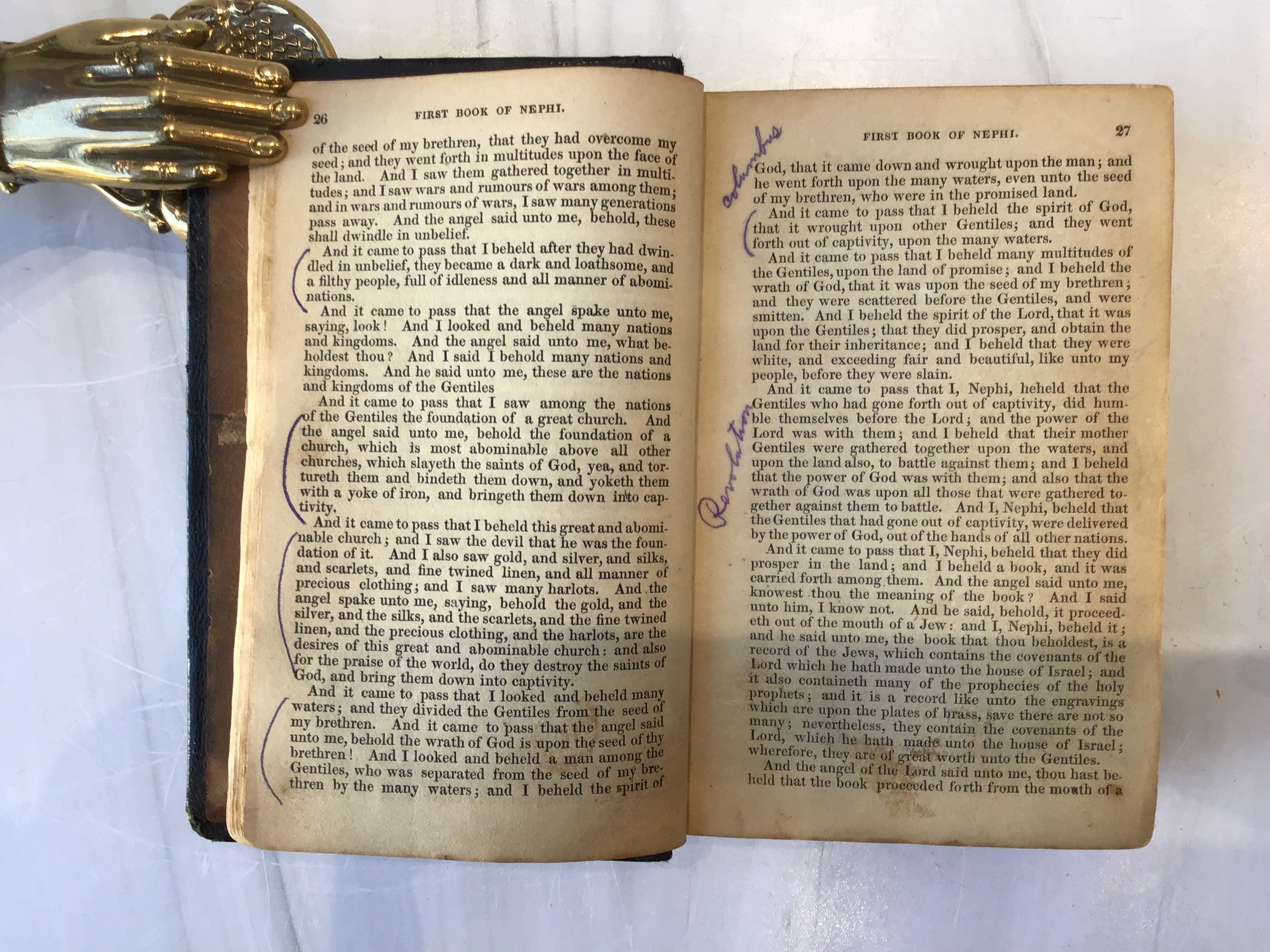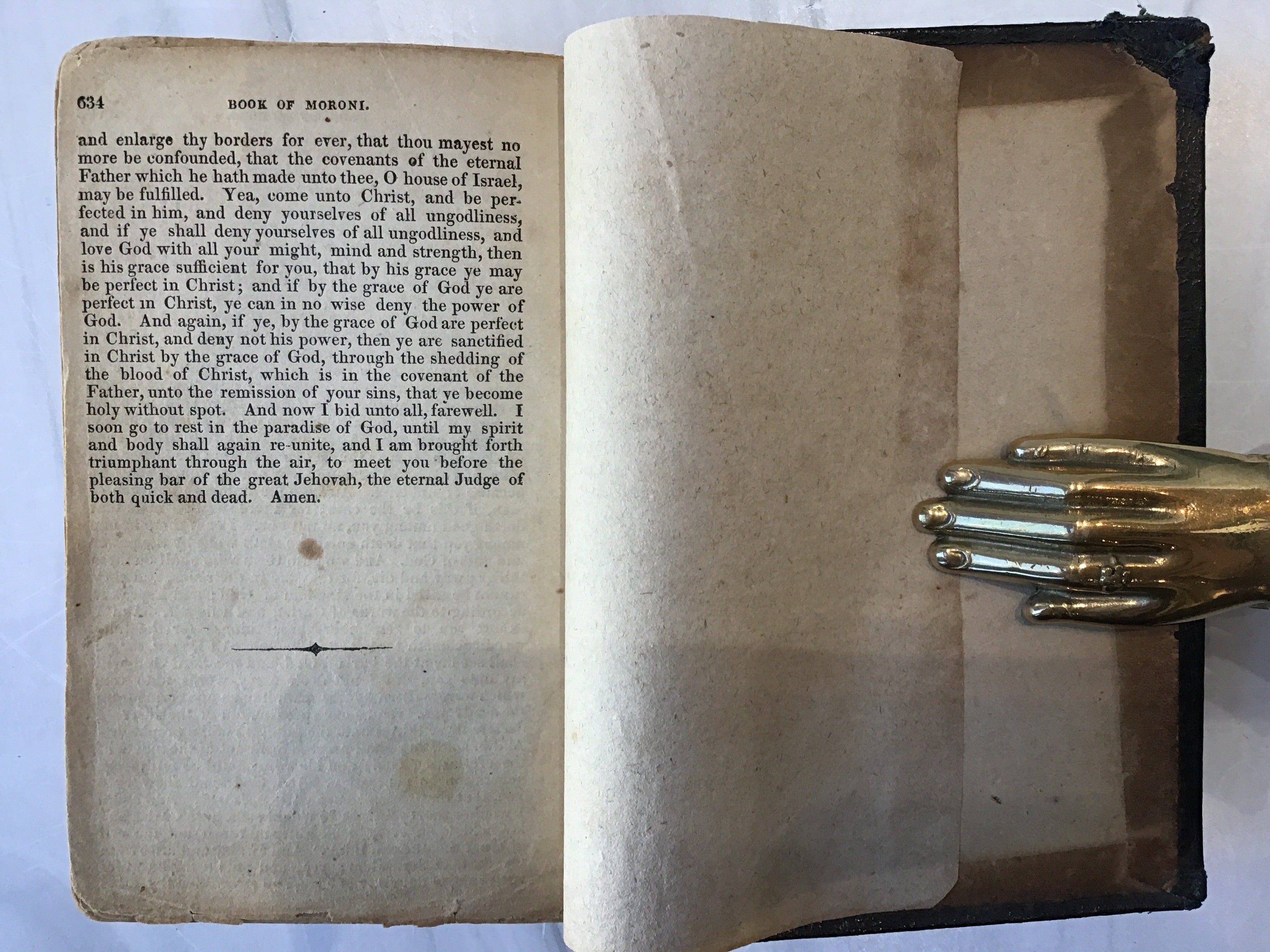 This 1841 Liverpool edition is essential a faithful reprint of the 1837 Kirtland edition. Unlike its predecessors, it has the testimonies of the three and eight witnesses at the beginning and is the first to incorporate an index as an intrinsic part of the book. Printed in double columns, this “index,” like the 1835 References to the Book of Mormon after which it is pattered is really a book-by-book outline or an extended table of contents.