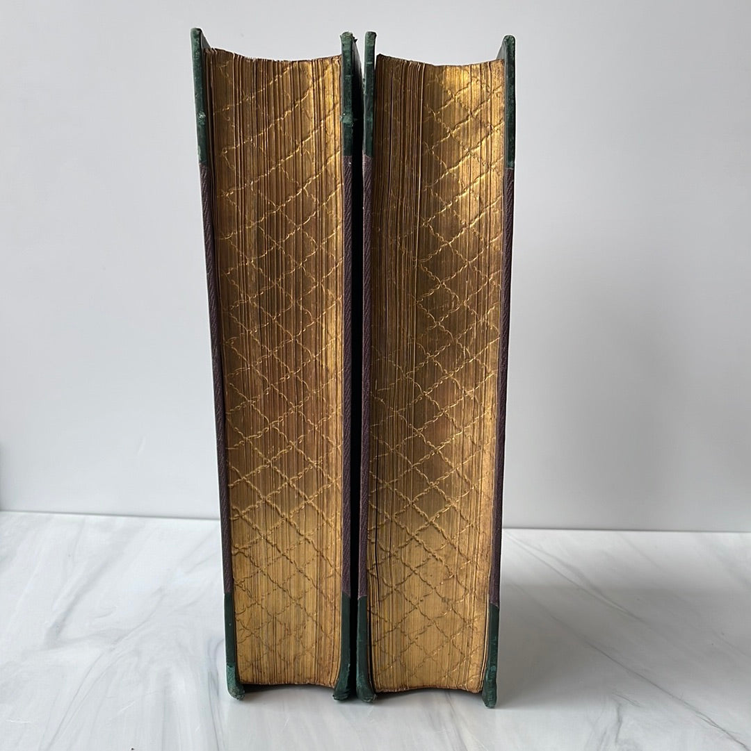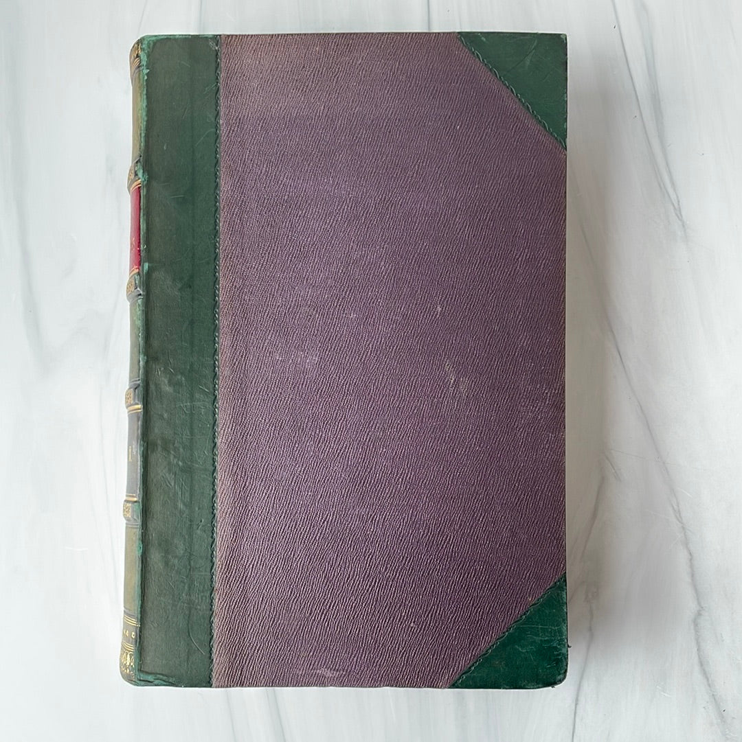 Dark Green 3/4 leather, gold embossing and letters on binding, gold gilt paper edges, very good condition.