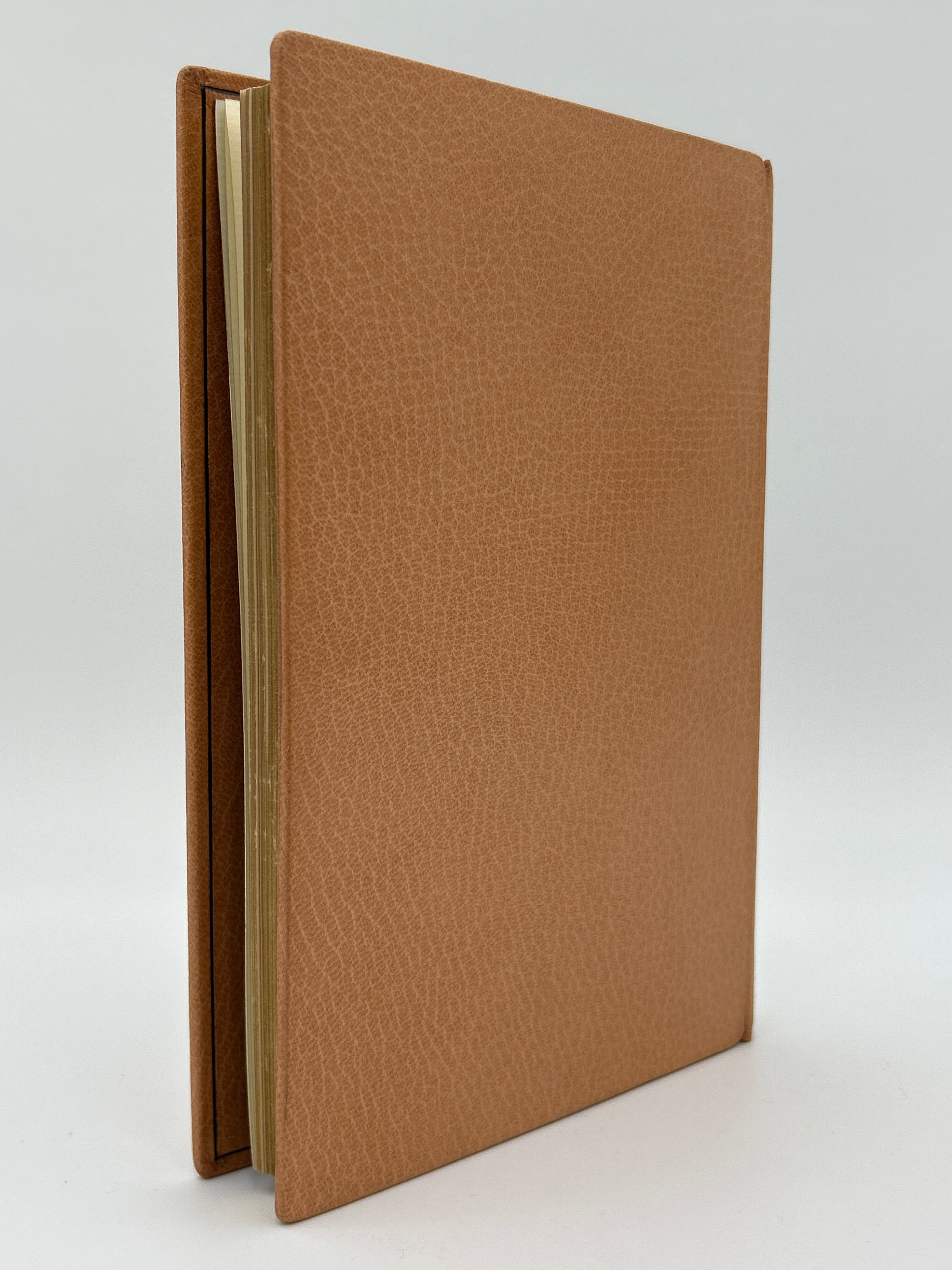 Tan leather with blue and pink leather title and illustration inserts on the front cover and spine. Full wrap leather with black border lining inside covers. Navy blue endpapers gilt edges. Excellent condition. Rebound by the Chelsea Bindery.