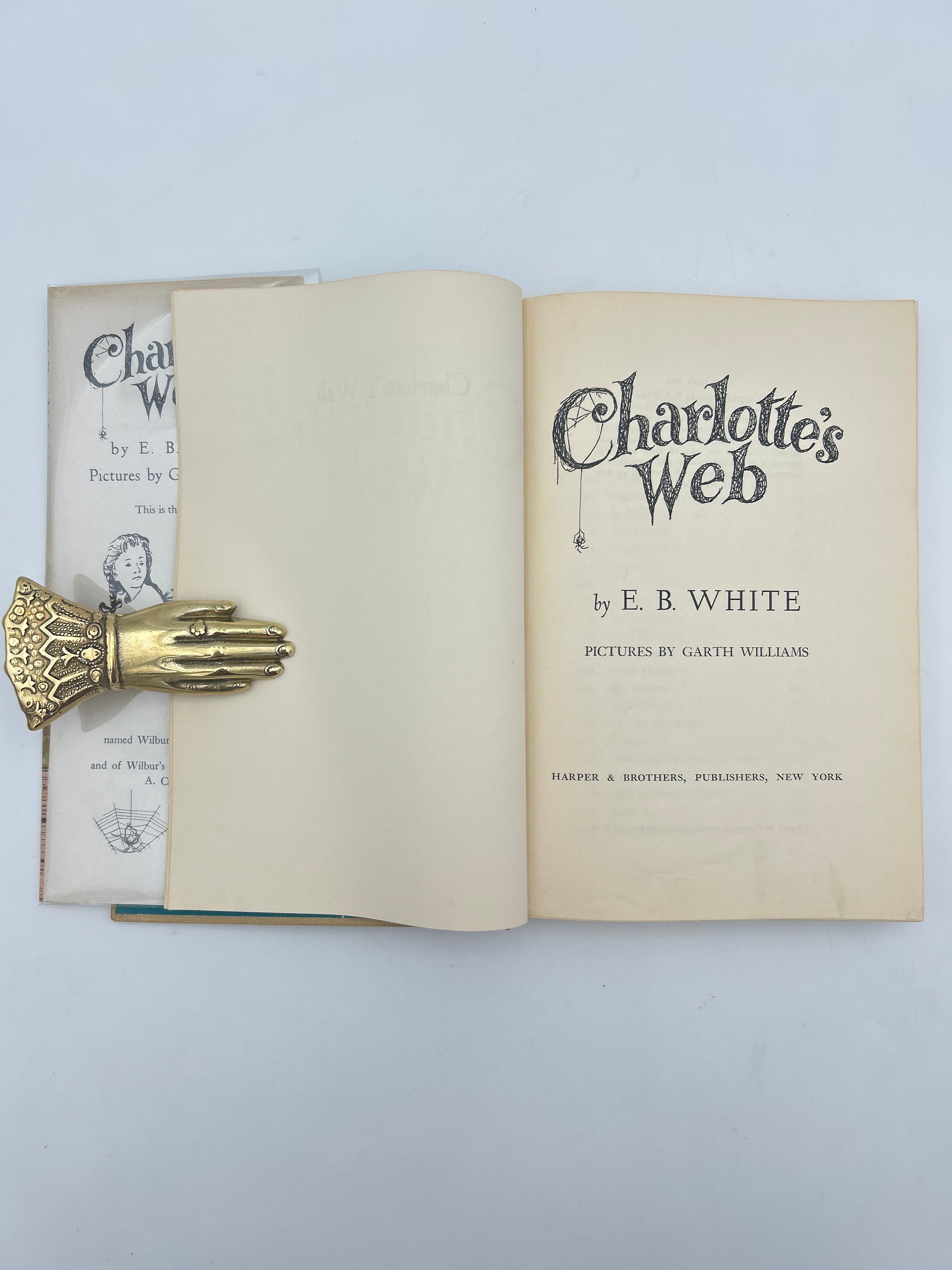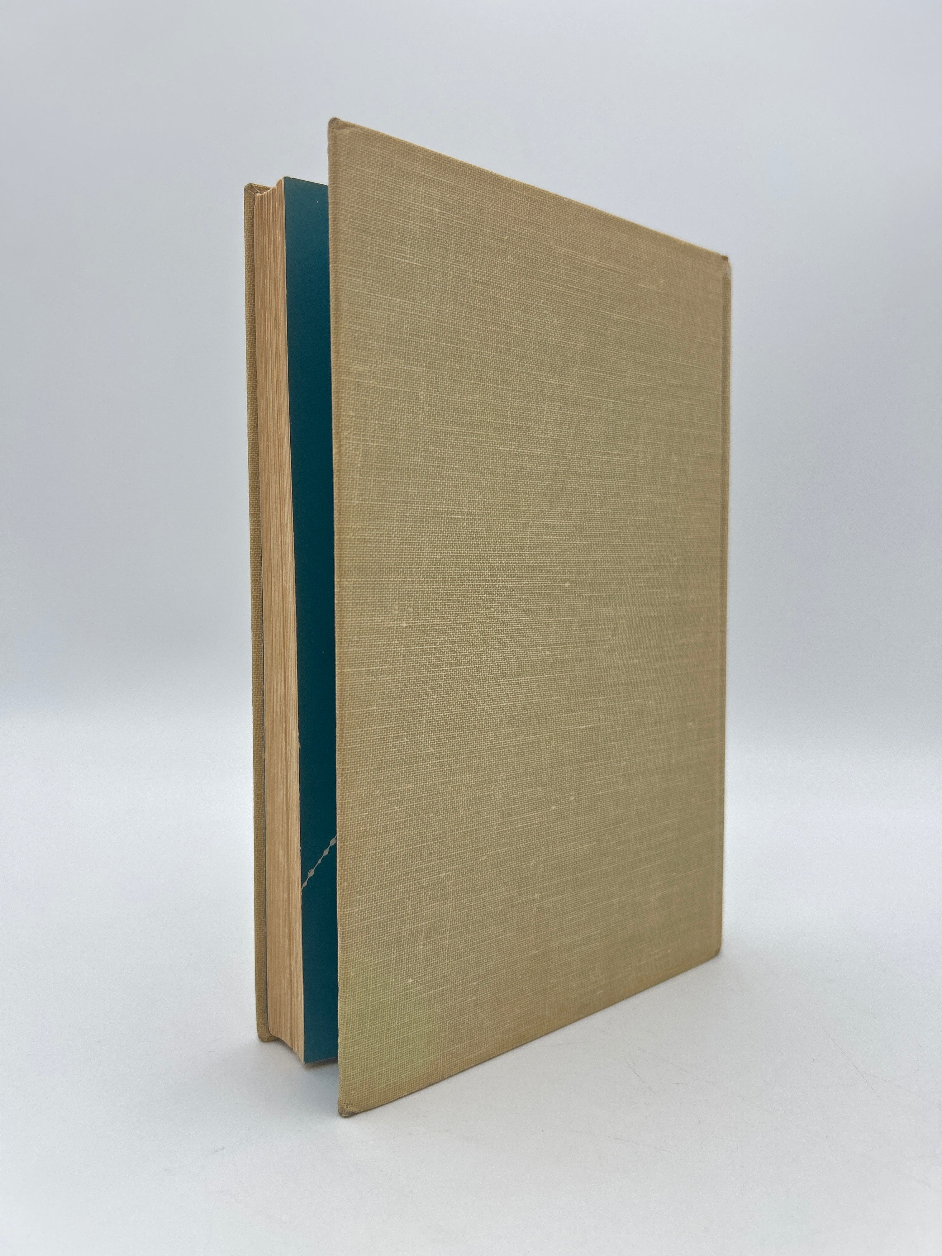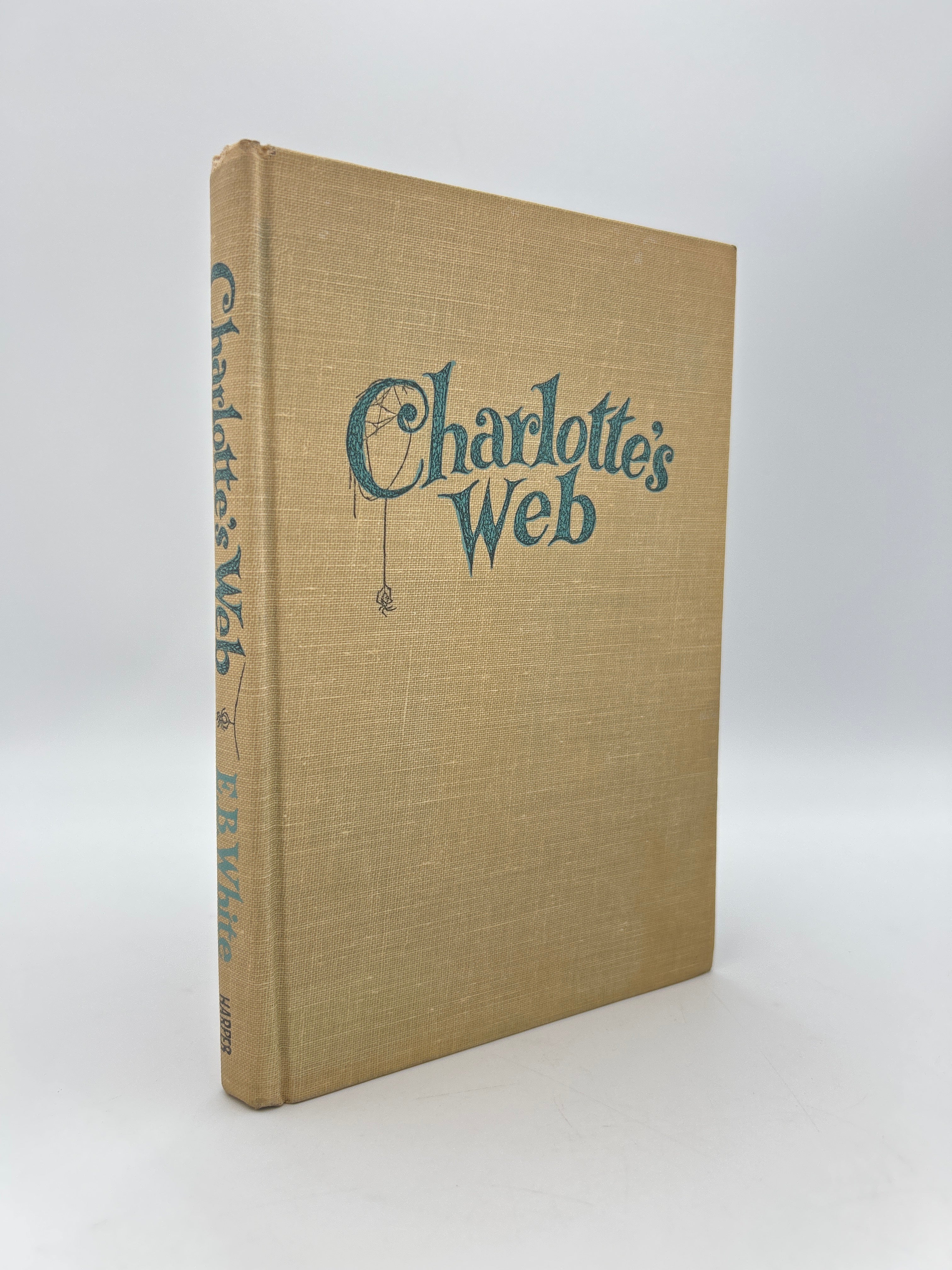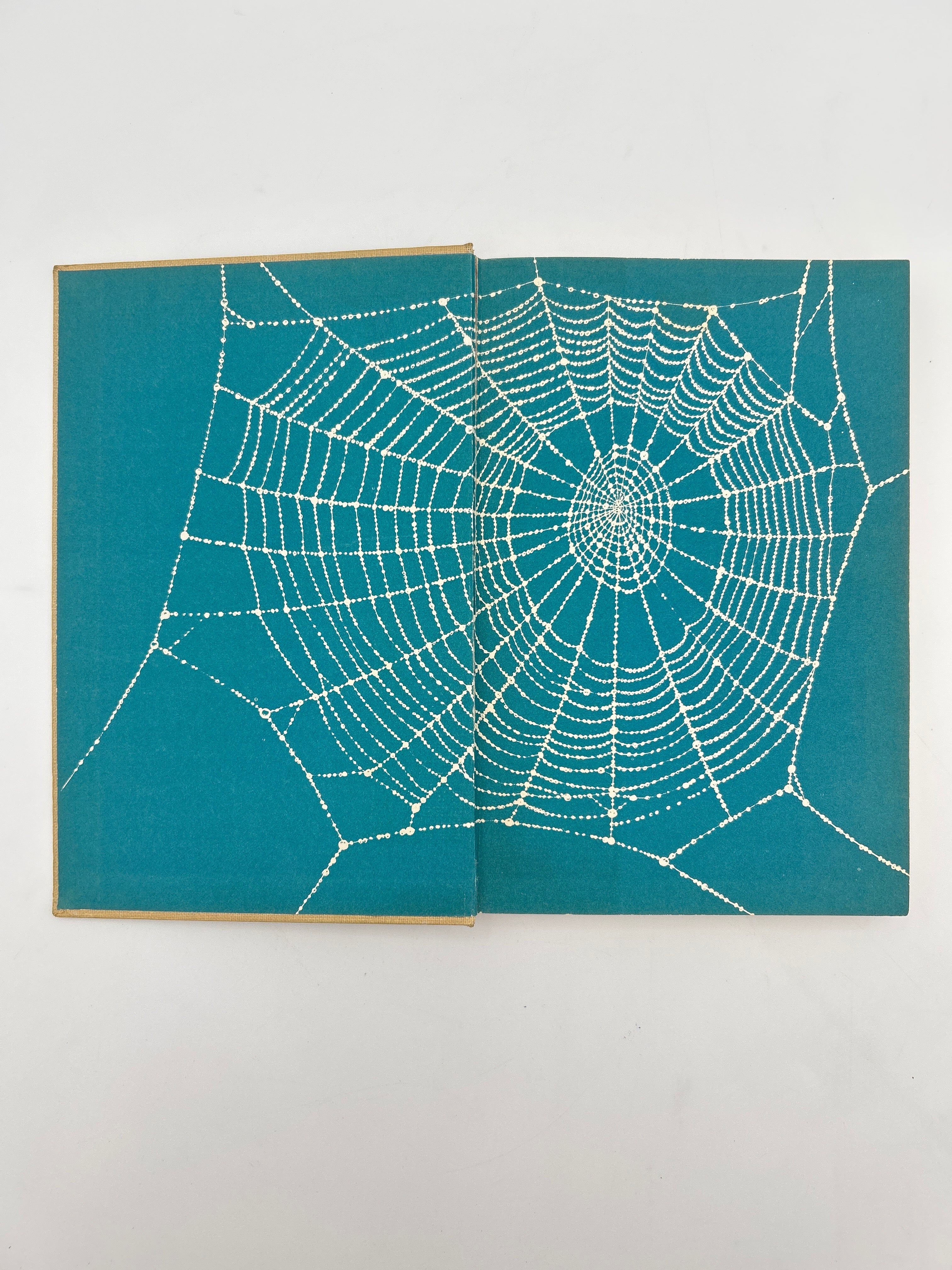 Tan cloth cover with turquoise writing on spine and front cover. Turquoise endpapers with spiders web design. Original dust jacket in good condition with some darkening to the paper, especially on the spine, and some chipping on top and bottom of dustcover, very good condition.