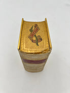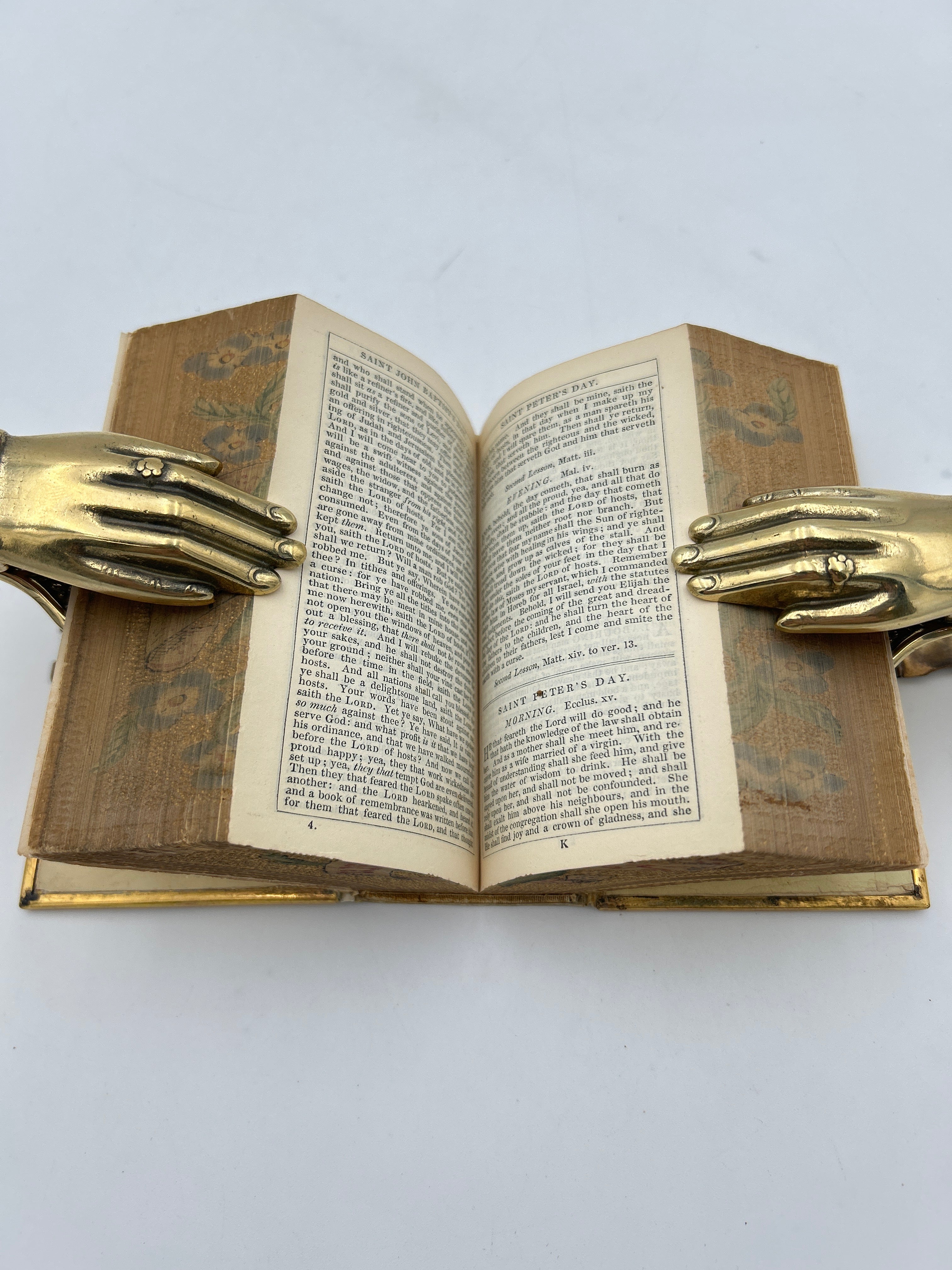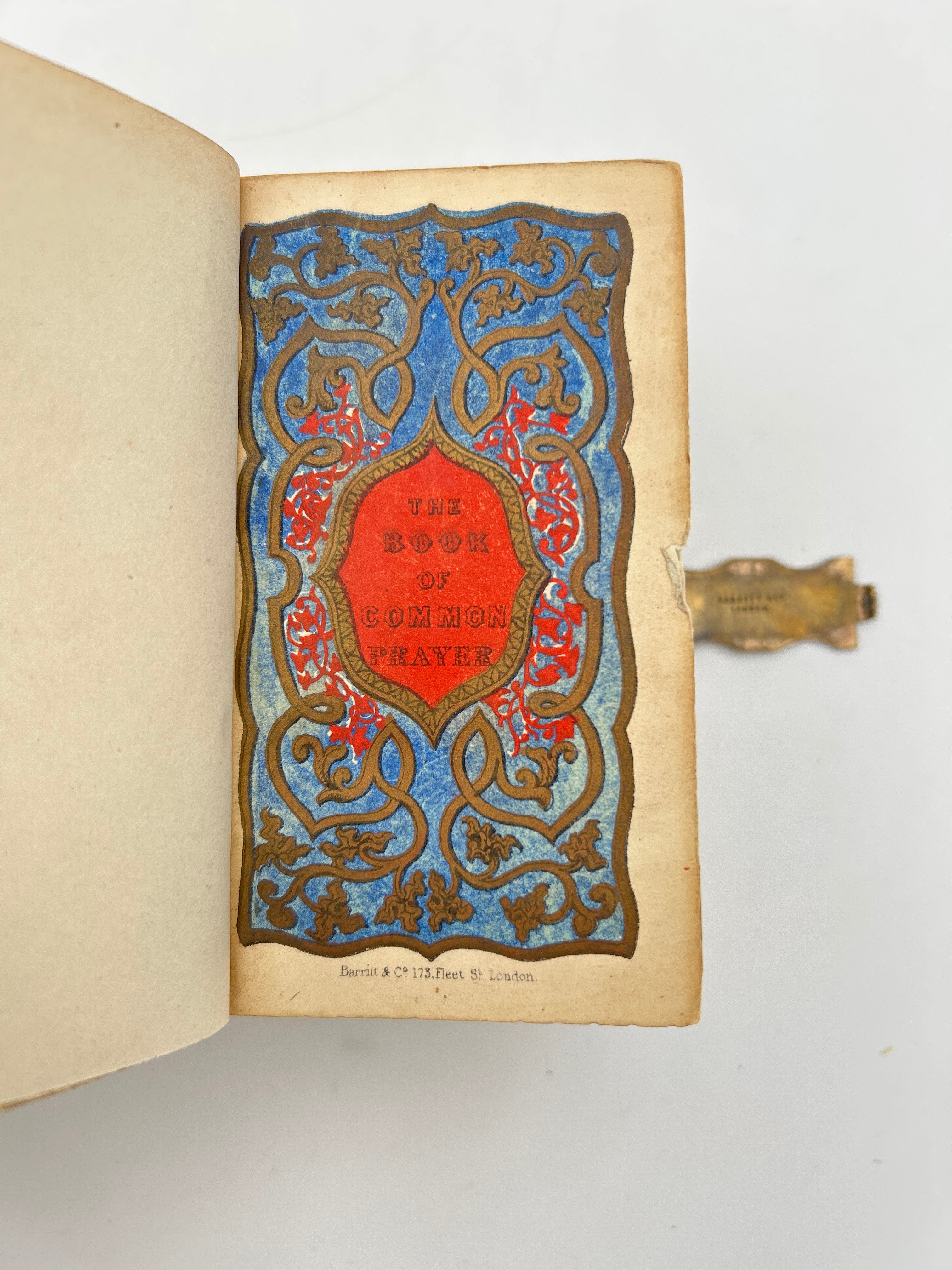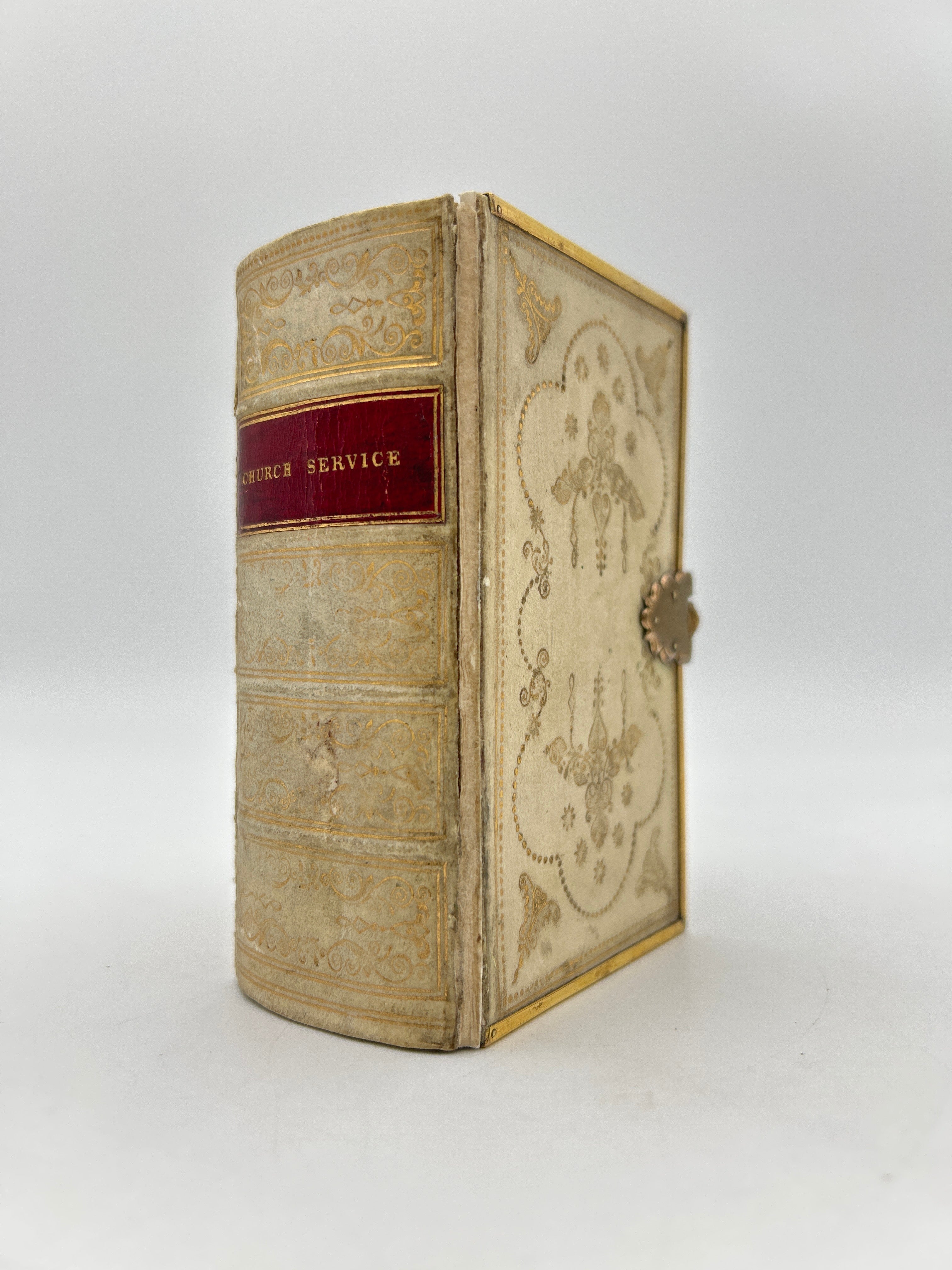 Pocket edition, vellum with beautiful gold tooling on front, back and spine, maroon title label on spine, ‘Read, Mark, Learn’ illustrated in an open fore-edge paintings on three edges. Brass clasp enclosure and brass edges. Some rubbing on back with crack along back edge, otherwise very good condition.