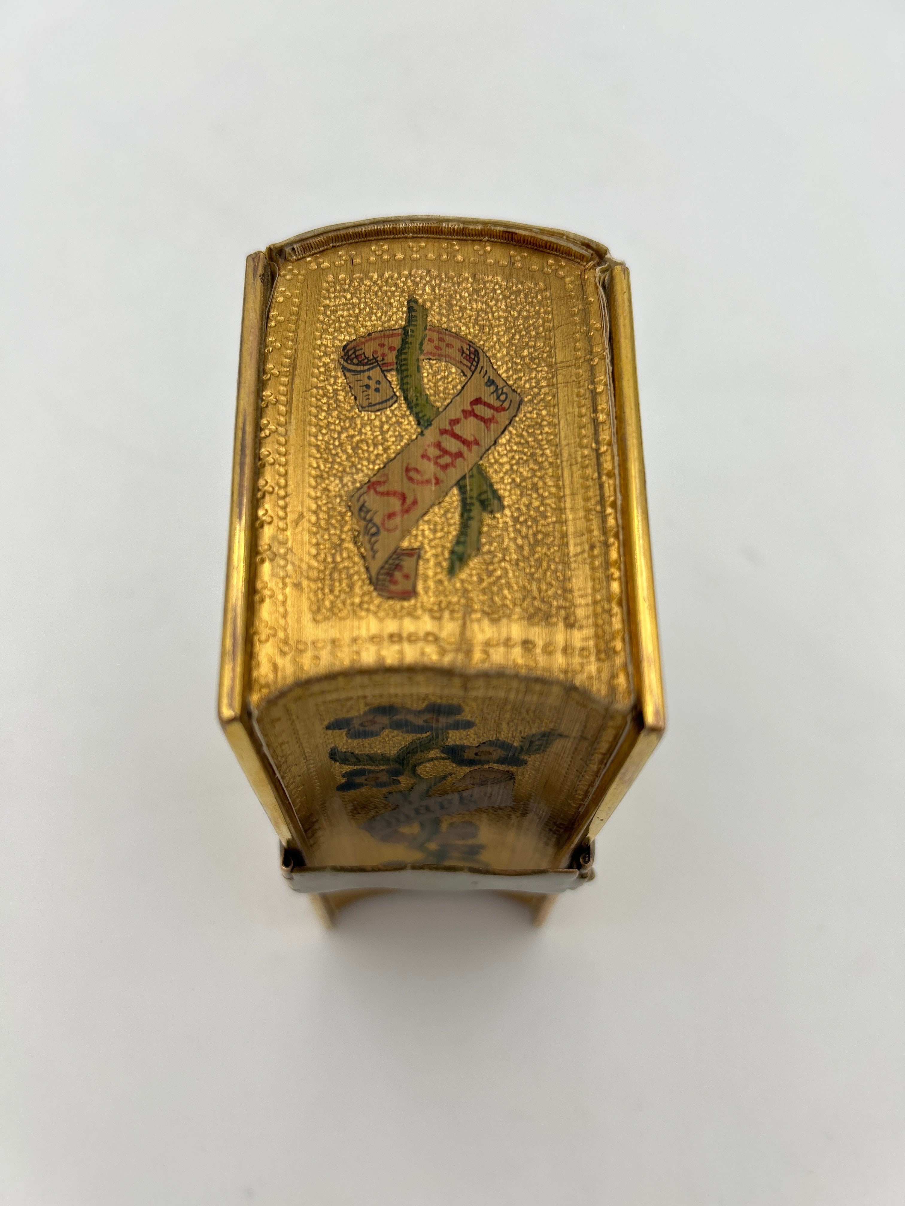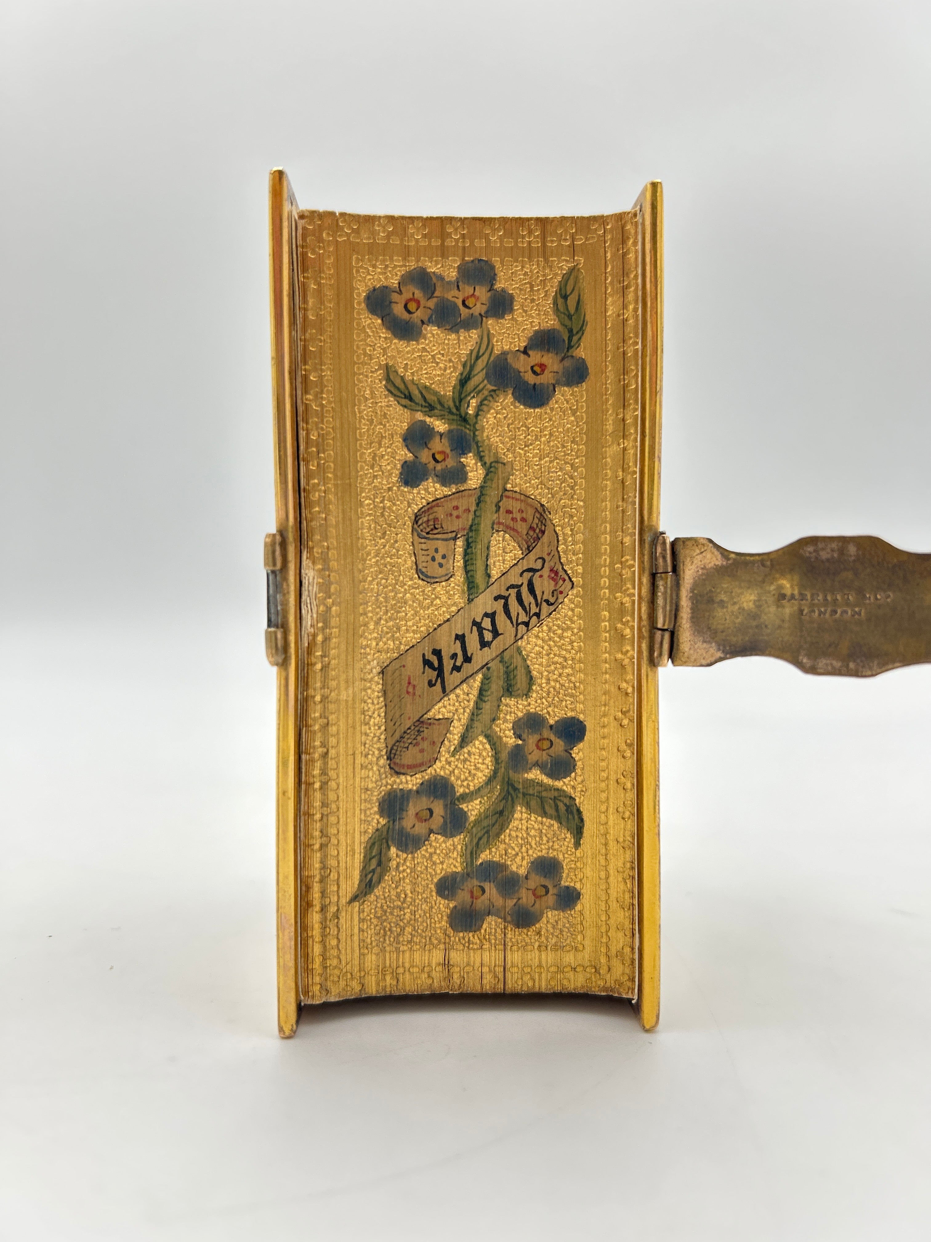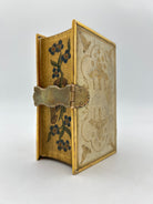 Open fore-edge paintings are painted directly onto the flat, closed edge of the book, so it can be seen immediately, unlike the more secretive “vanishing” fore-edge paintings that only appear when the pages are fanned. Open fore-edge paintings were used earlier and more broadly, especially in the 16th and 17th centuries, and often feature simpler decorative patterns, landscapes, coats of arms, or marbling. In this case the open fore-edge paintings are of foliage and text on banners that say ‘Read, Mark, Learn’