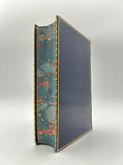 Bound in smooth, blue leather with raised bands, yellow & grey sewn endbands, marbled paste downs/end papers, marbled edges of textblock, gold tooling around edges of cover, gold titling and decorations on spine, and along outside edges of cover, blind tooling on inside edges of cover, pictorial illustration of Tennyson at front. Leather on spine faded to grey/green by sun, one gouge mark at bottom of front cover with minimal scrapes and scratches otherwise, leather at head of spine covering headband has tears allowing it to pop up a bit, textblock intact without any visible damage or wear.