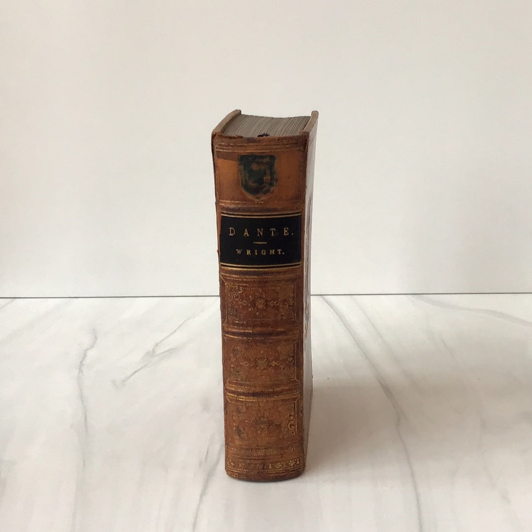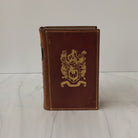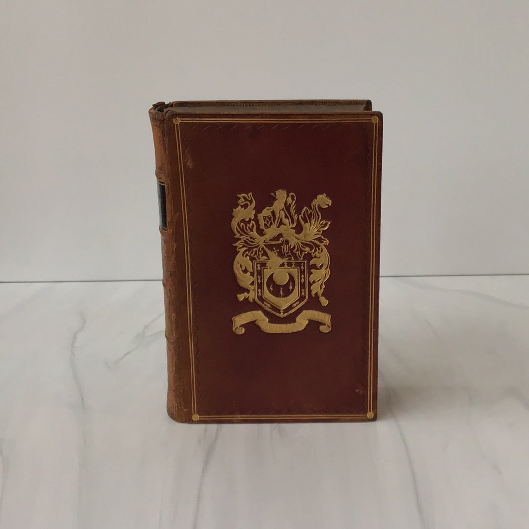 Beautiful red leather, god embossing on front, back, spine, four raised bands on spine, black label title band on spine, three edge marbling, very good condition.