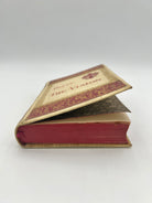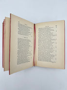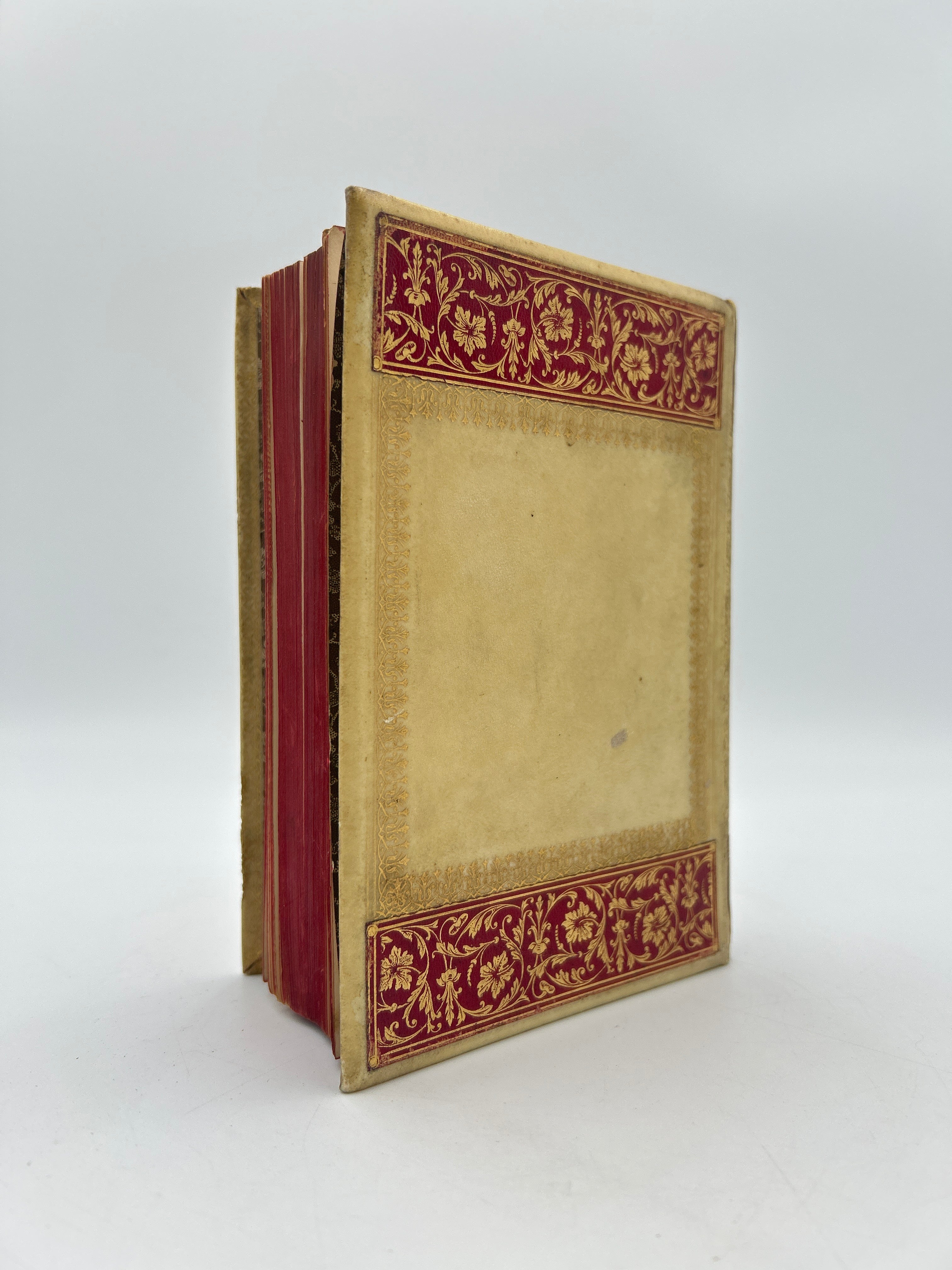 White vellum and burgundy cover with gold and red decorative vellum on front, binding, and back. Front board no longer lies flat. Red edges. Floral endpapers with gilt turn ins.