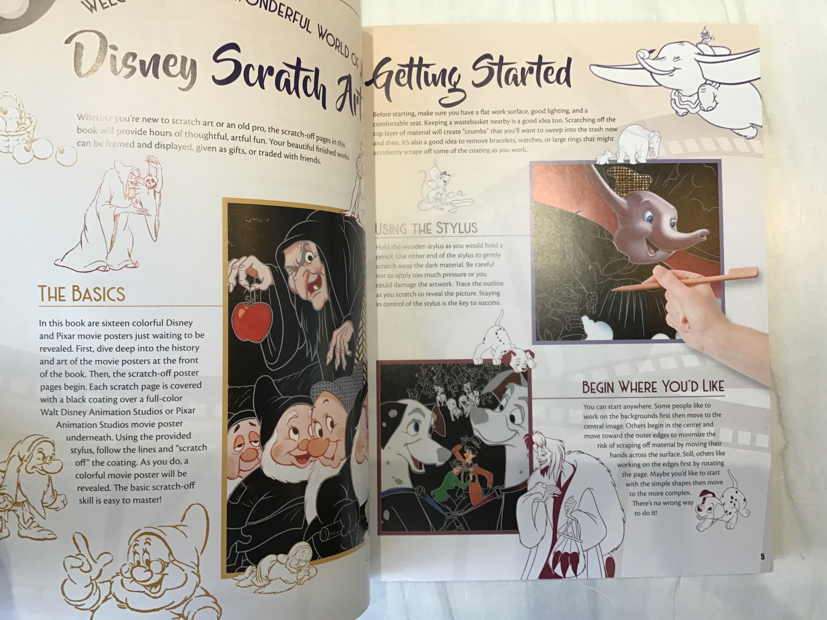 Book with 16 posters from favorite Disney and Pixar films with protective pages that feature bonus line art one can color. Stylus is also included inside to etch away the black coating. New- Reprint