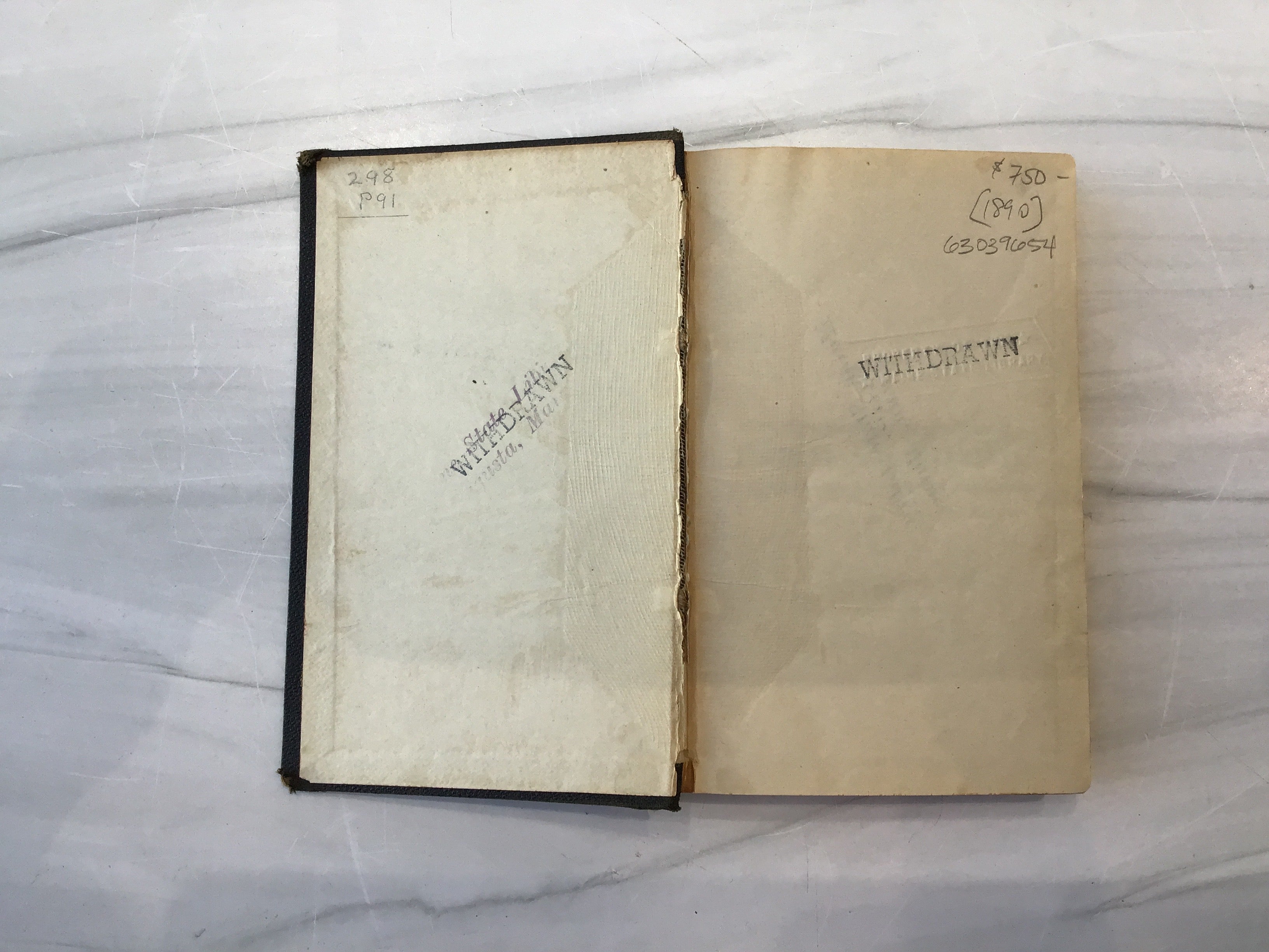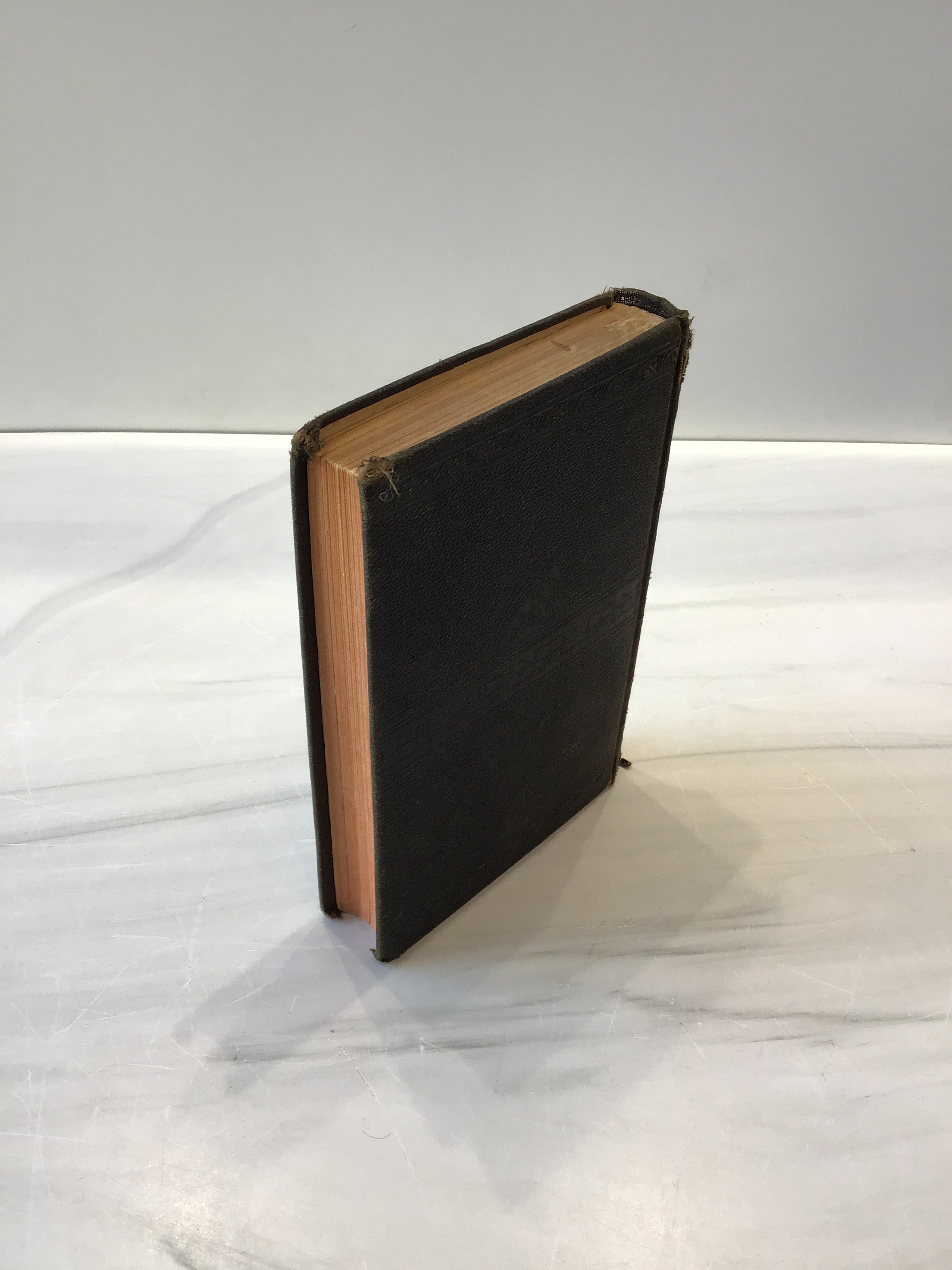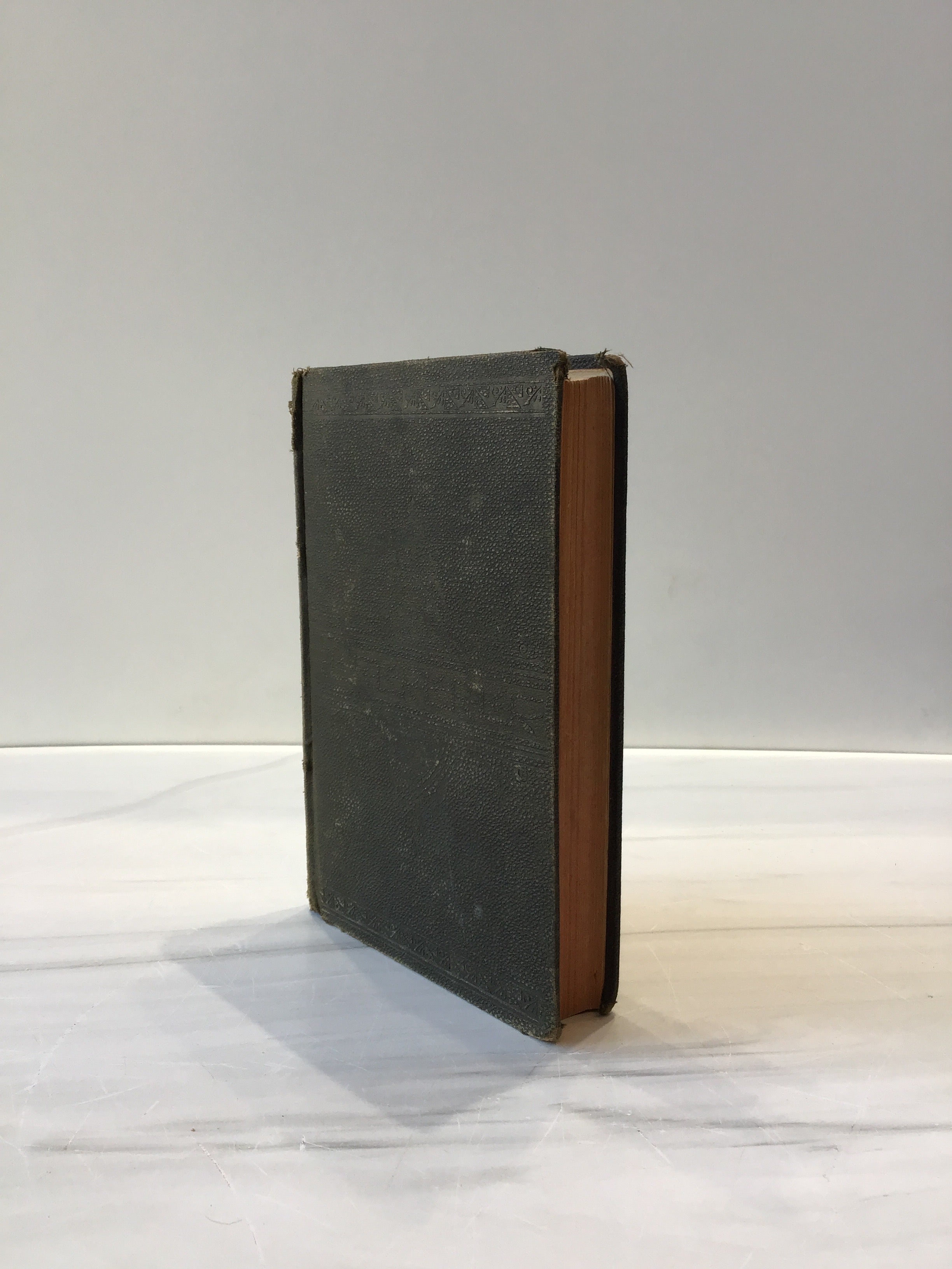 Black pebbled canvas hard back cover with embossed design on front and back cover and gold embossed lettering on the spine. About an inch long tear on upper part of the spine and fraying of canvas on top and bottom of the spine. Slight tearing and worn appearance to corners of the front and back covers. This copy belonged to Maine State Library and has a number and letter code (298P91) written in white on the spine and four withdrawn stamps impressed across the front cover and title page noting that it was removed from the library in February 14, 1900. Light red fore edge and pages 73 and 75 are uncut on the edge and have minor tearing that does not affect the integrity of the text. Fair Condition