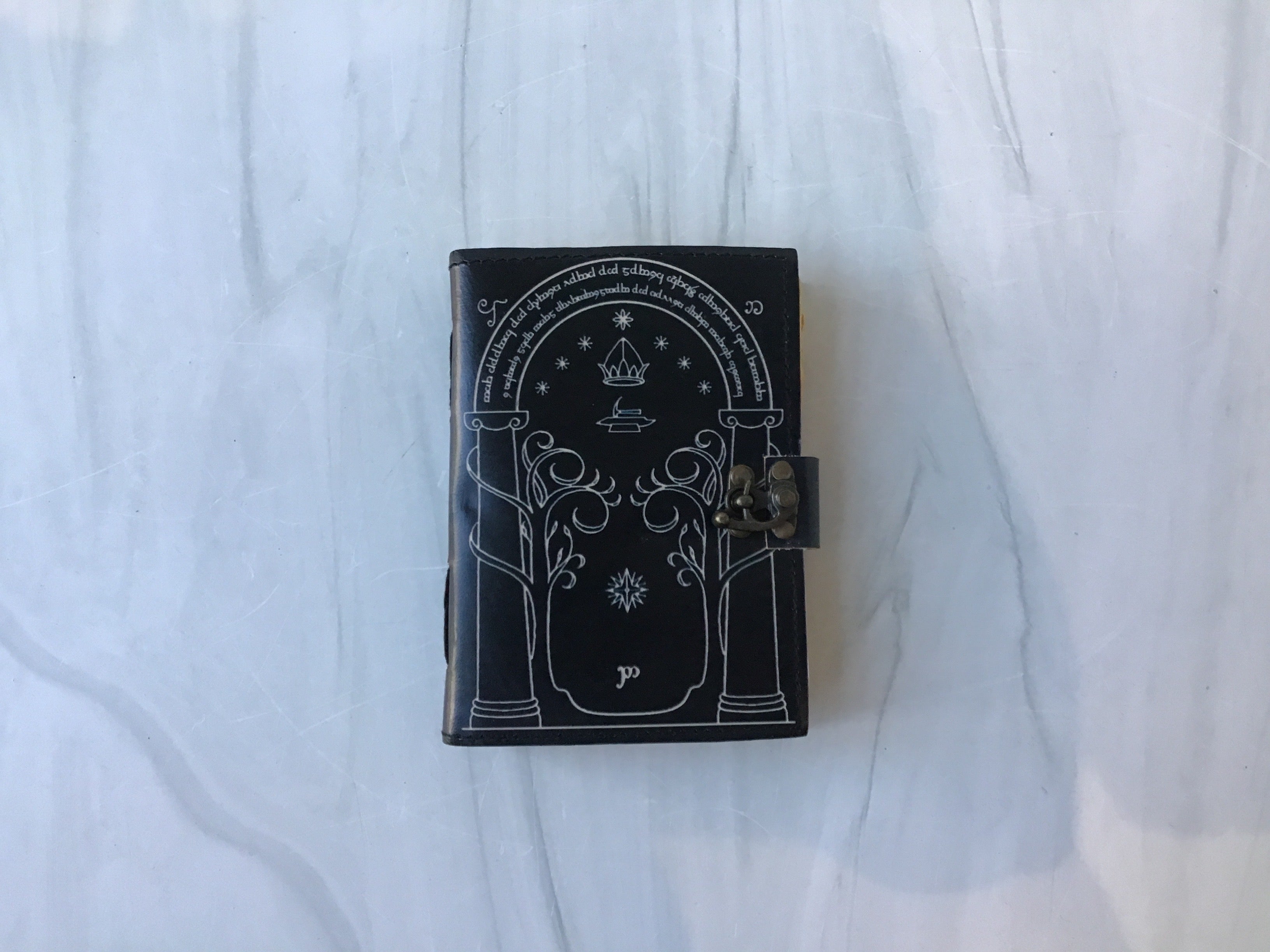 "Speak 'Friend' and enter" the Mines of Moria with this Doors of Durin journal. Document your life journeys in this beautiful antiqued black leather journal with a white illustration of the Doors of Durin, from Lord of The Rings, made with aged recycled paper. The journal also features a brass clasp closure on the front and stitching on the spine.