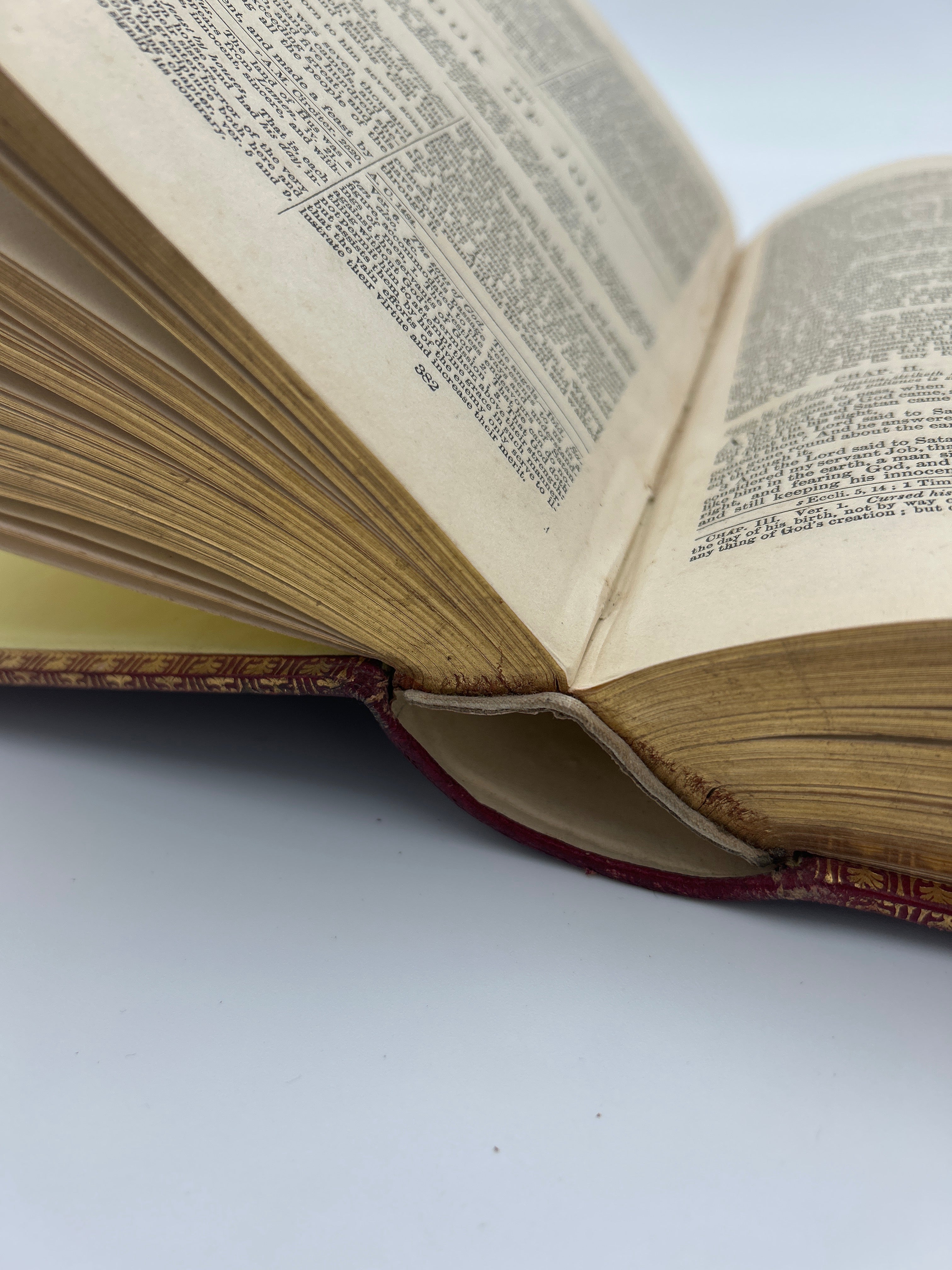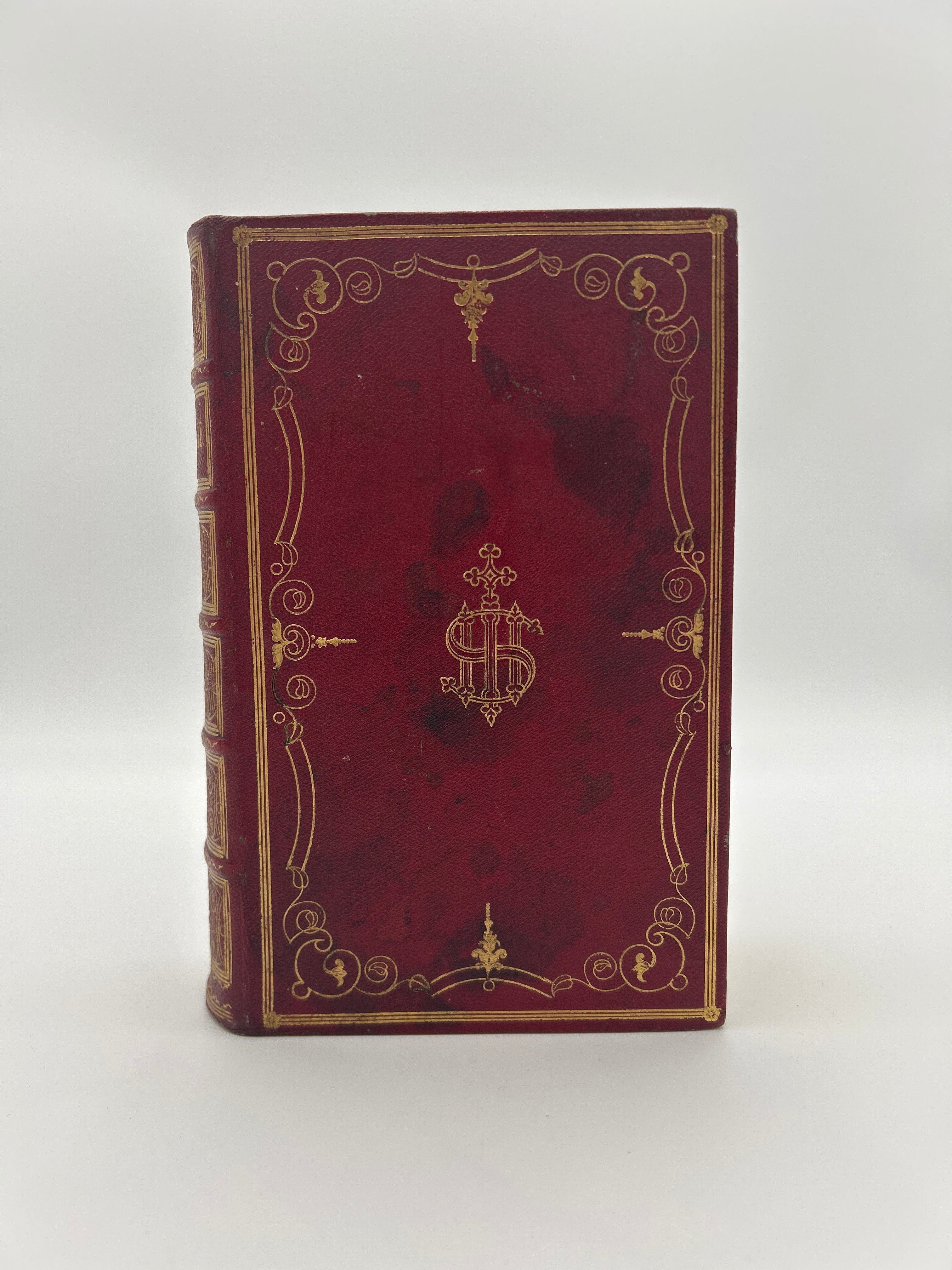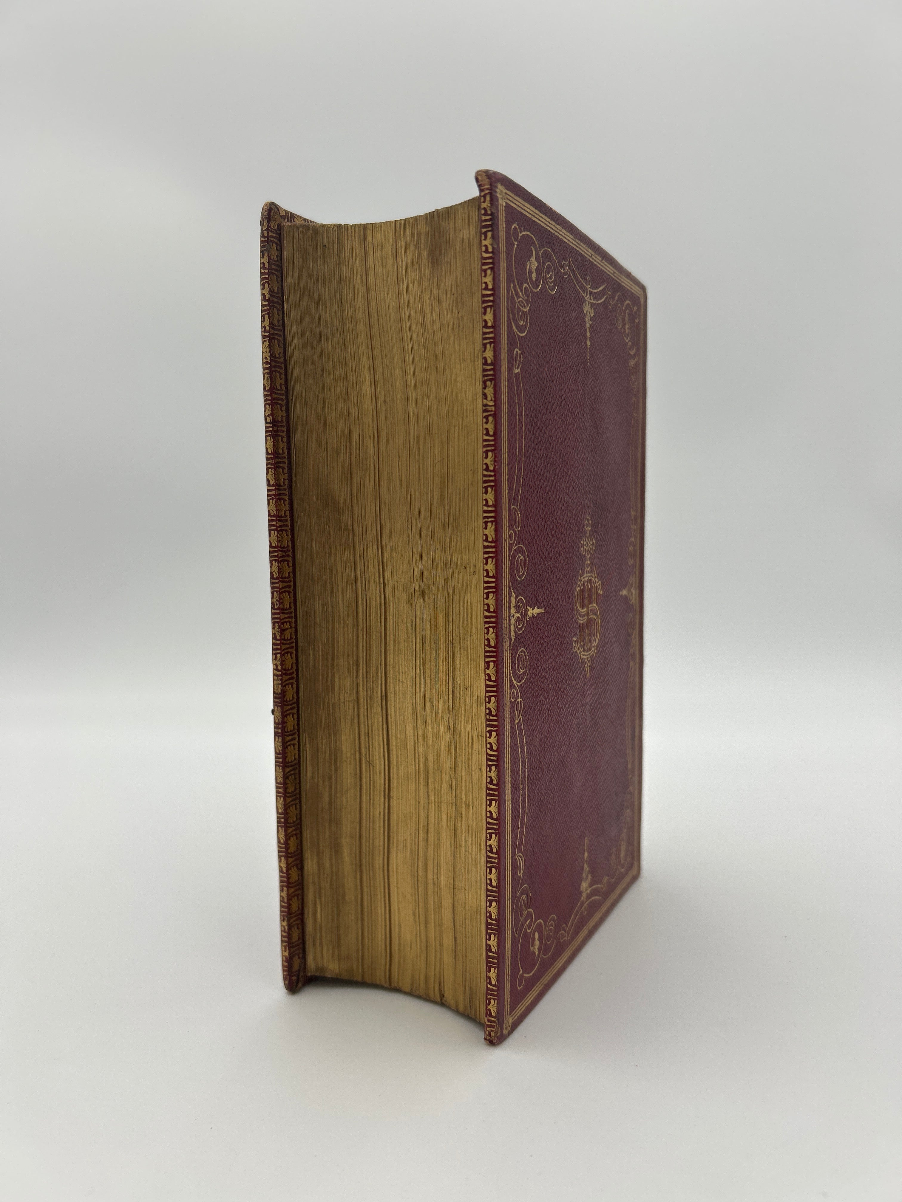 Beautiful red leather with gold embossing front, back, spine, three edge gild, excellent condition