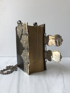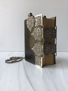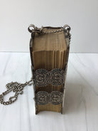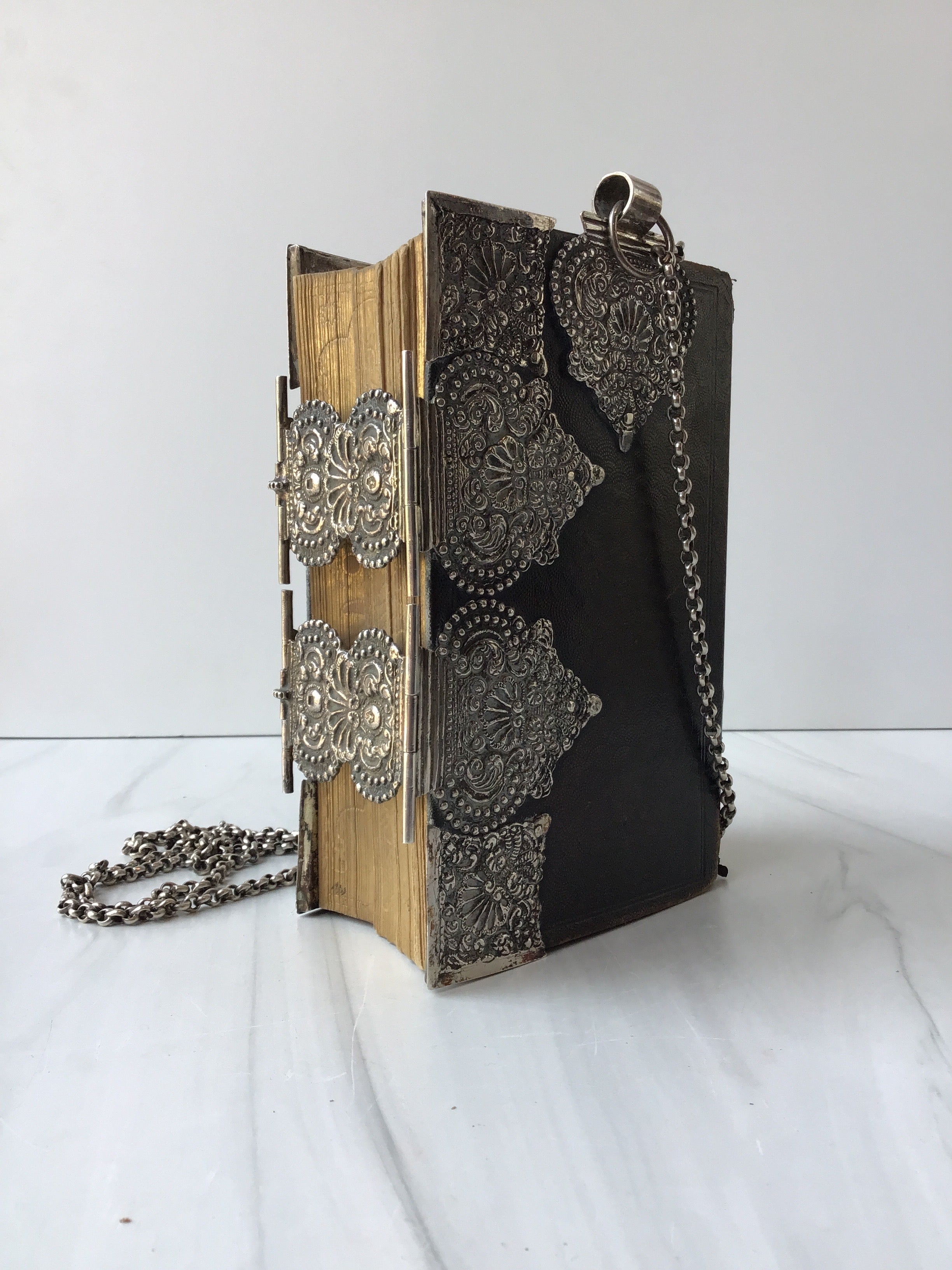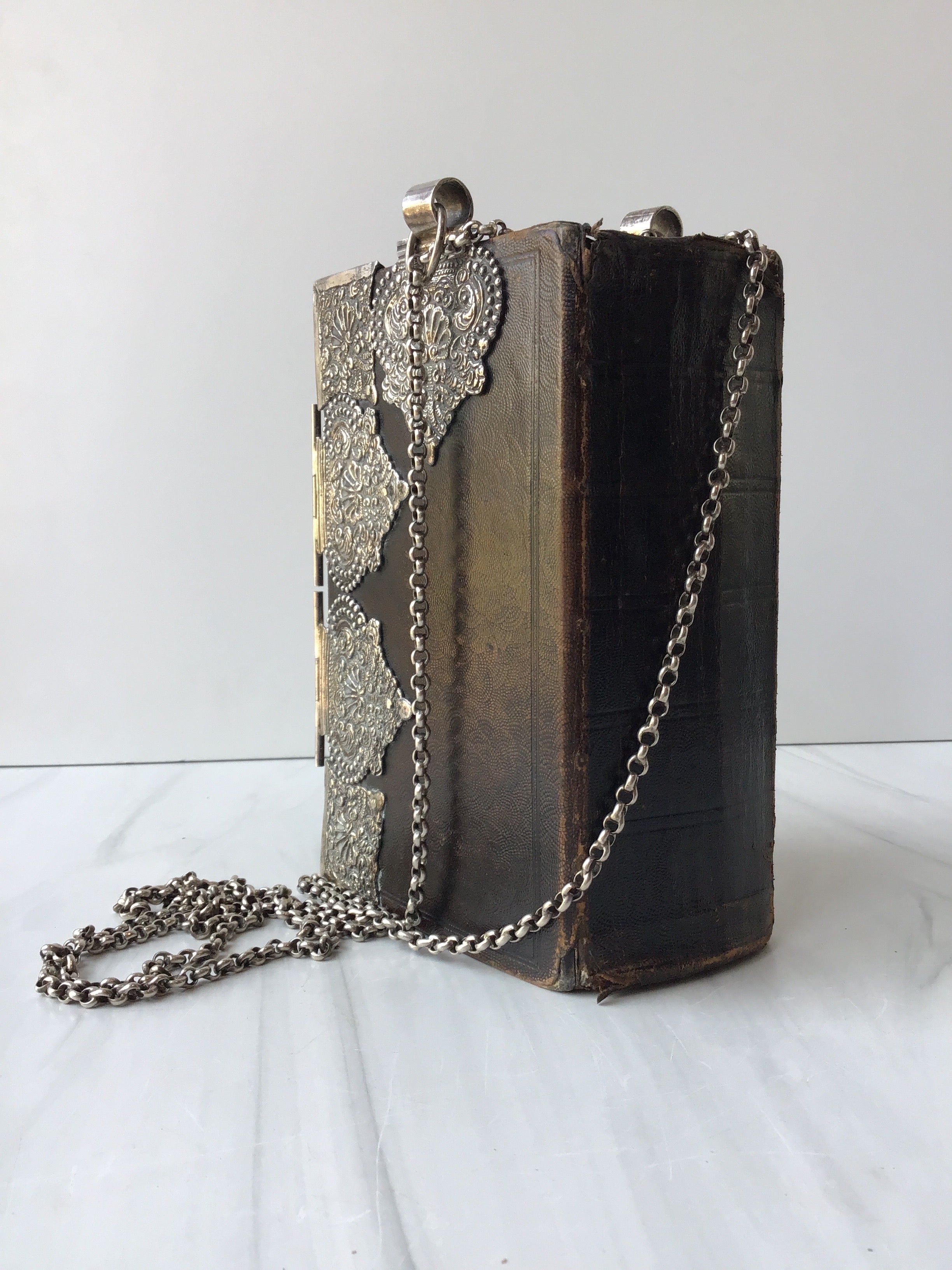 Beautiful deep brown leather with fabulous silver corner plates and bracket enclosures, chain on top meant to be carried as a purse, some rubbing on top and lower spine, intact, good condition.