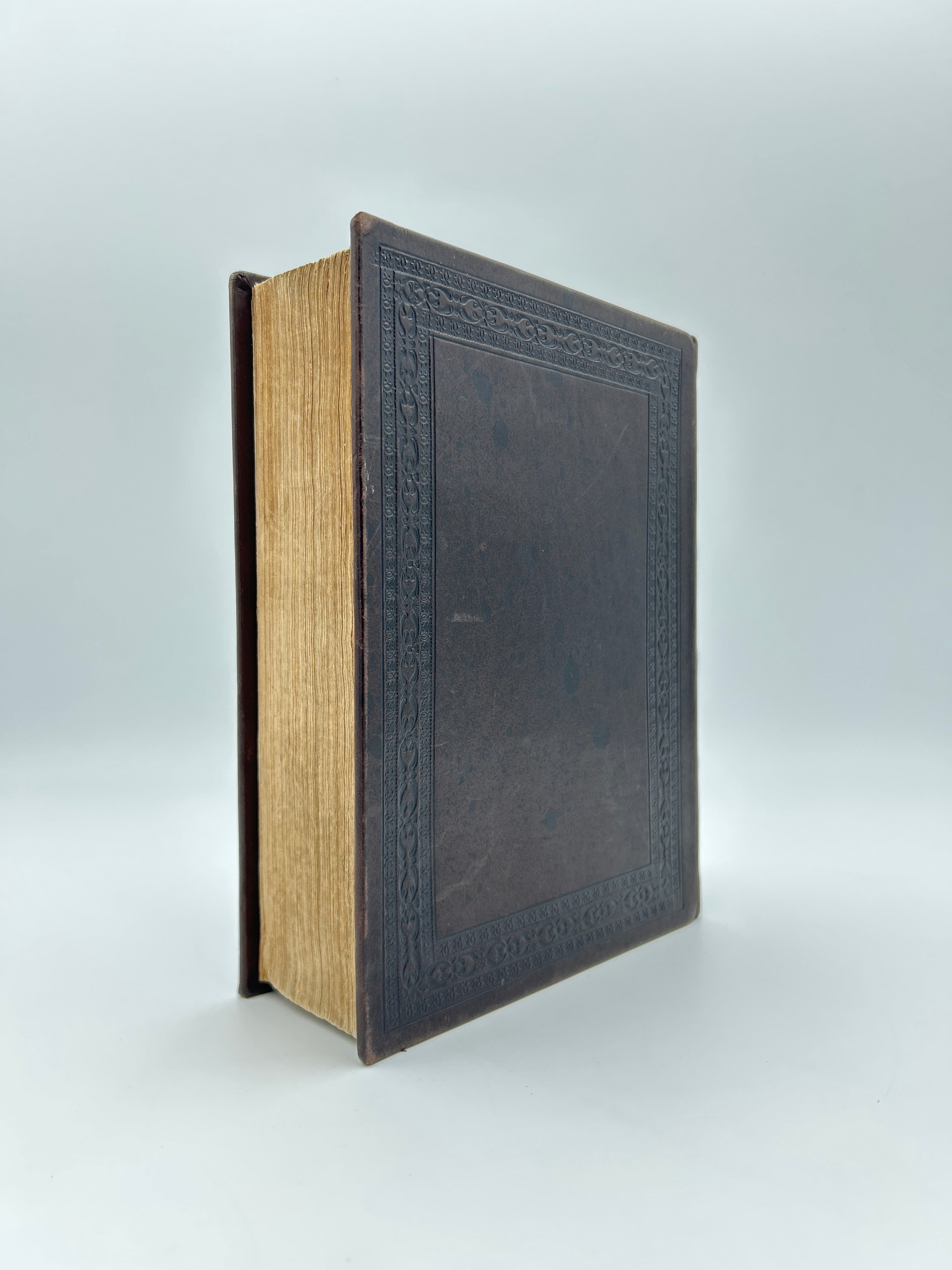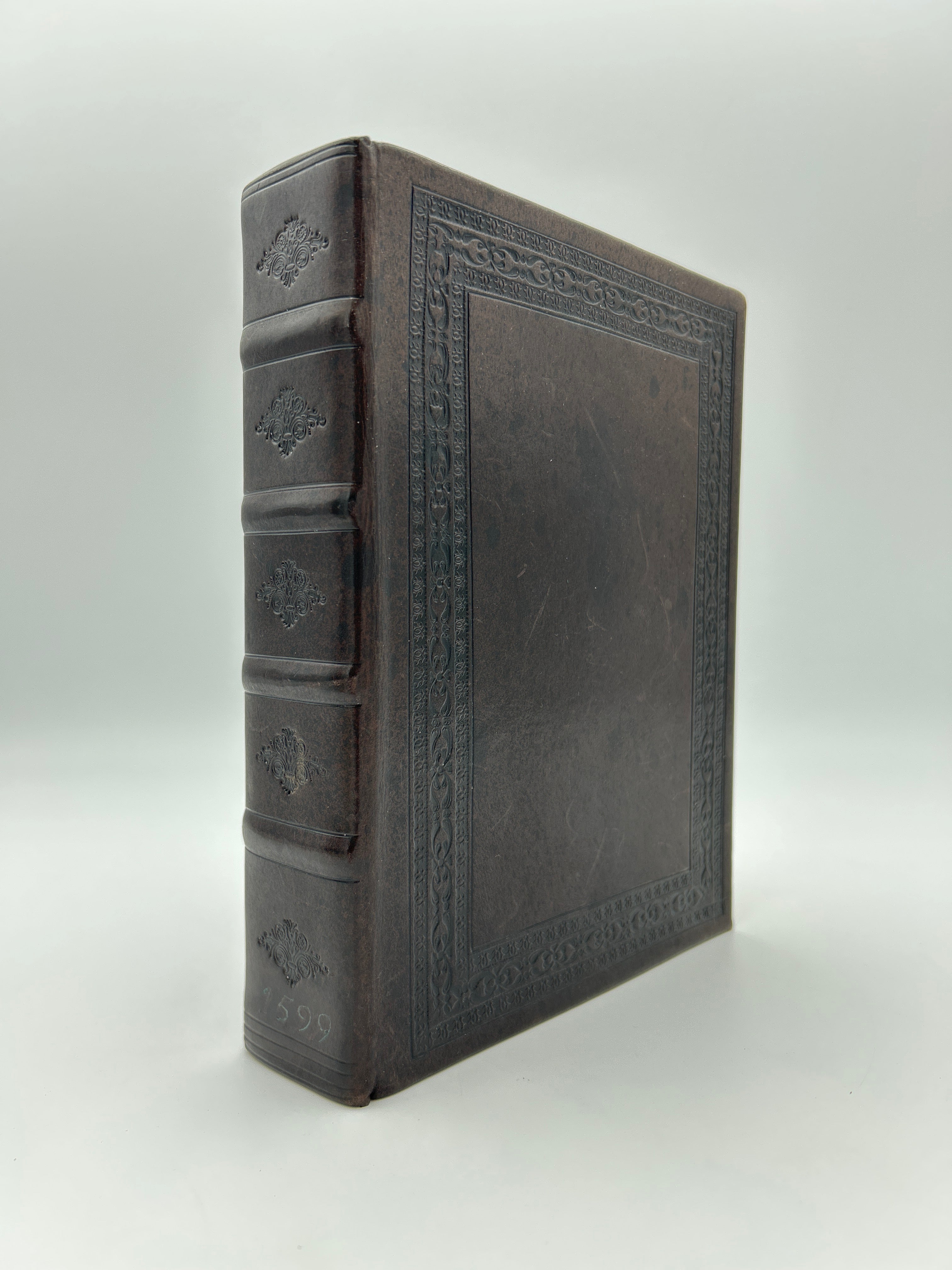 Rebound in deep brown leather. Predates King James 1611. Embossed details bordering both boards with four raised bands and embossed elements on the spine. Woodcut images throughout. Very fine condition.