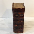 Leather bound bible, wear on front and back edges ,spine intact, debossed label on front cover, very tight