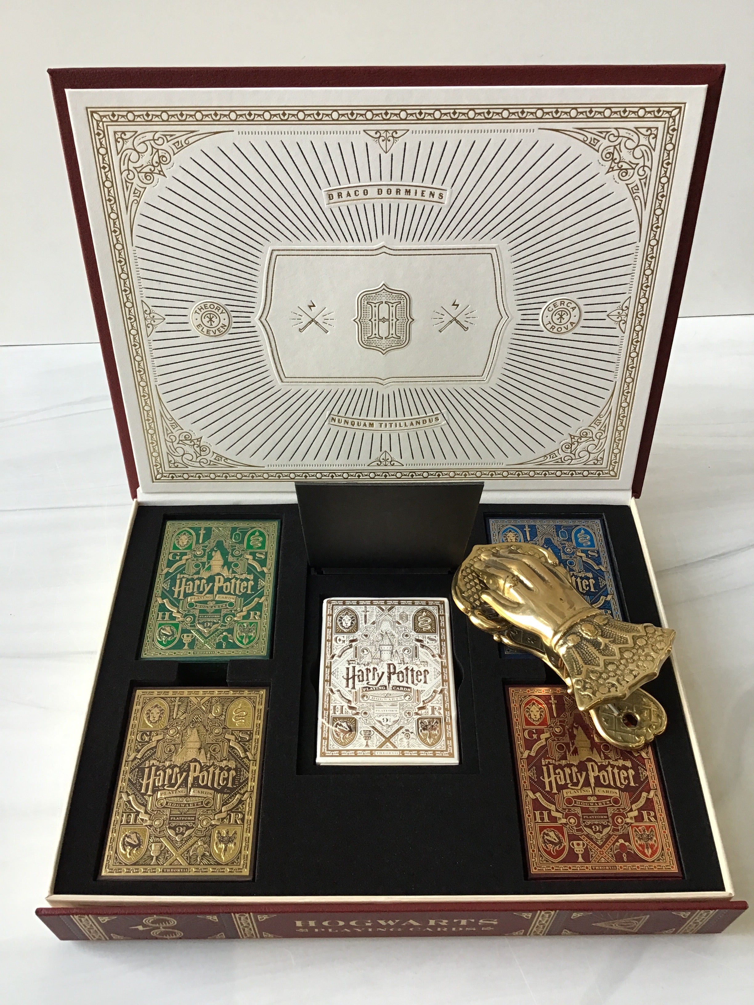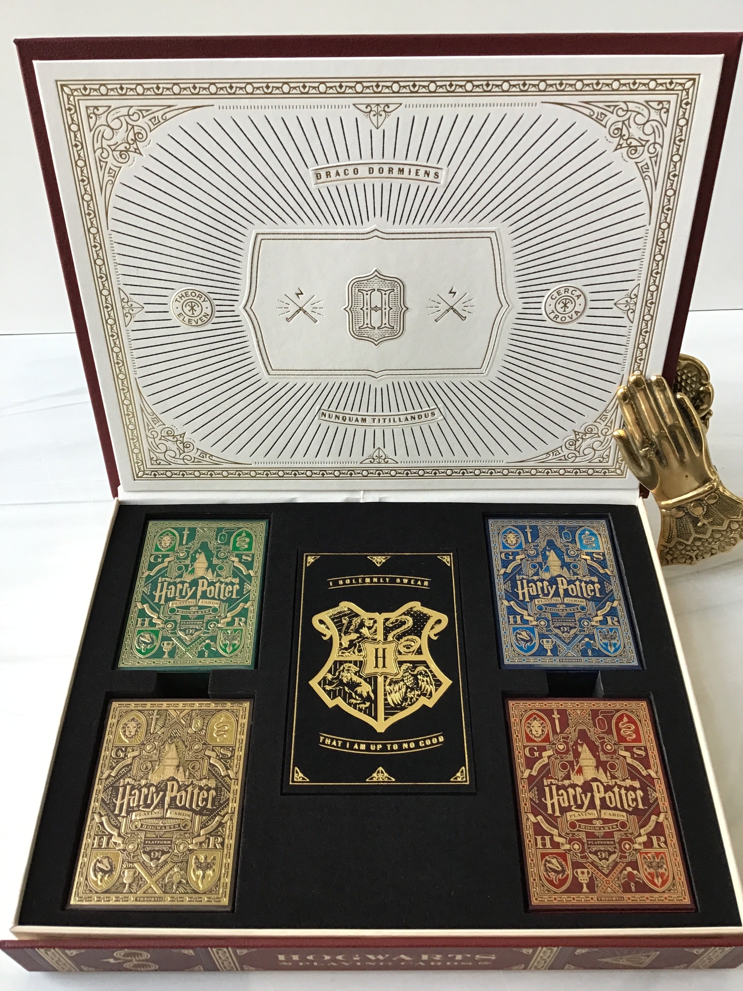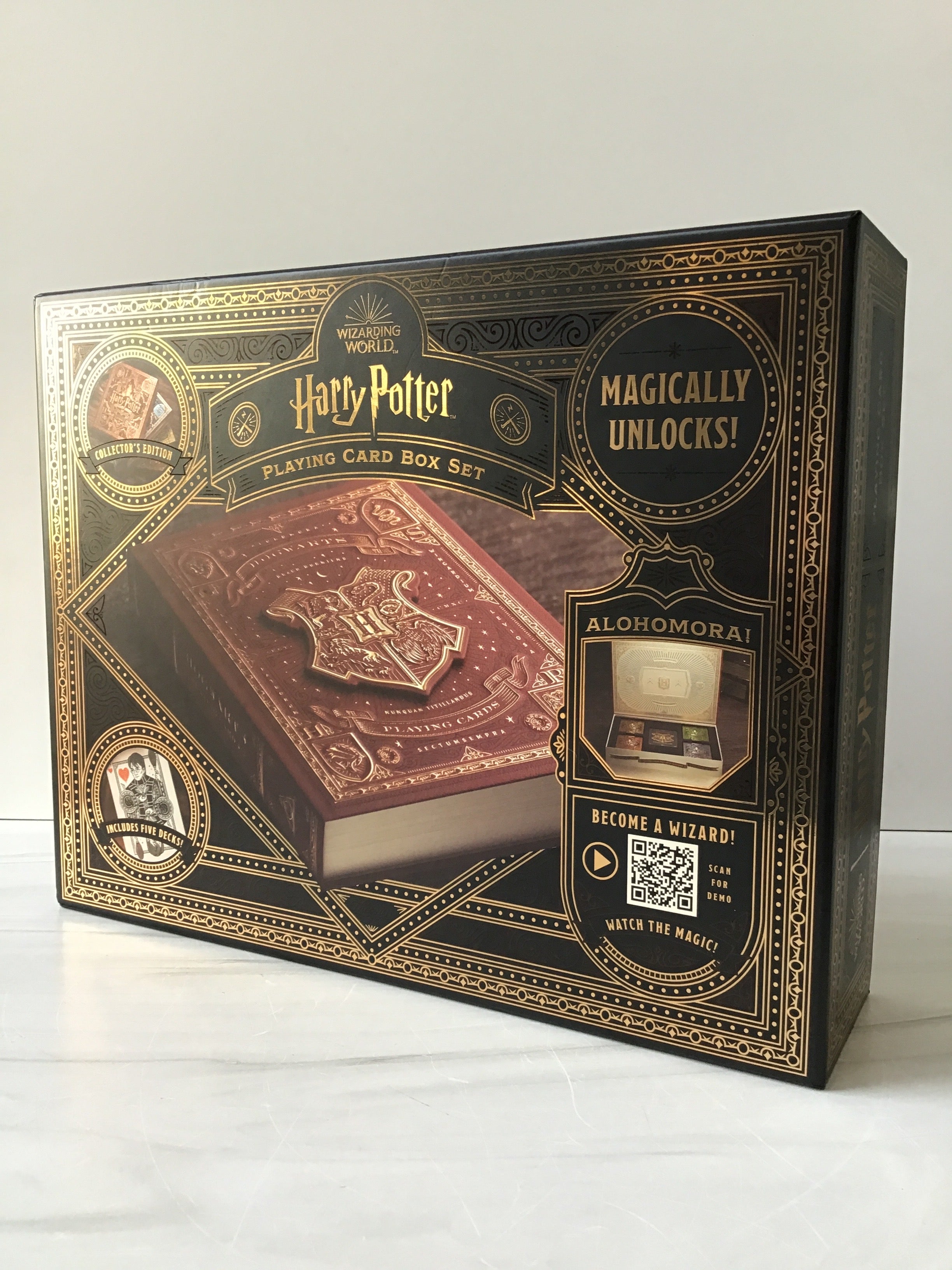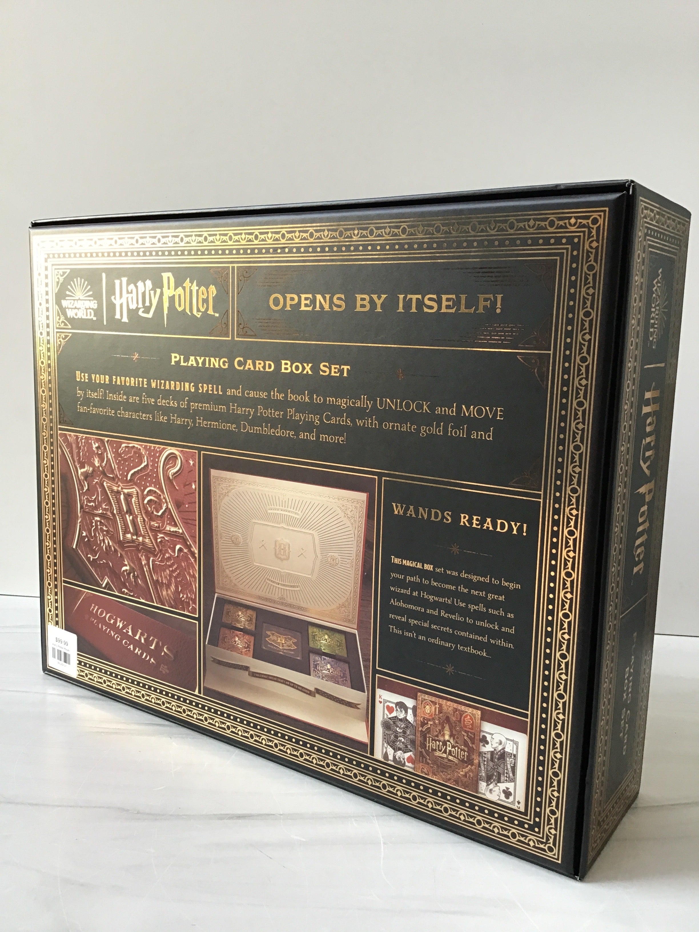 This book can open as though by magic and move by itself. Inside are five decks of premium quality playing cards with ornate gold foil and fan favorite characters like Harry, Hermione, and Dumbledore, and more! Five decks include brown, green, red, blue, and a special edition white with rose gold foil. Ensure you watch the video linked for directions on how to operate properly.