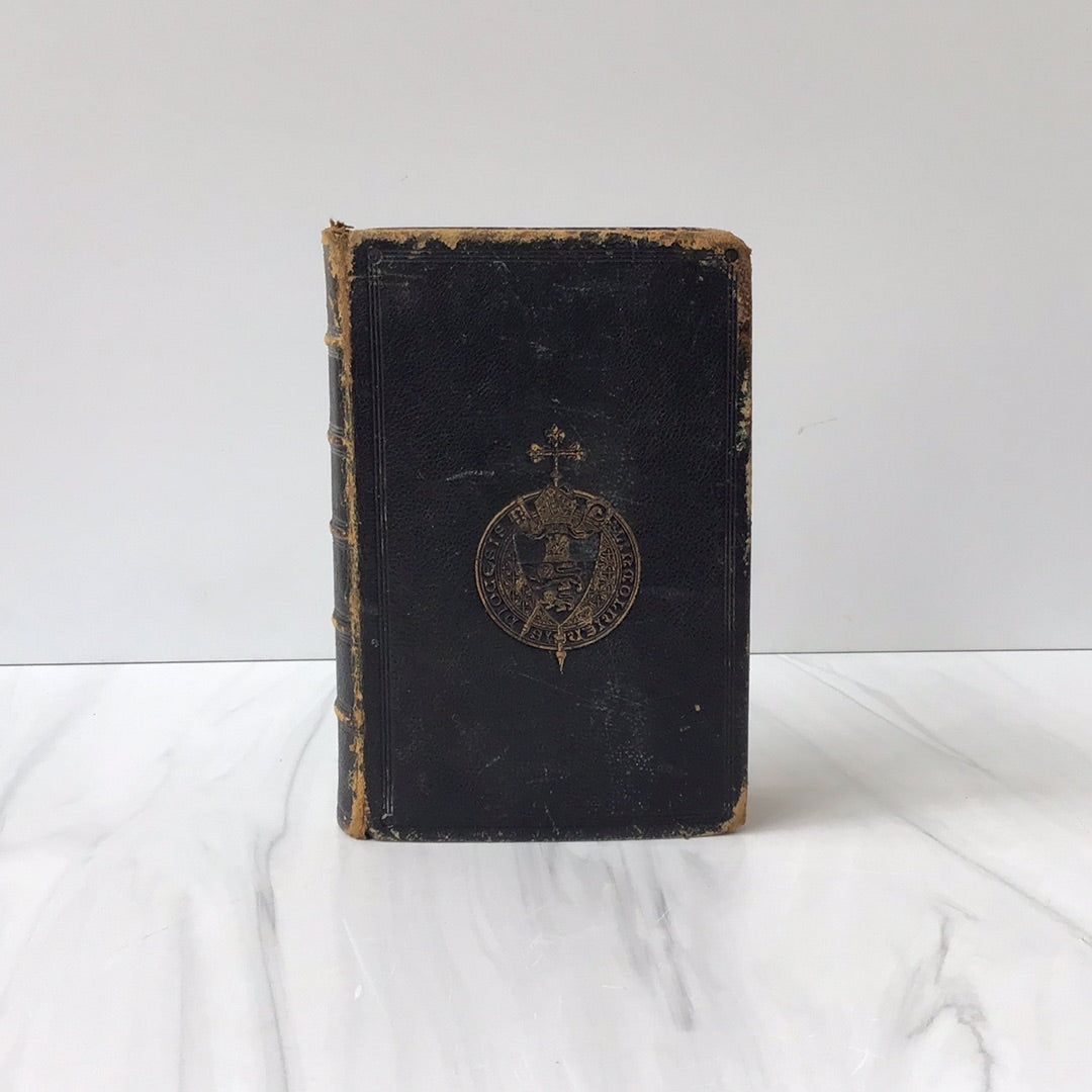 Pocket size black leather bible, gold embossing on front and spine, five raised bands, rubbing on all four corners, very slight detaching on inside cover