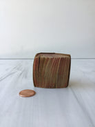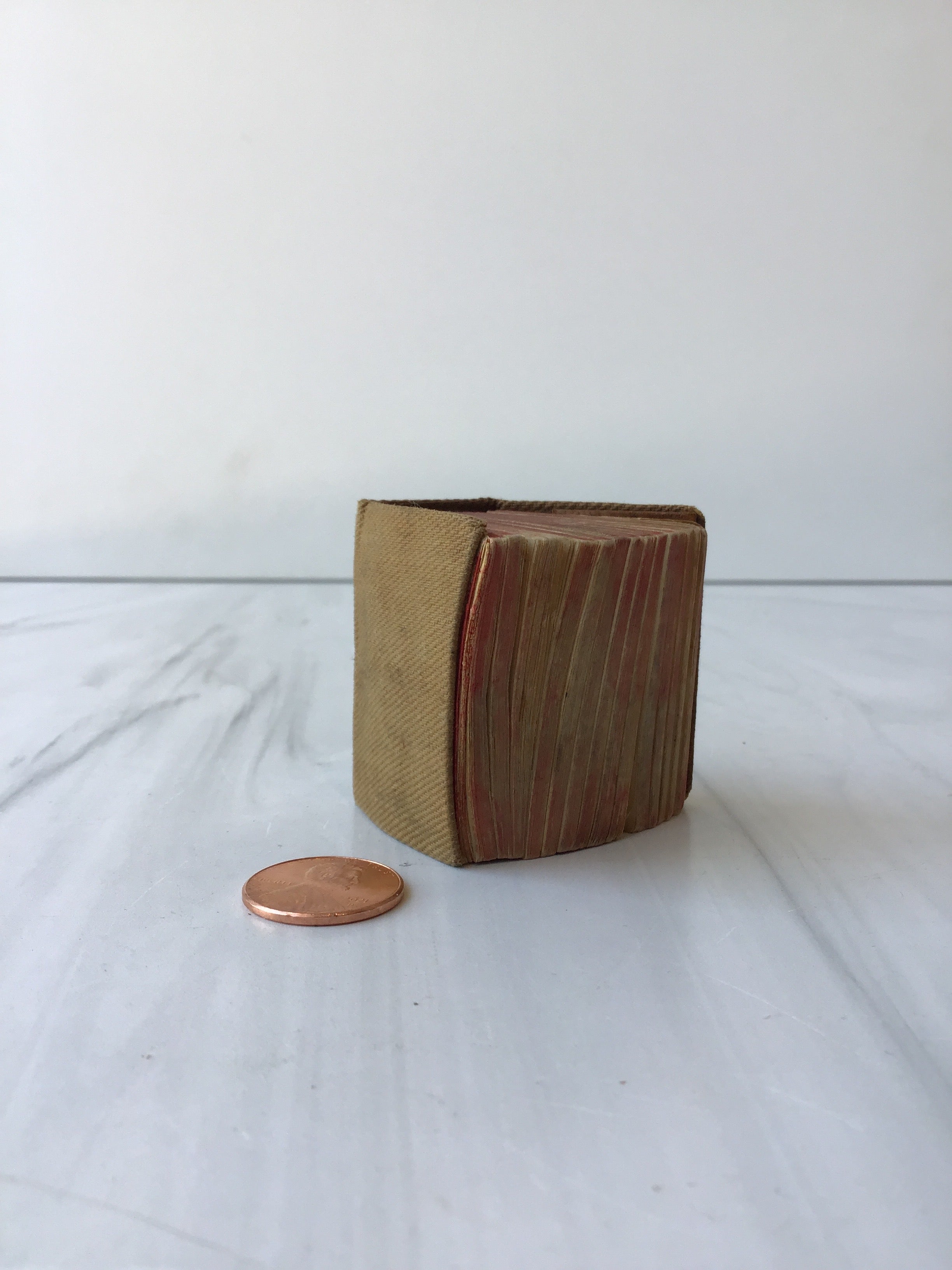 Charming miniature bible, red three edge, light brown fabric binding, gold tooling on spine, some swelling on binding, intact, good condition.