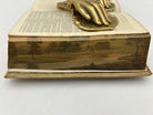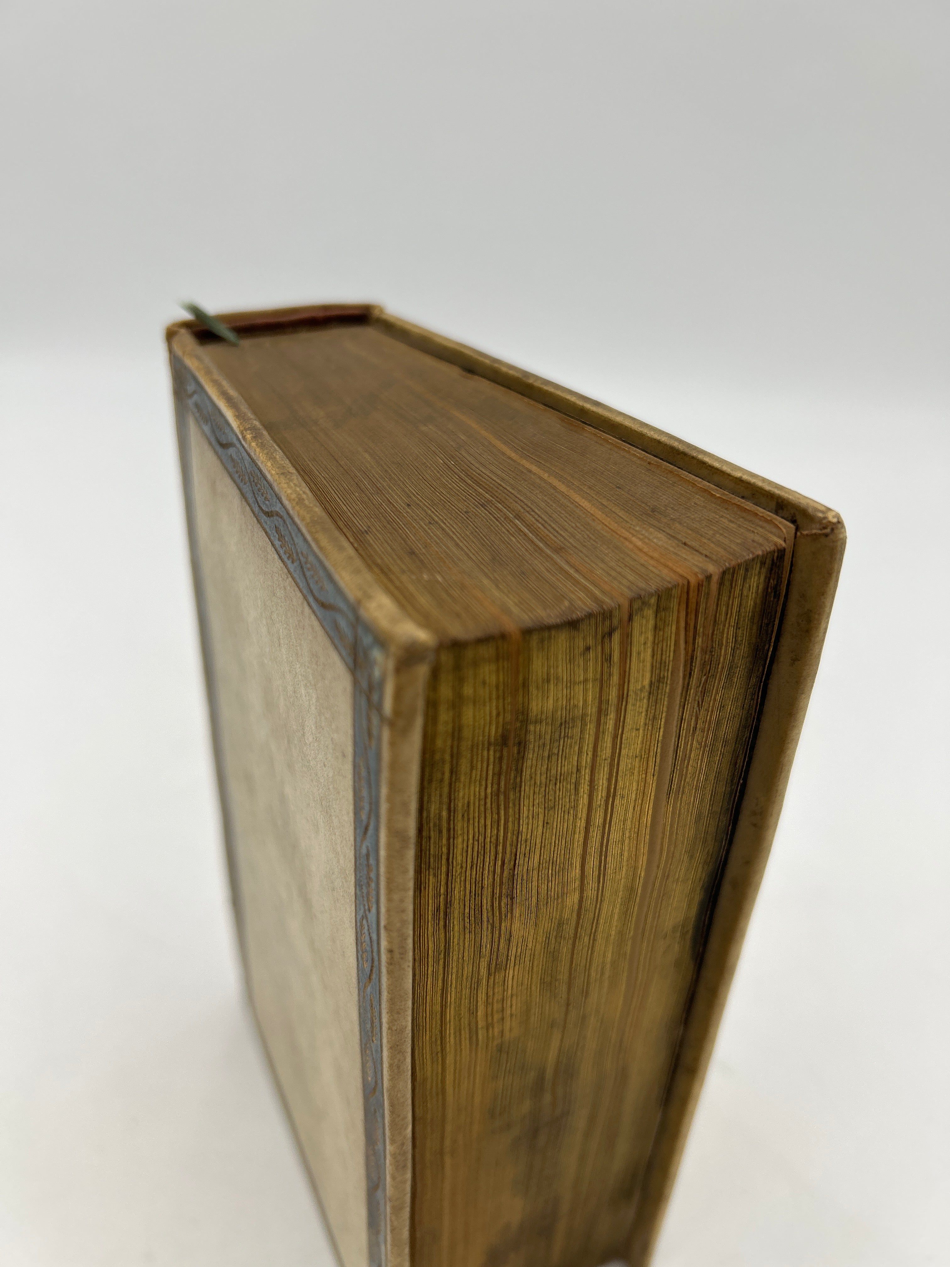 Fore-edge paintings are a distinctive form of book decoration in which an image is painted on the outer edges of a book’s pages, usually hidden when the book is closed and revealed only when the pages are fanned. Originating in the 17th century and becoming especially popular in England during the 18th and early 19th centuries, these paintings often depicted landscapes, biblical scenes, heraldry, or scenes related to the book’s contents. The technique required great skill, as the artwork was applied in watercolor to the fanned pages and then gilded or marbled over, concealing the image. Fore-edge paintings combined craftsmanship, artistry, and surprise, transforming books—frequently Bibles or devotional works—into both functional texts and collectible art objects.