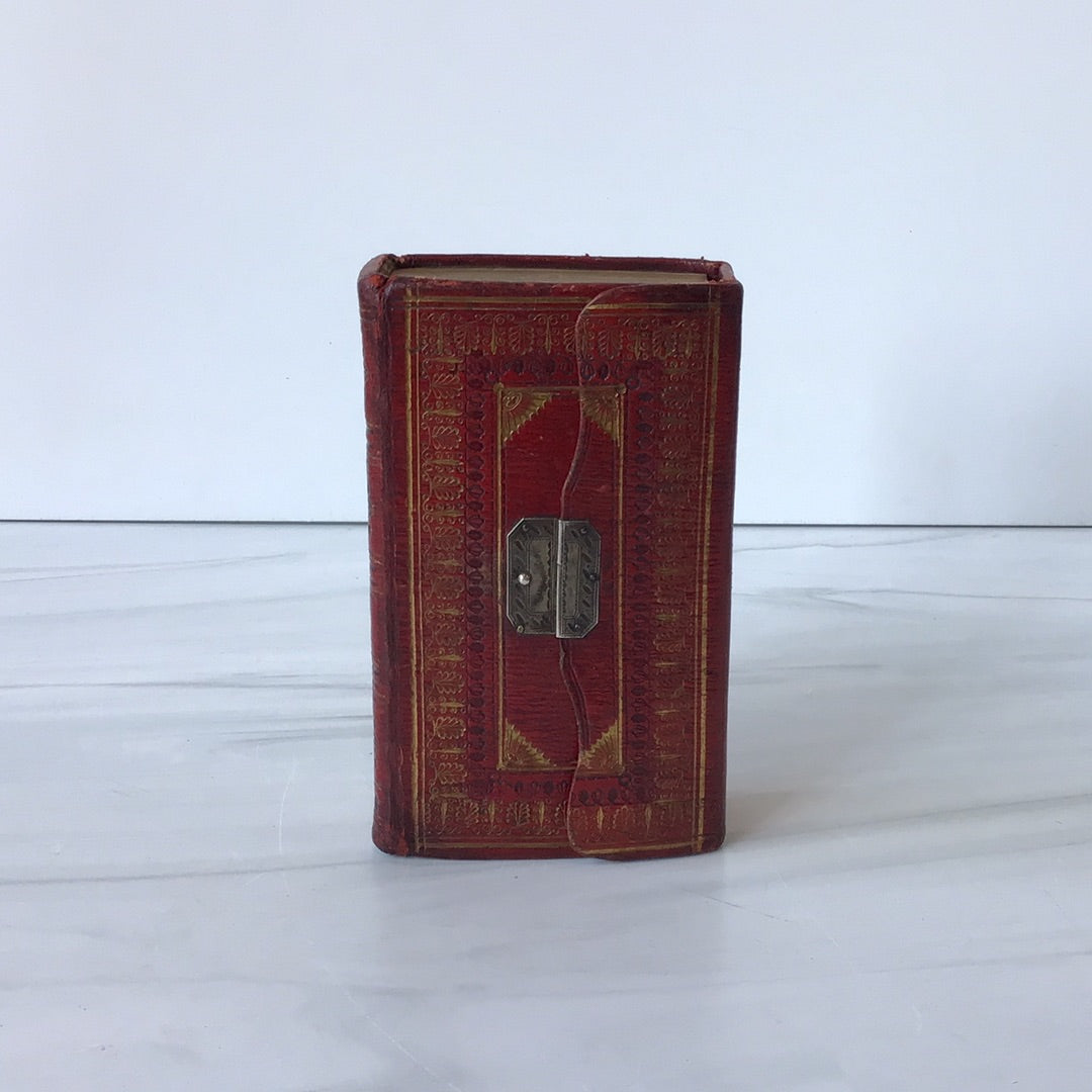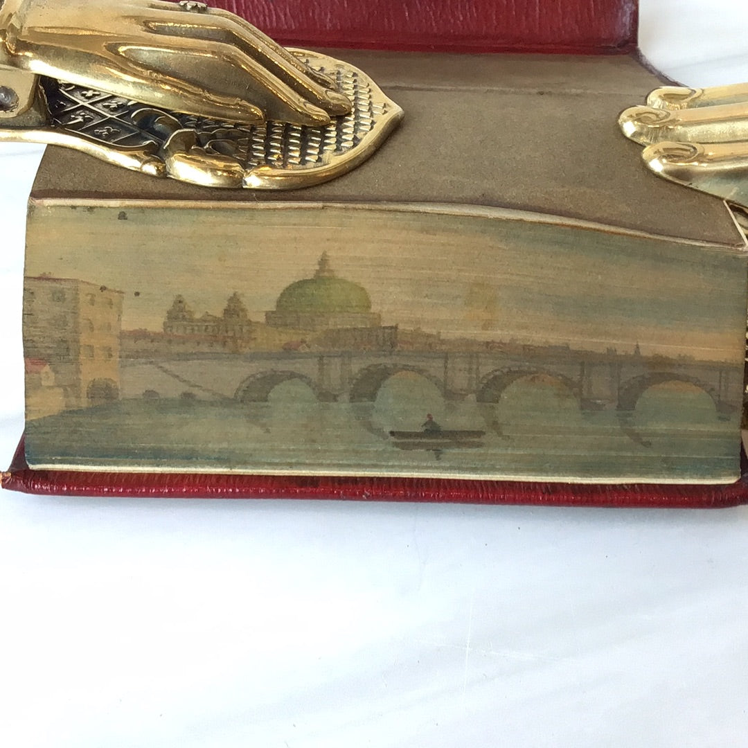 Beautiful red leather, gold embossed front, back and spine, gold clasp enclosure, three edge gold gilding, fore-edge painting of bridge with green domed building behind and boat in water.pristine condition, some writing on front blank paper in pencil, clasp in good condition