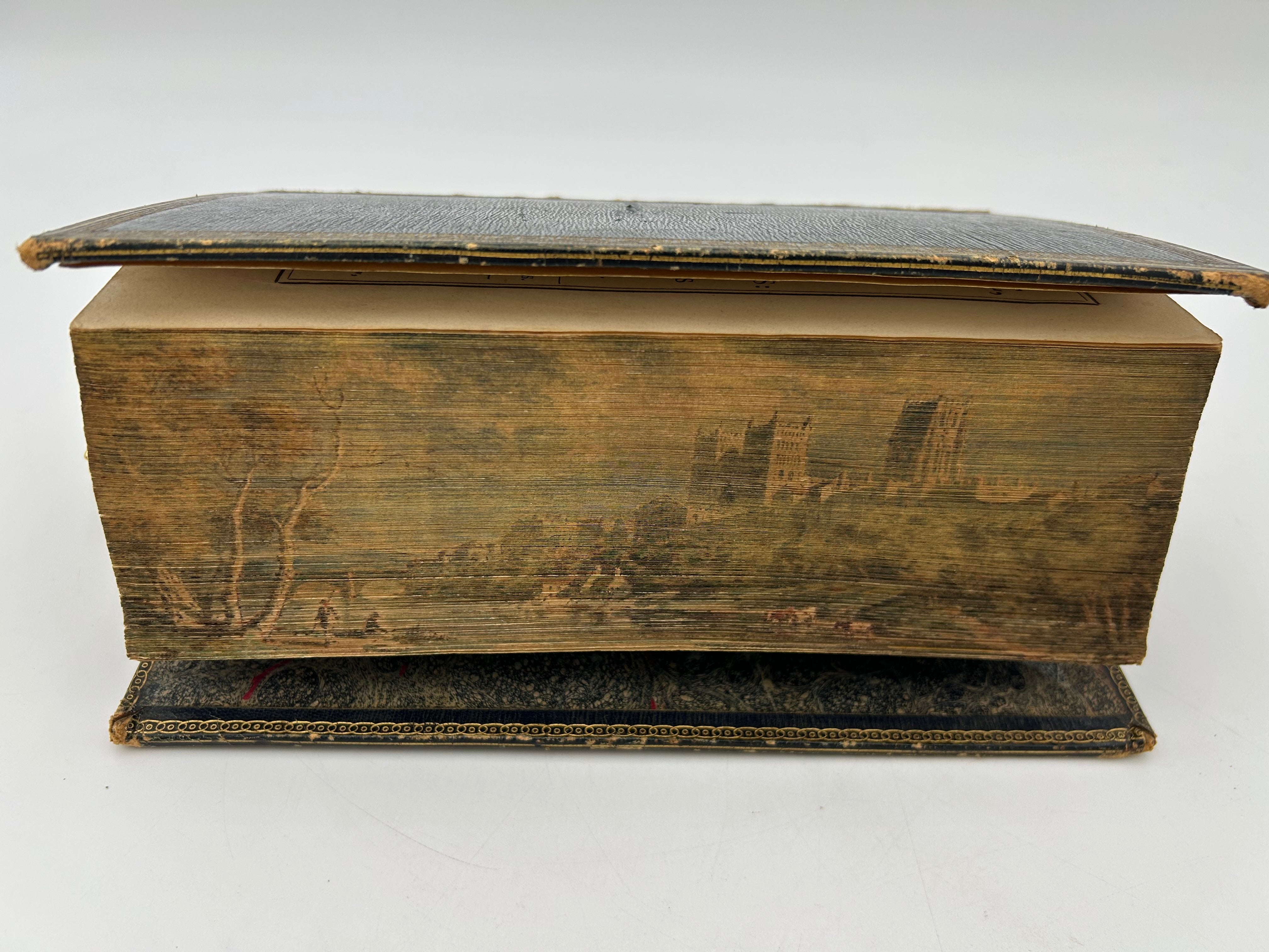 Fore-edge paintings are a unique form of book art in which a scene or image is painted on the edges of a book’s pages on the fanned edge, so that the painting is invisible when the book is closed and only revealed when the pages are fanned. This decorative technique became popular in Europe from the 17th century onward, particularly in England, and was often used to personalize or embellish prized books. Bibles sometimes featured landscape scenes, biblical narratives, or symbolic imagery on their fore-edges, allowing readers to see a visual representation of sacred stories or places while keeping the text itself intact. Landscape paintings, in particular, were chosen to represent the area in which the book was printed or to evoke the settings of biblical events—such as the Garden of Eden, Jerusalem, or pastoral scenes associated with psalms—enhancing devotional engagement and turning the Bible into not only a spiritual guide but also an object of aesthetic beauty and craftsmanship.