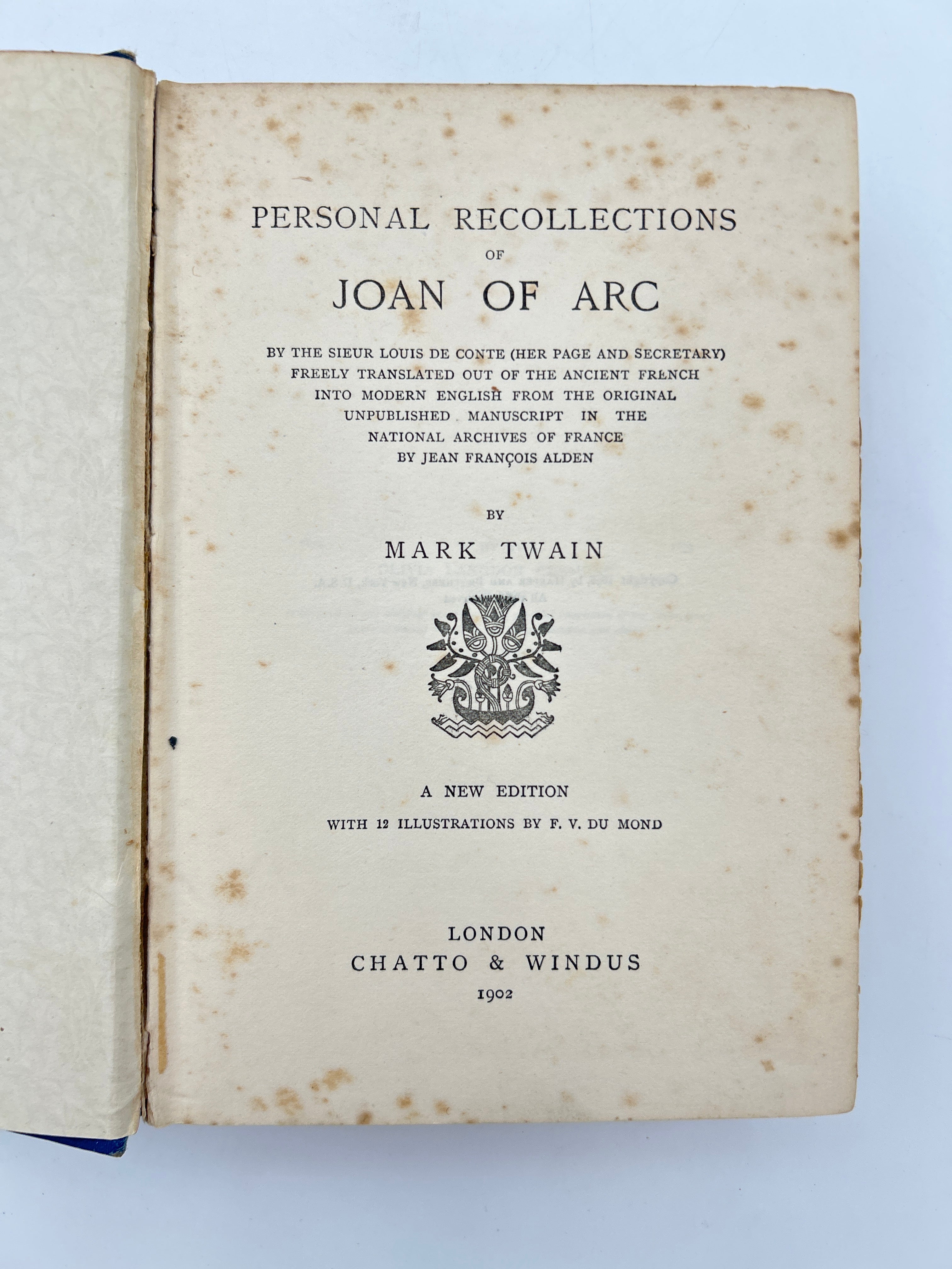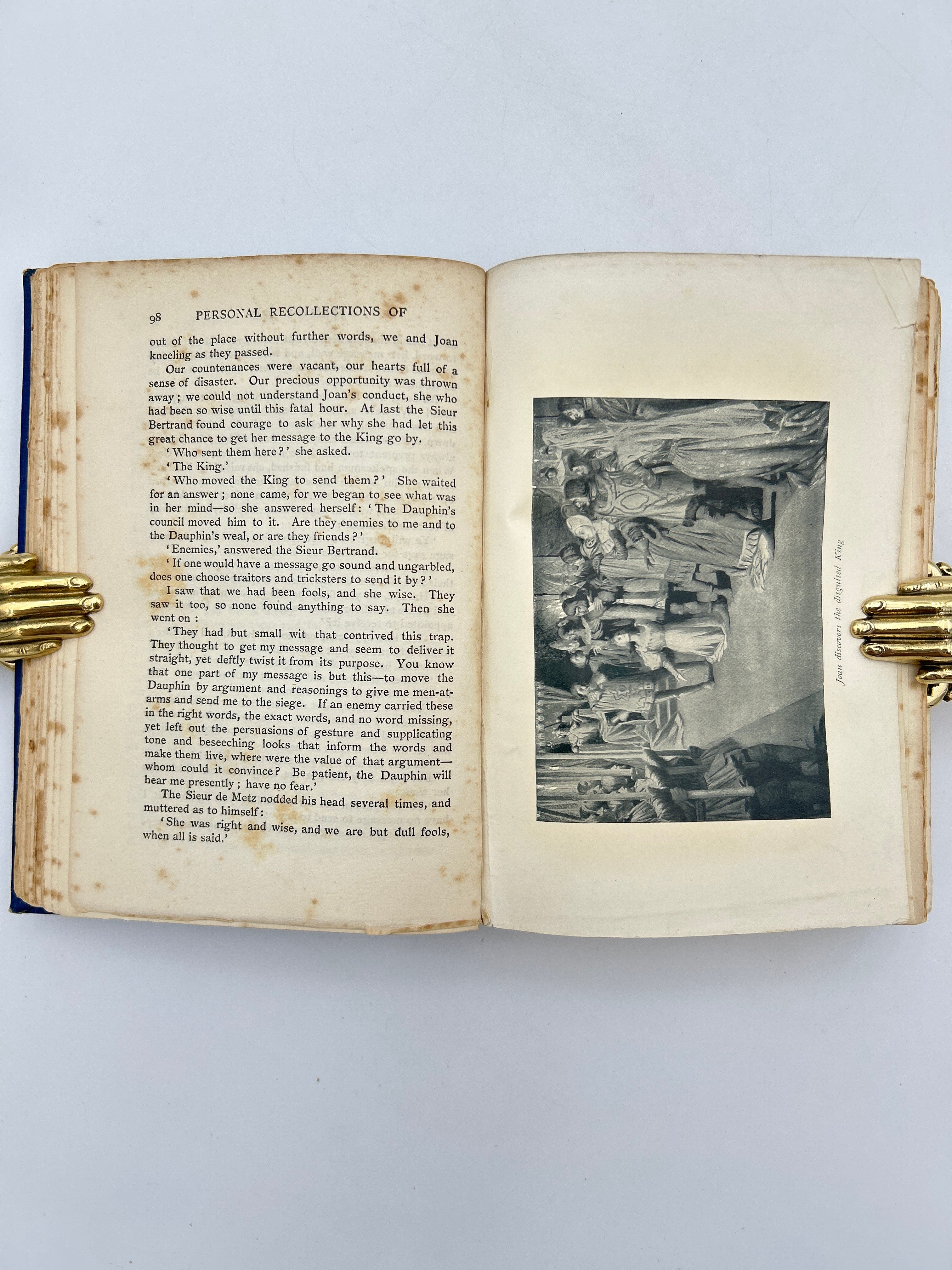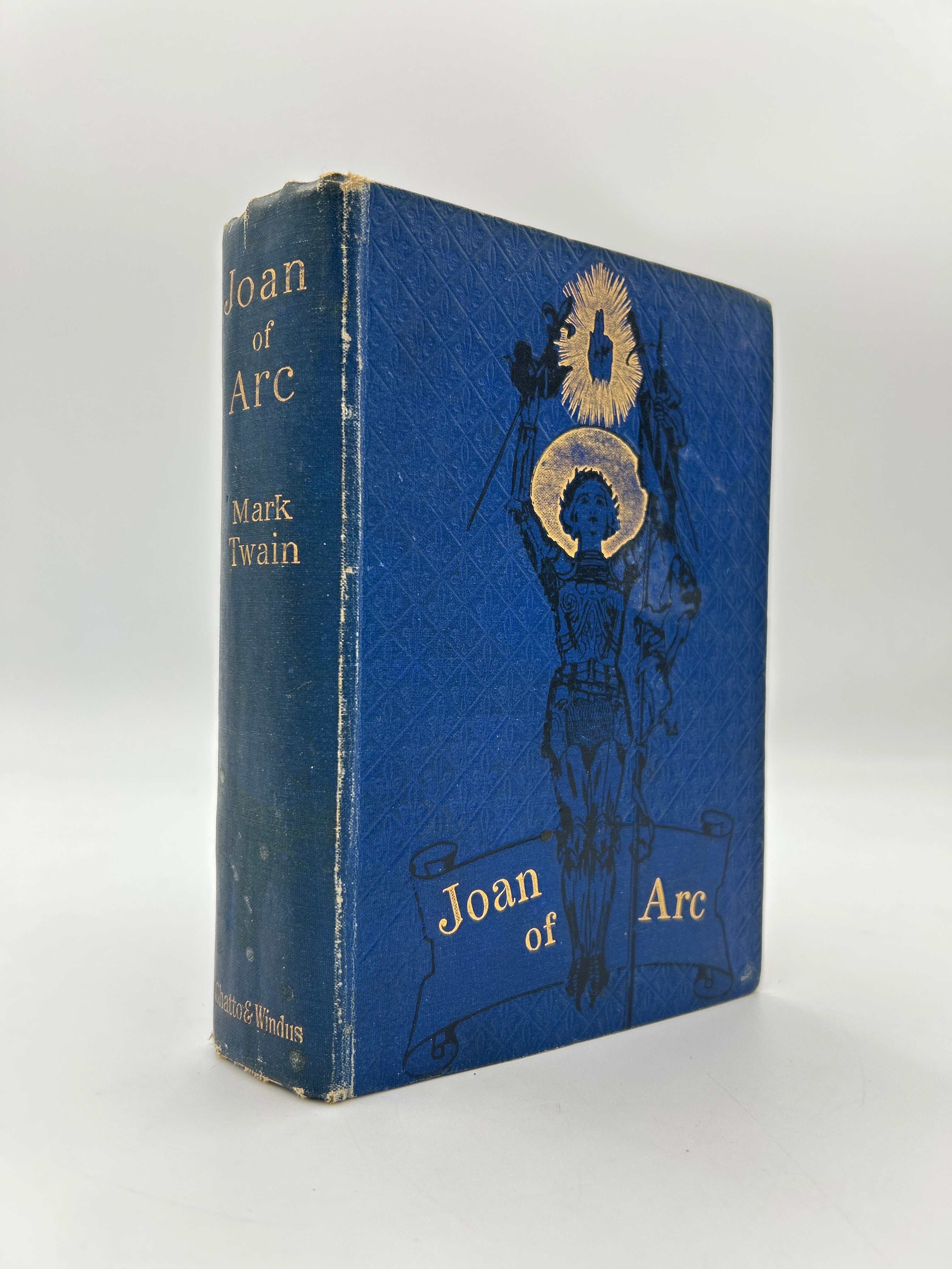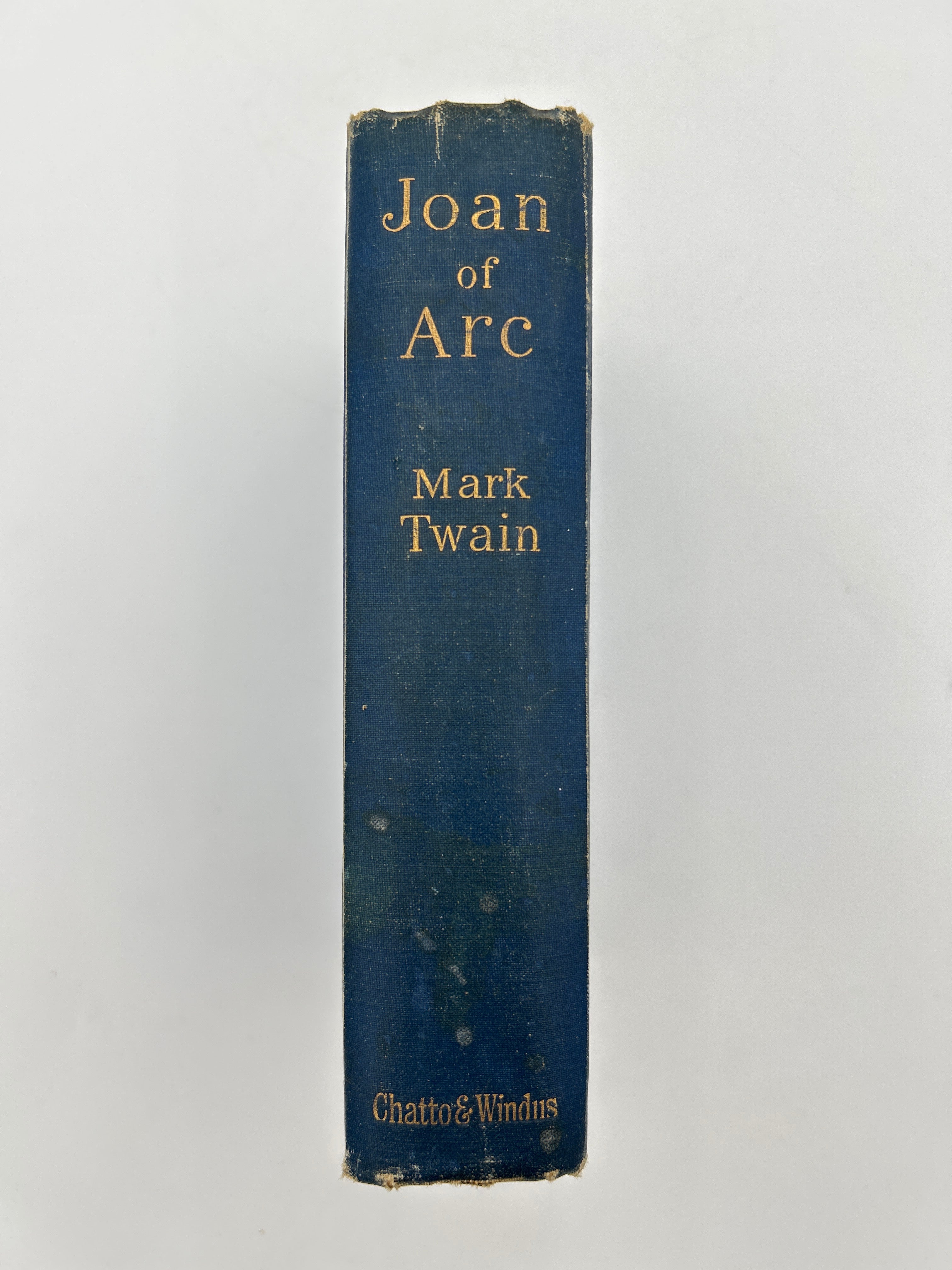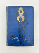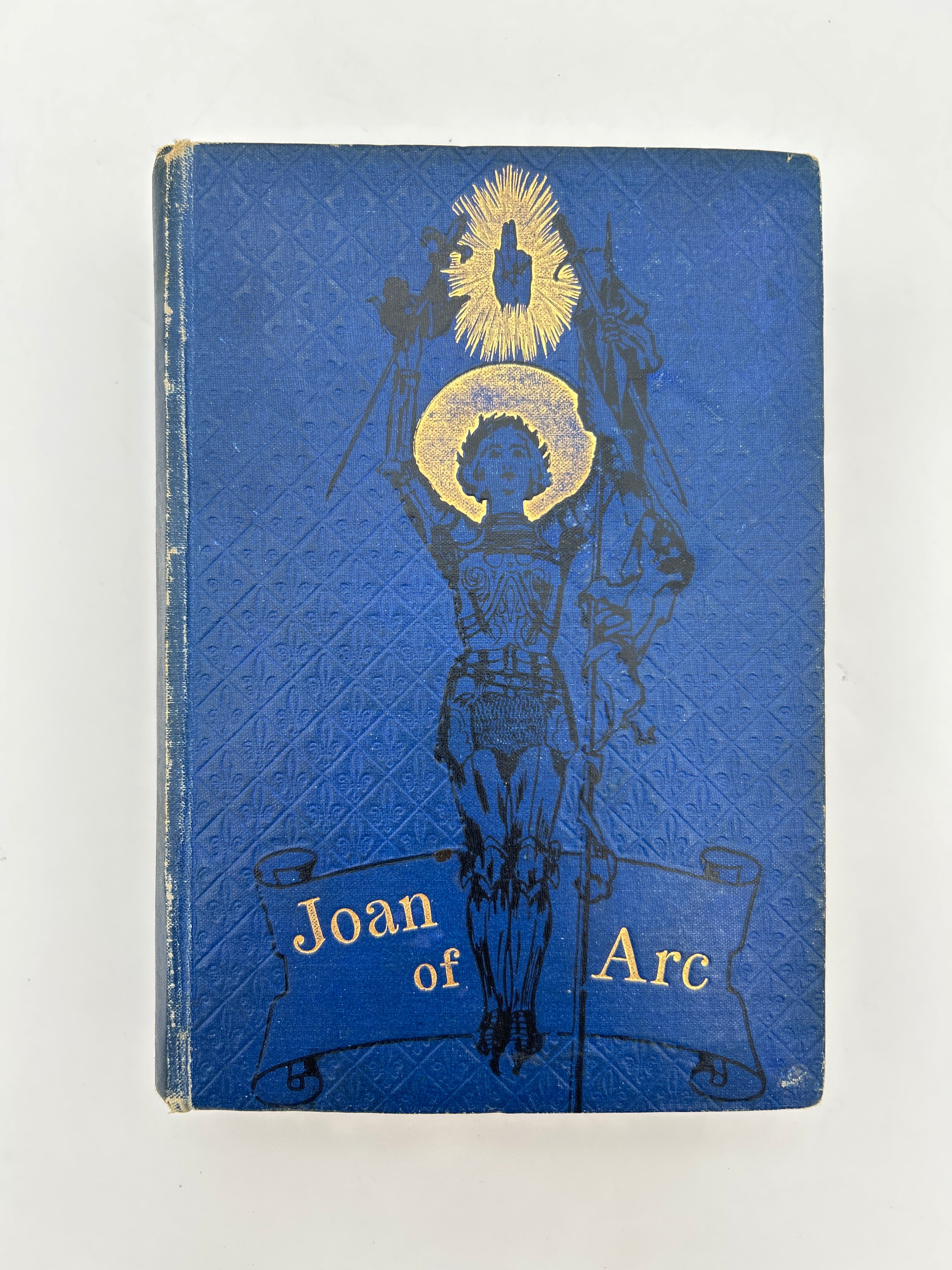 Royal blue hardback with gold and black tooling on front cover with an image of Joan being anointed as a Saint, intact, foxing throughout, overall good condition.