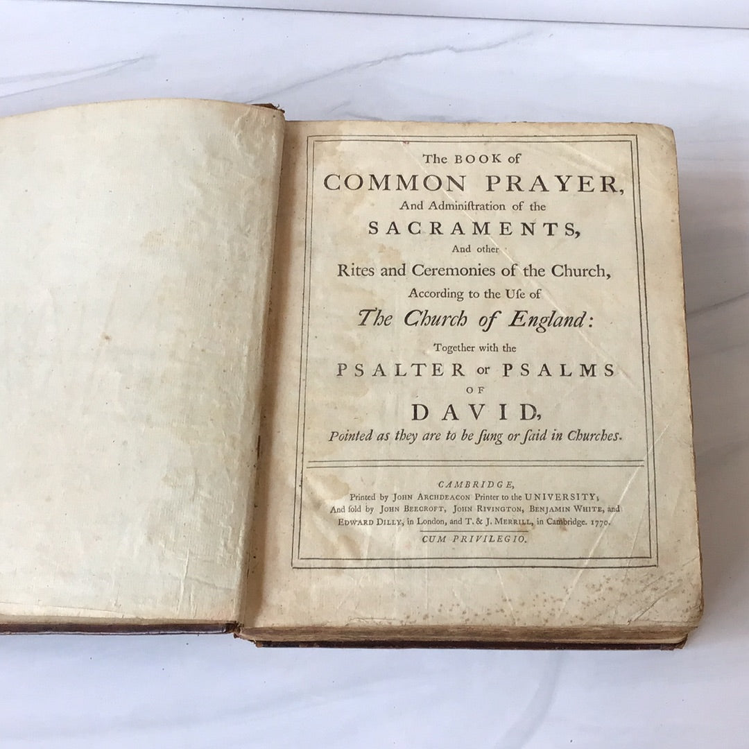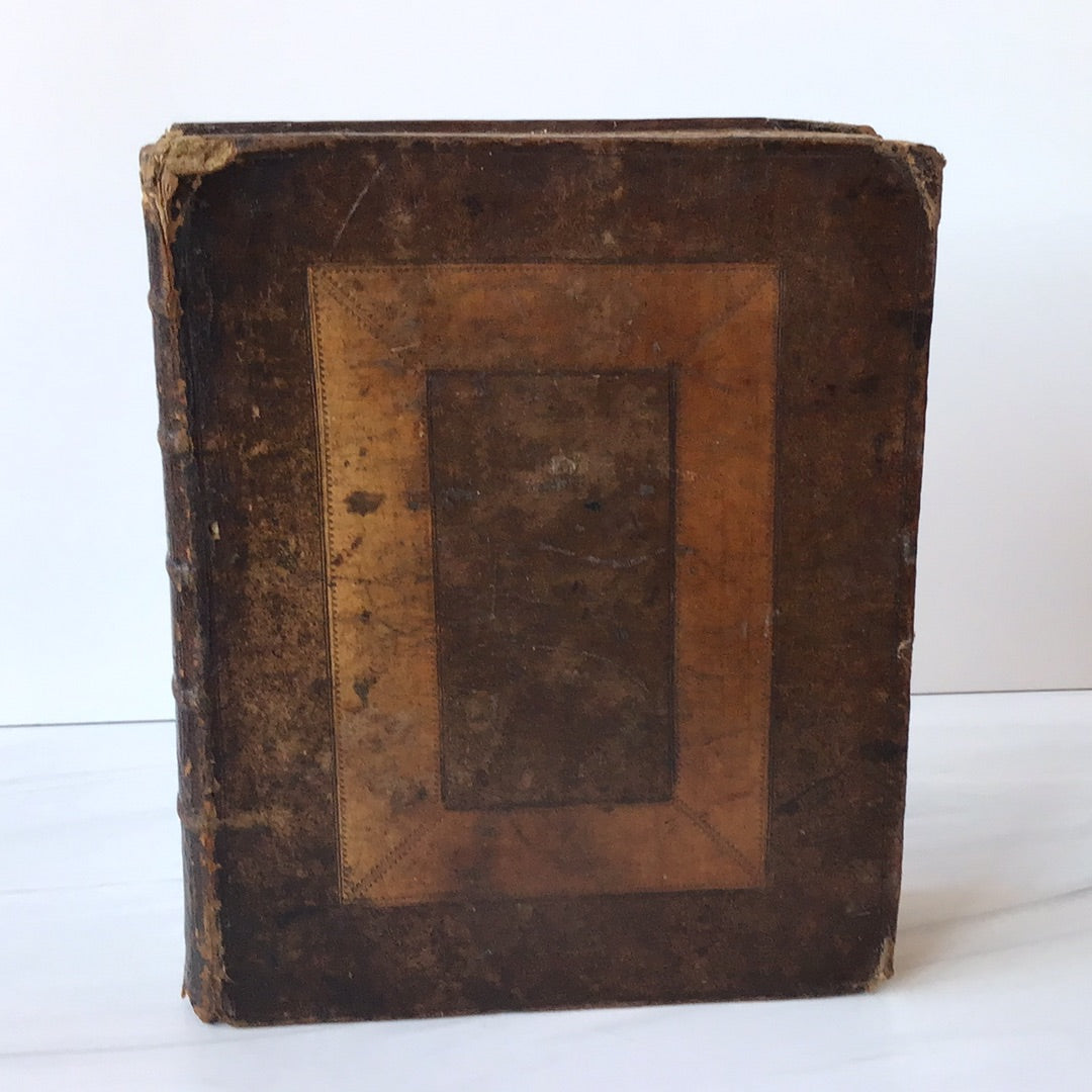 Brown leather family style bible, five raised bands on spine, rubbing through boards on four corners, includes The Book of Common Prayer, overall fair condition.