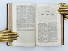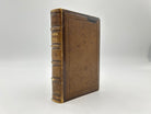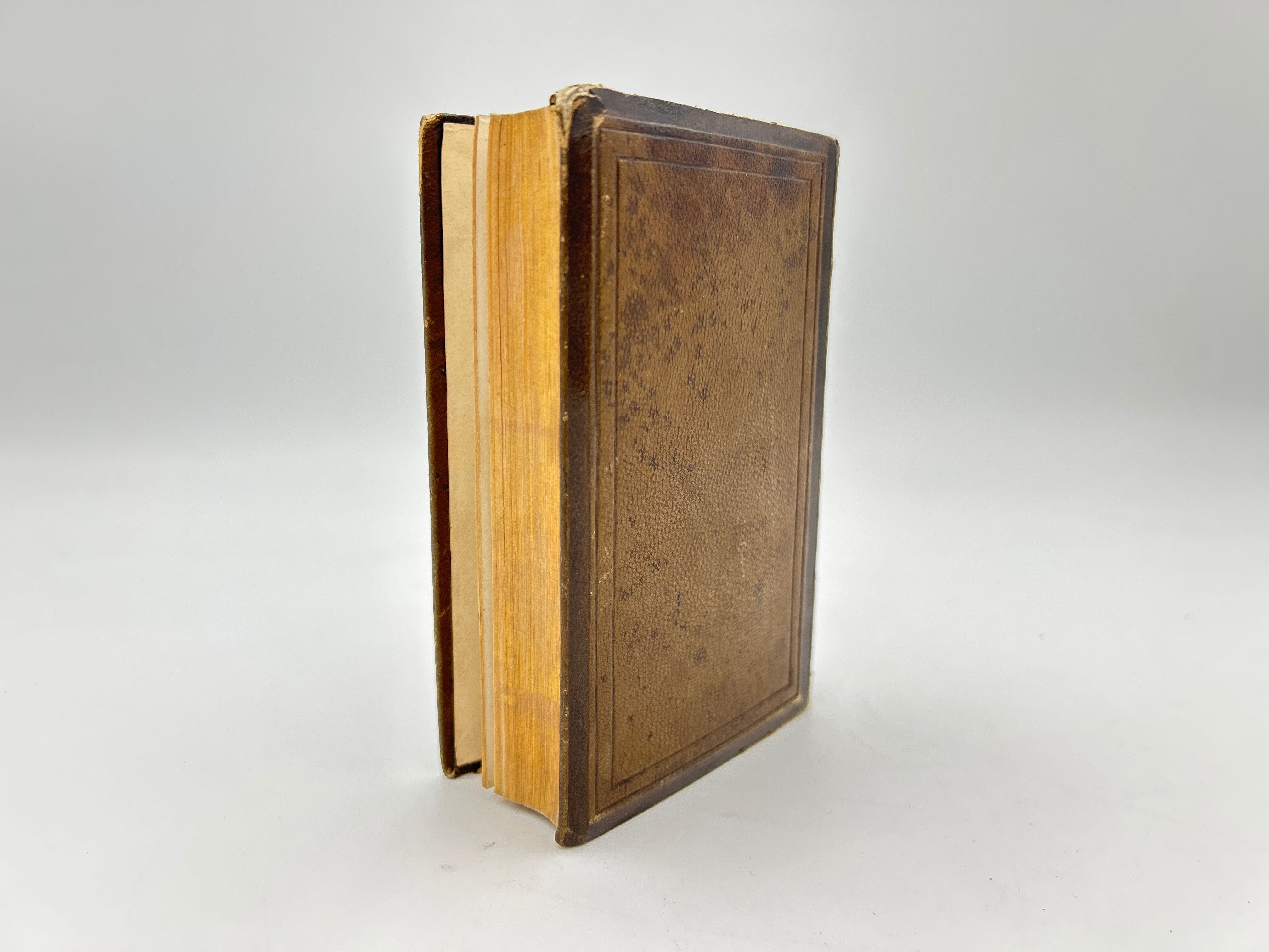 Pocket size brown leather, marble end papes, four raised bands, black stain on top right front binding, good condition.