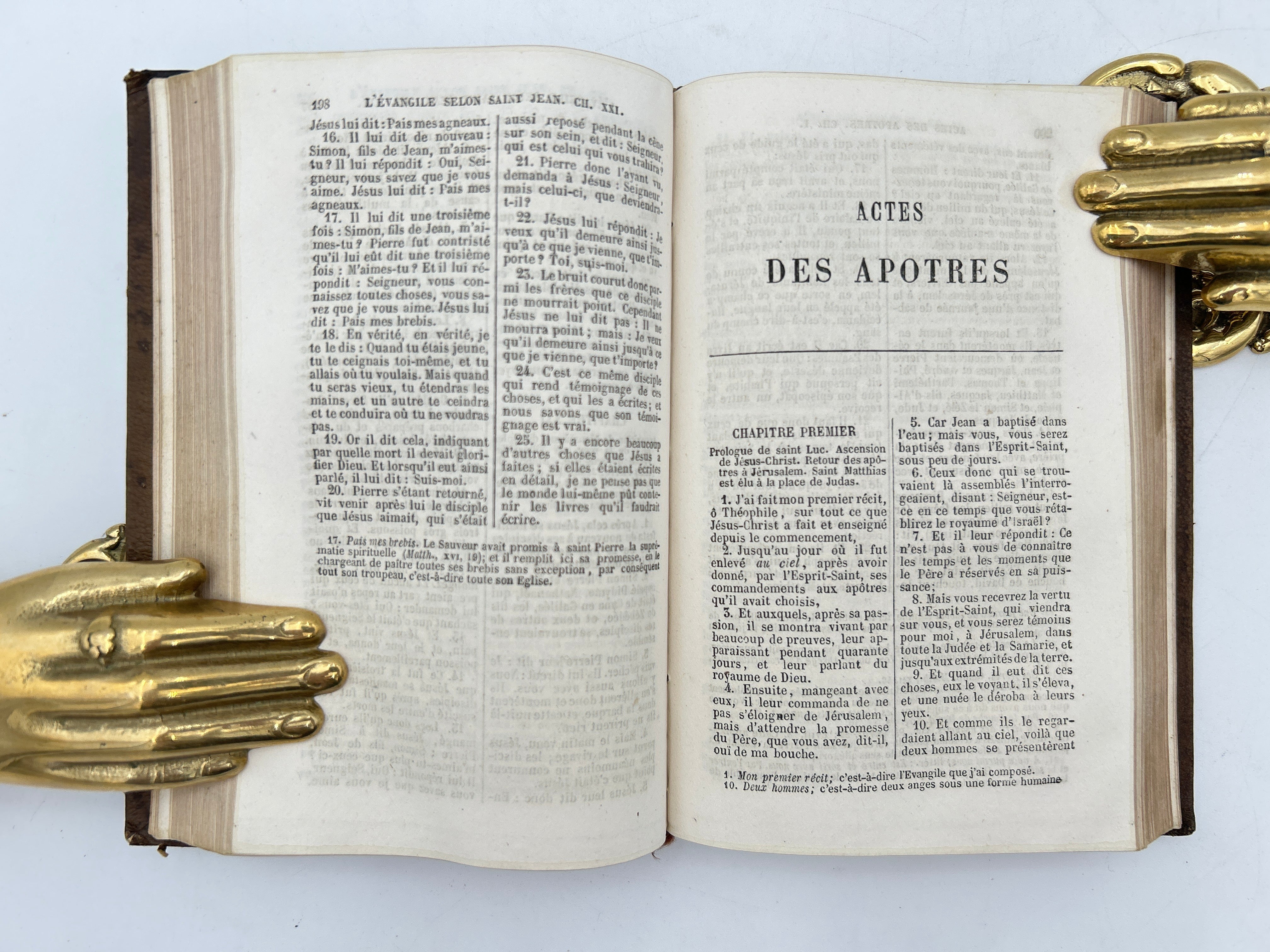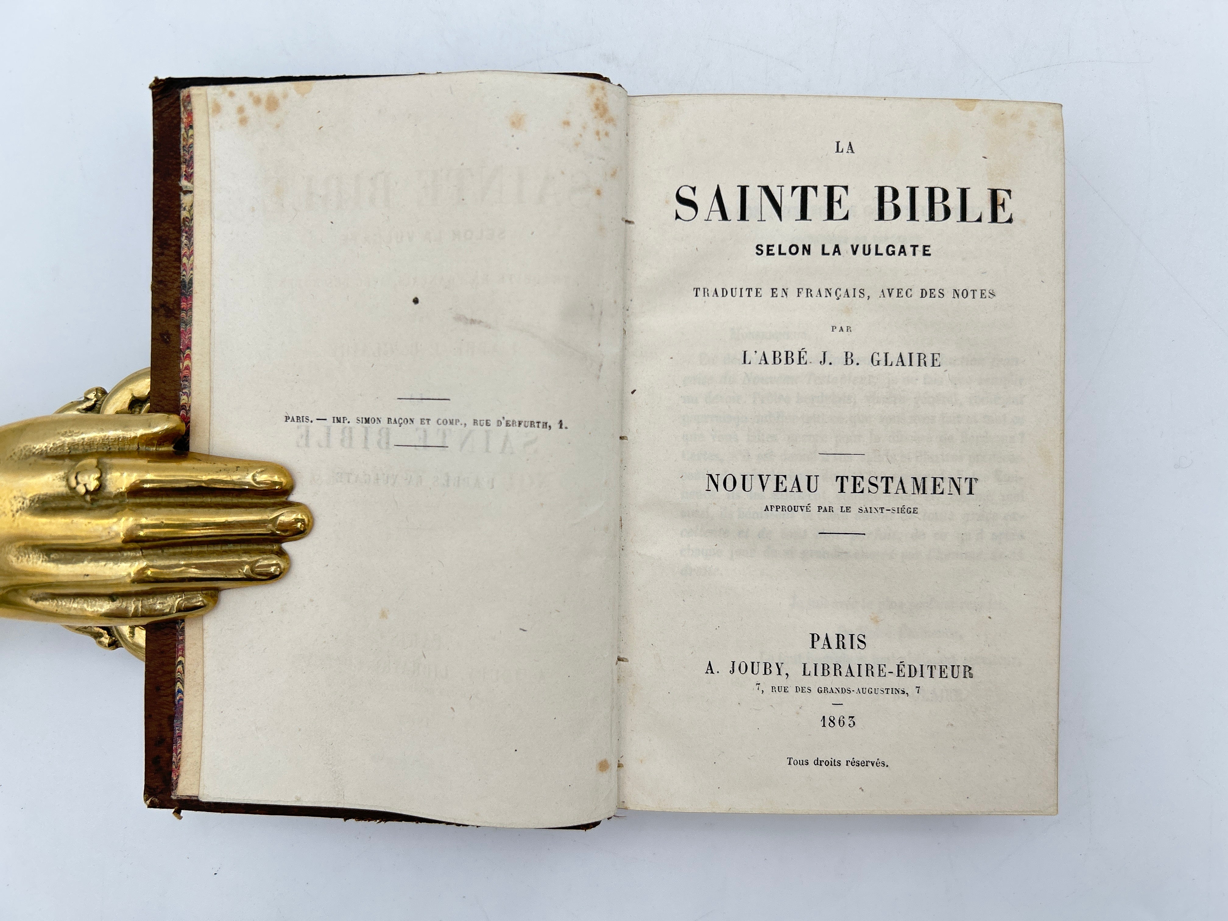 "La Sainte Bible," published in 1863, is a significant edition of the Holy Bible in French. This version, which includes both the Old and New Testaments, was carefully translated to be accessible to French-speaking Christians. The 1863 edition is known for its attention to linguistic precision and its effort to remain faithful to the original texts. It holds historical importance for its role in making biblical teachings widely available to the French populace during the 19th century, reflecting the religious and cultural contexts of its time.