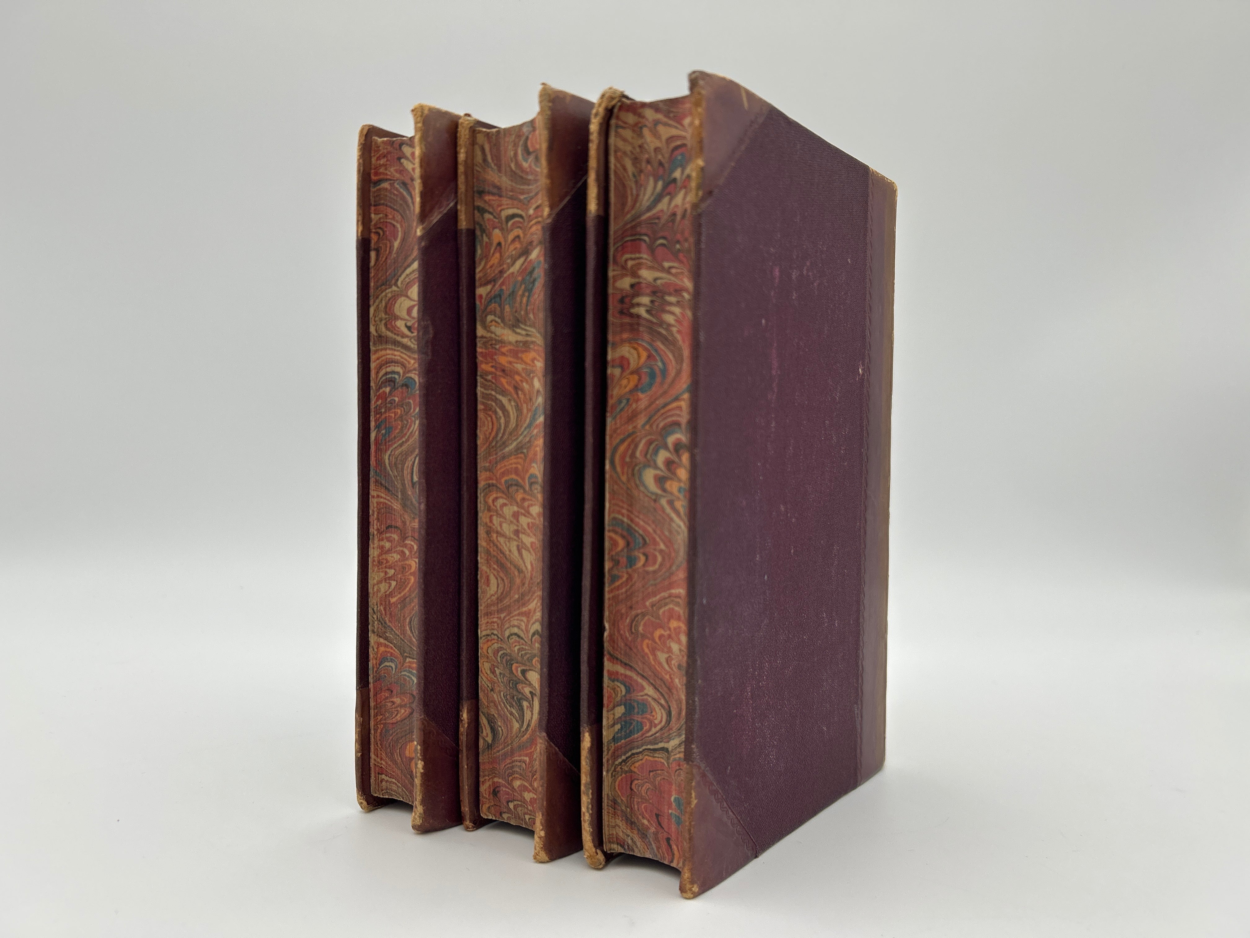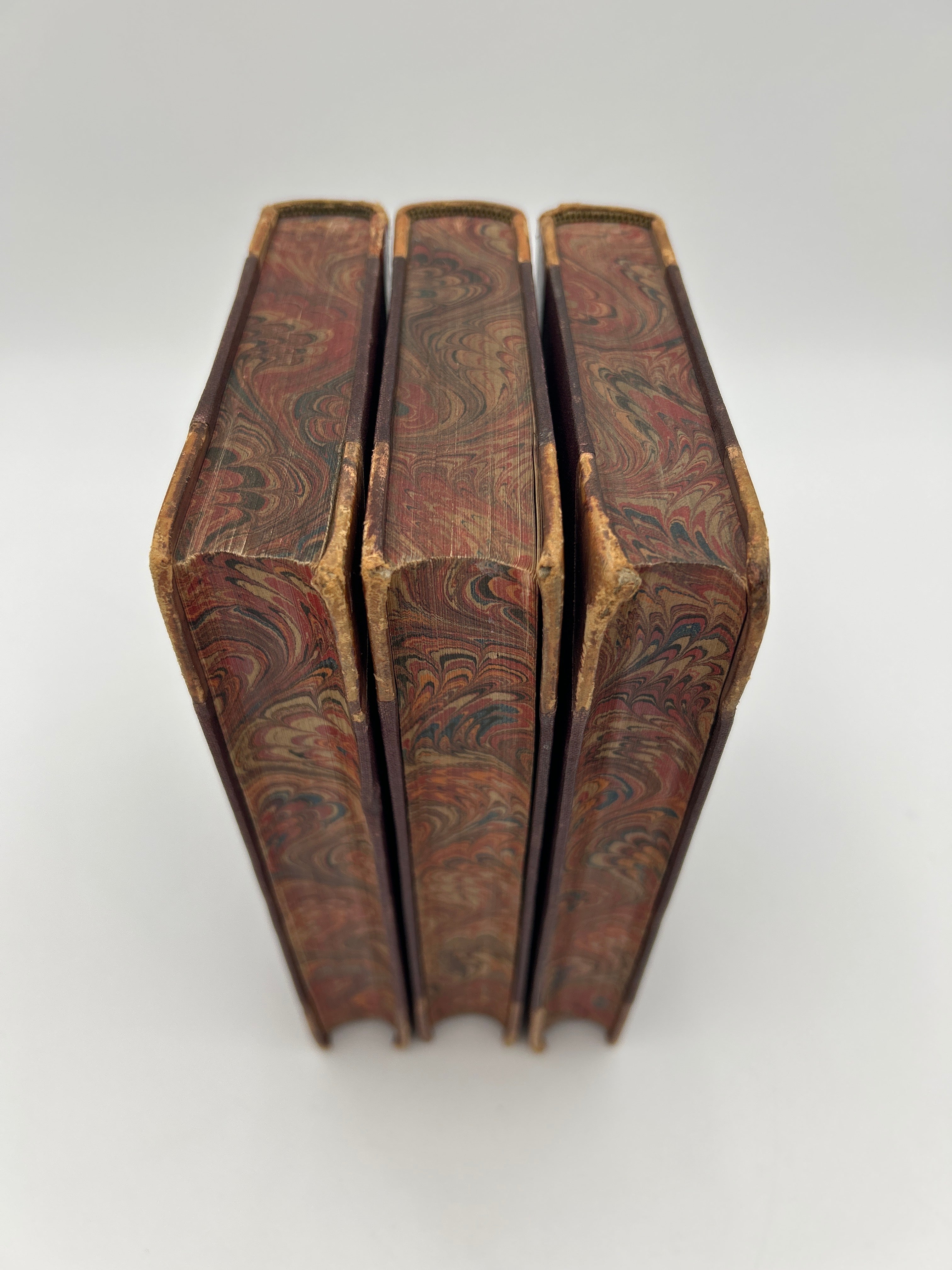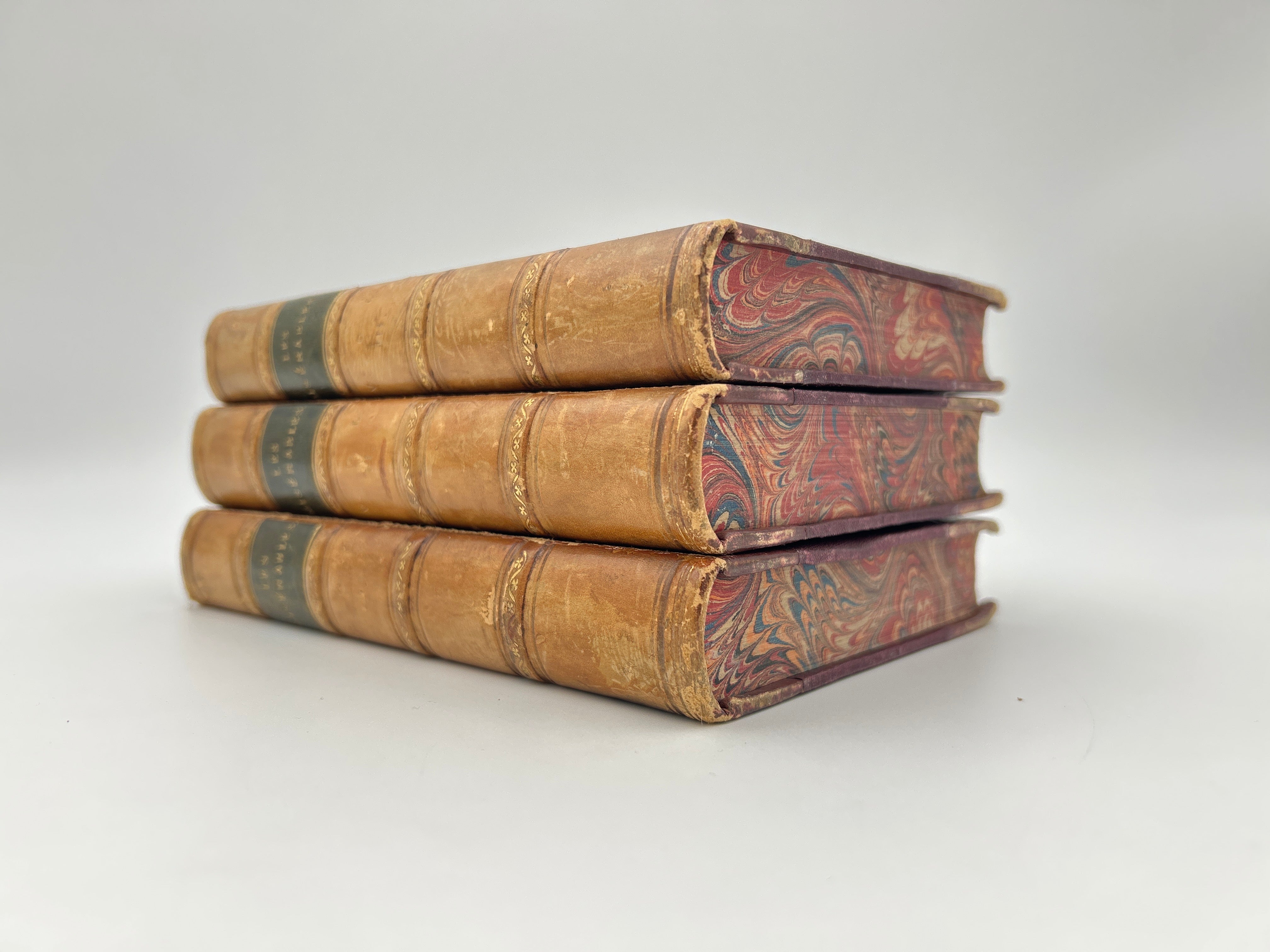 Pebbled leather boards with leather spine and corners. Four raised bands with gilt lettering on a black label in the second compartment. Marbled edges and endpapers on all three volumes. Minimal wear to the hinges of the spine and bumping to the leather corners. Minor work done to preserve the upper spine of volume one. Interiors in pristine condition. Fine condition.