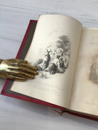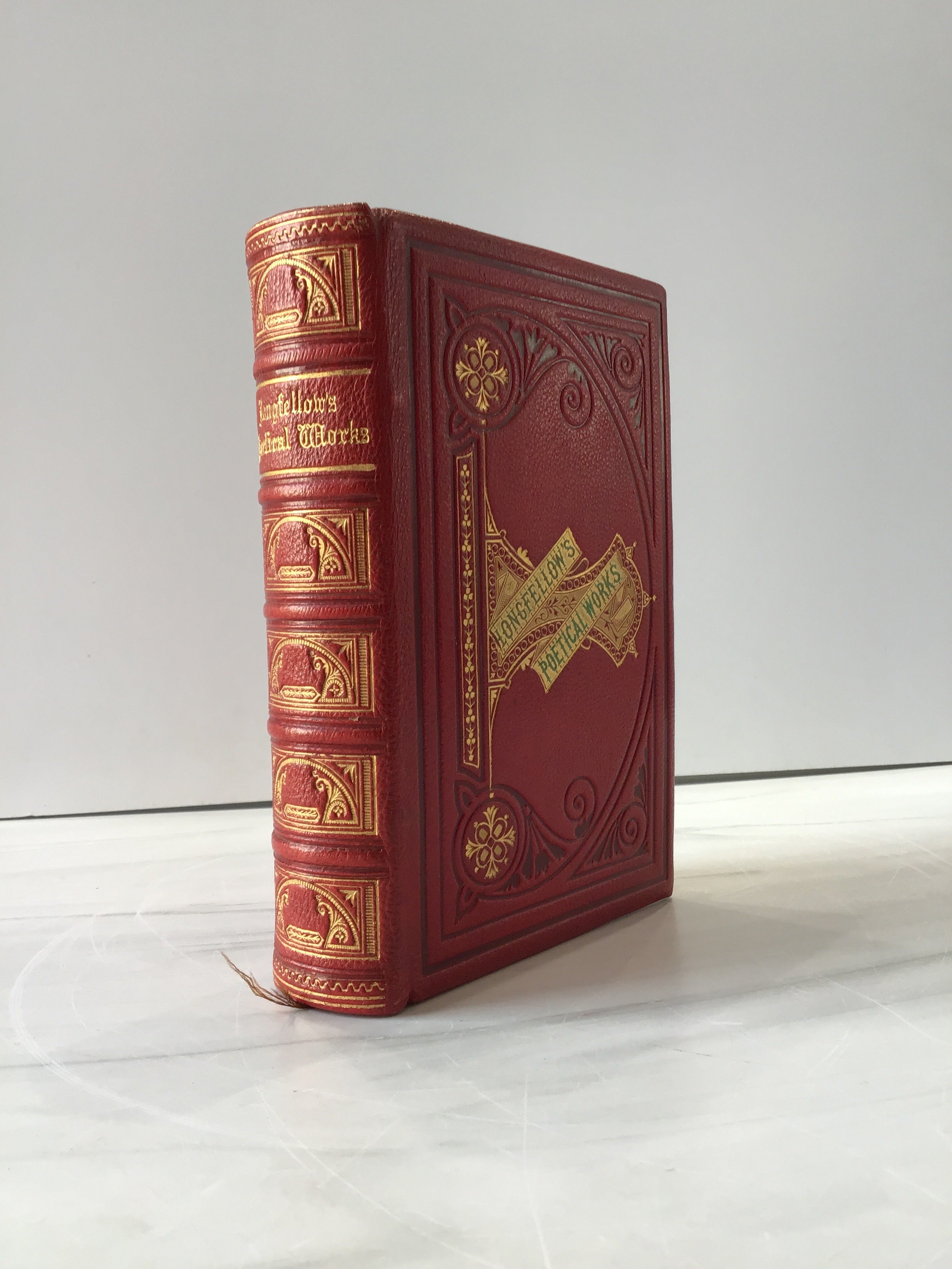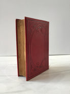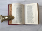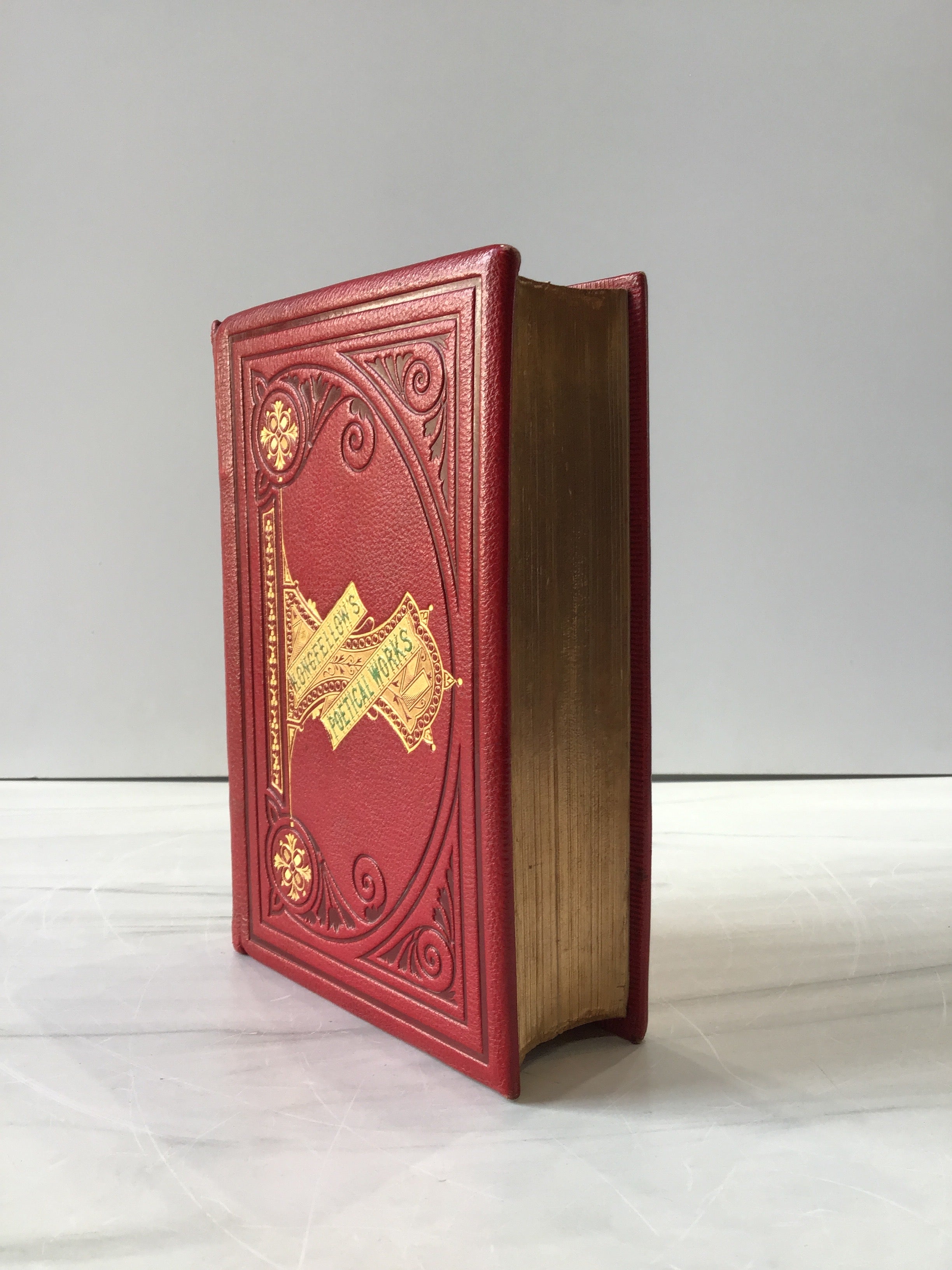 Elaborate red moroccan leather binding with gilt gold and embossed detailing to the panels and boards. All edges are gilt gold, engraved frontispiece, five raised bands, and silver plate design on title page and a few pages throughout. In pristine condition.