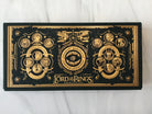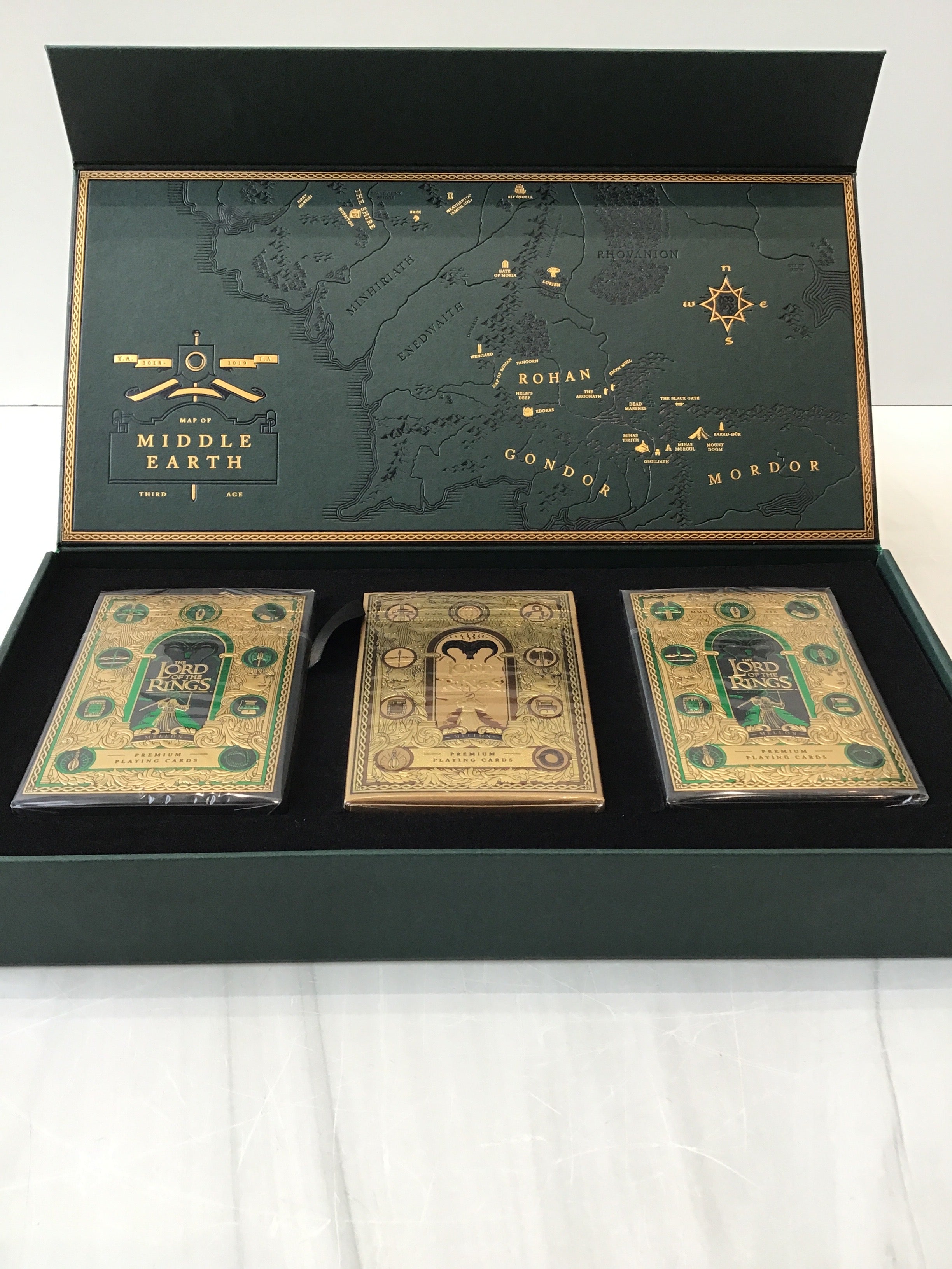 Set of three playing cards in gold and green with raised designs in a beautiful showcase box.