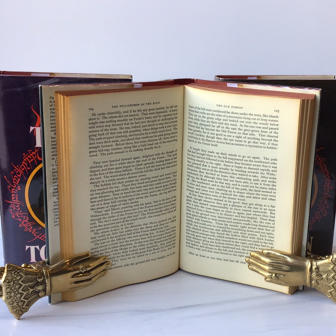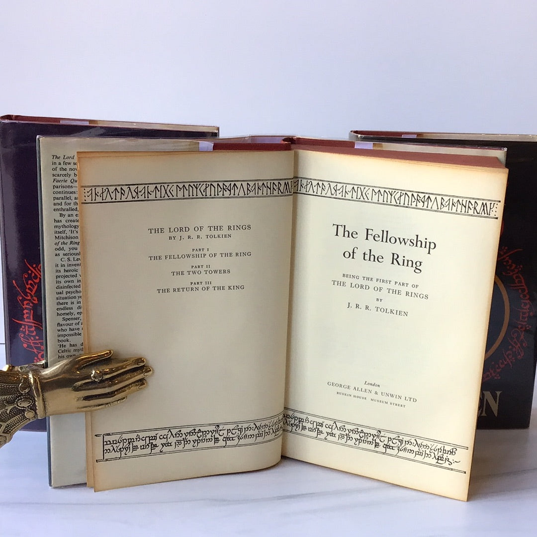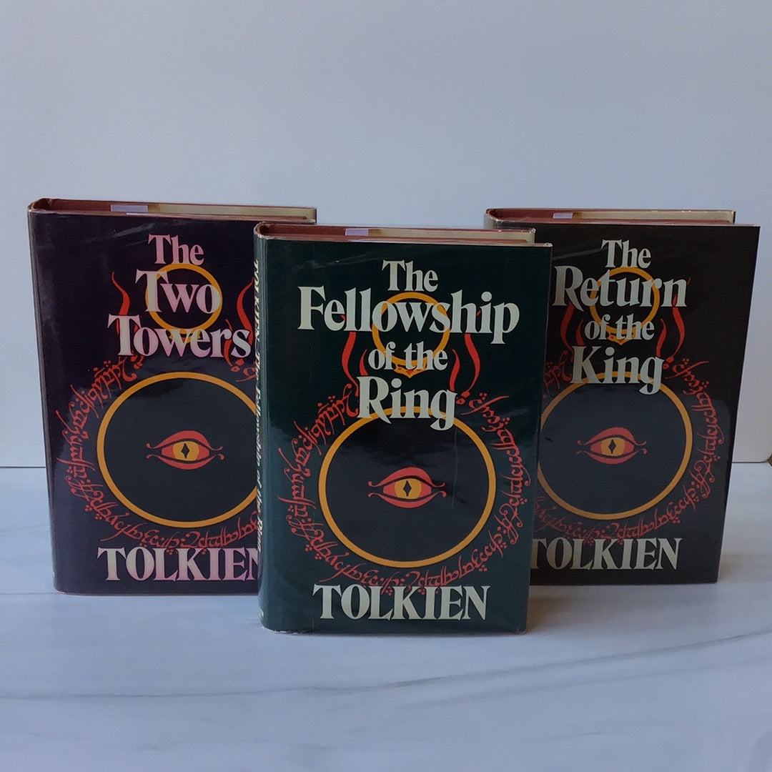 Red cloth covers with gold lettering on spine, Original dust jackets, some pink has bled into the white letters on "The Two Towers" dust jacket.