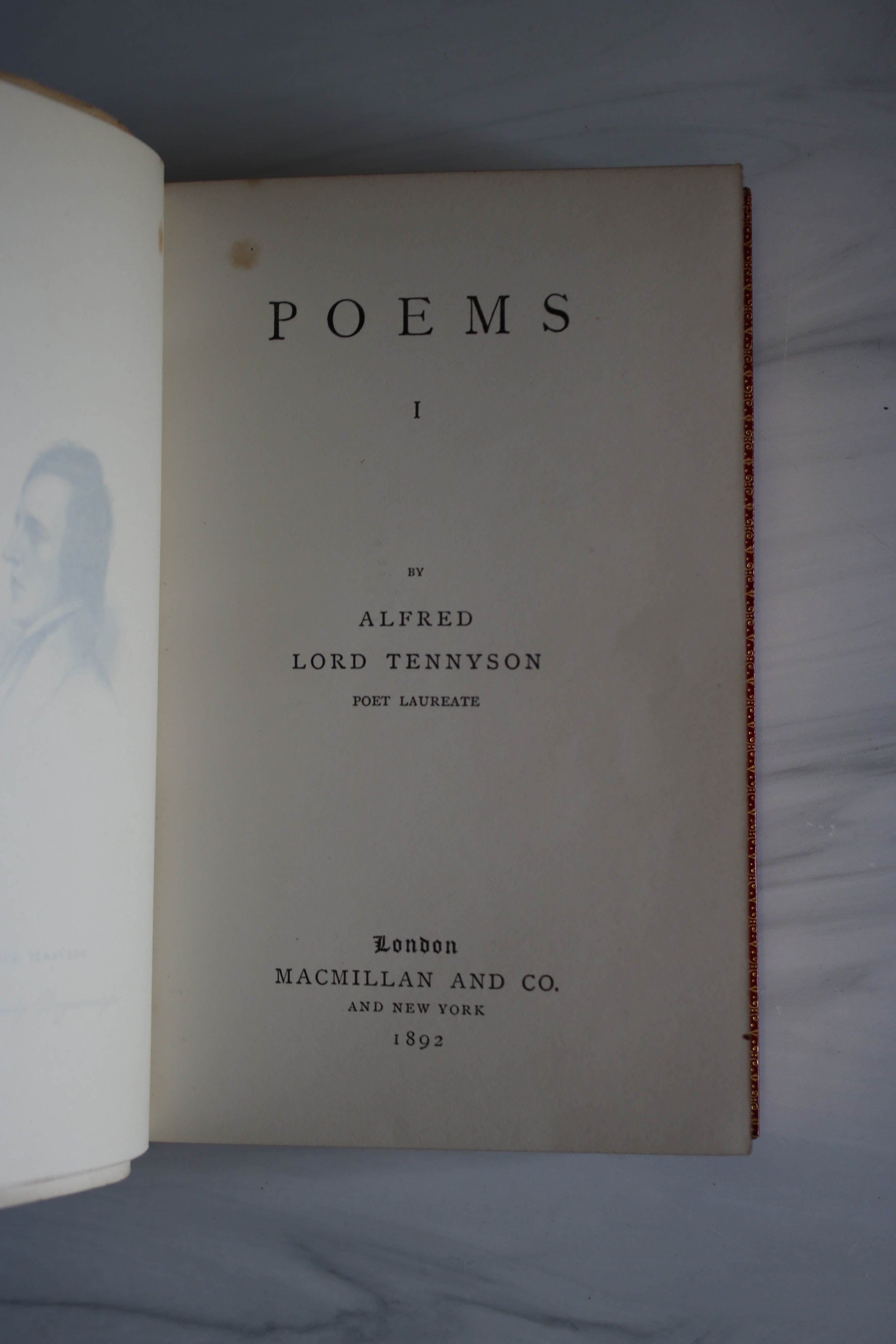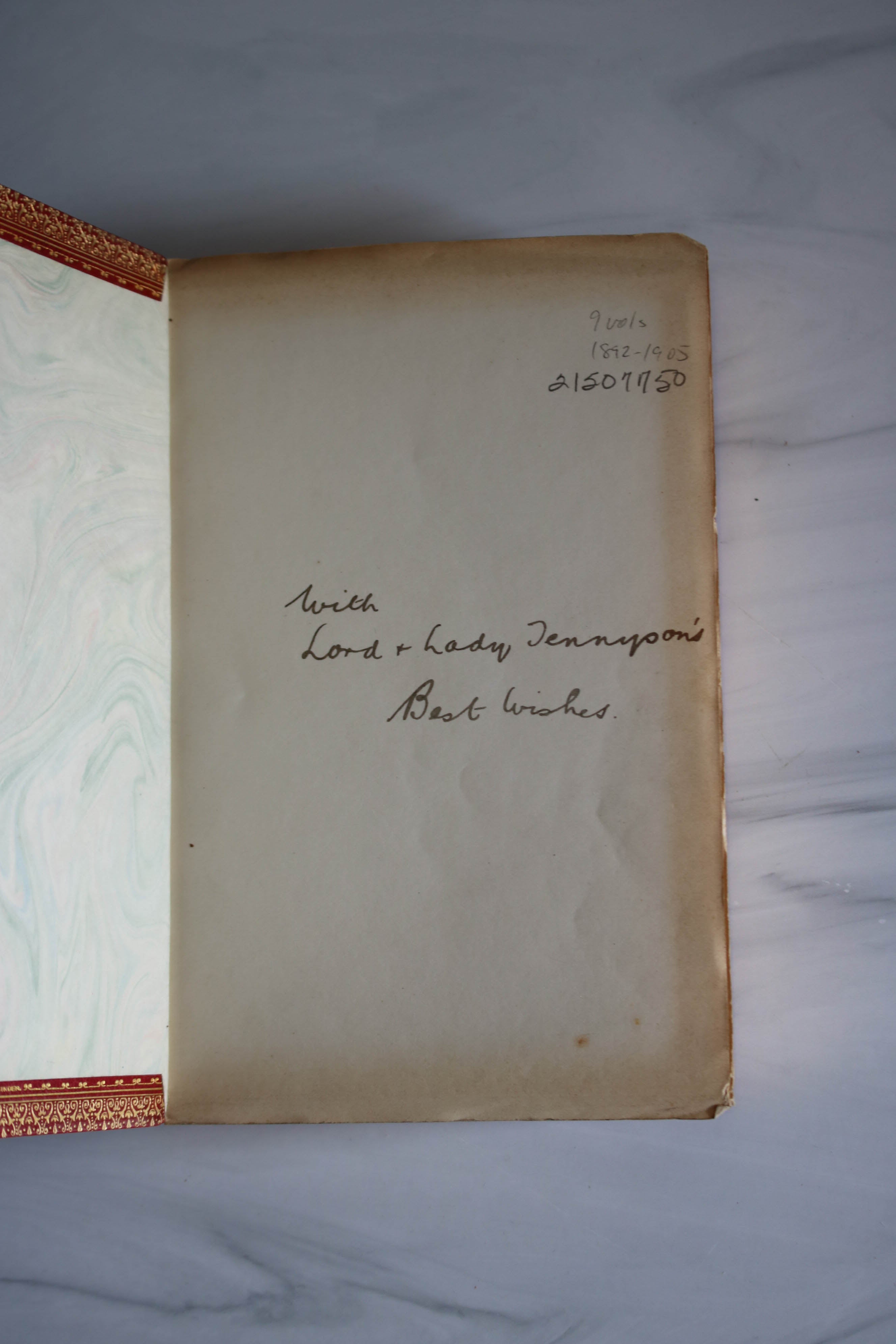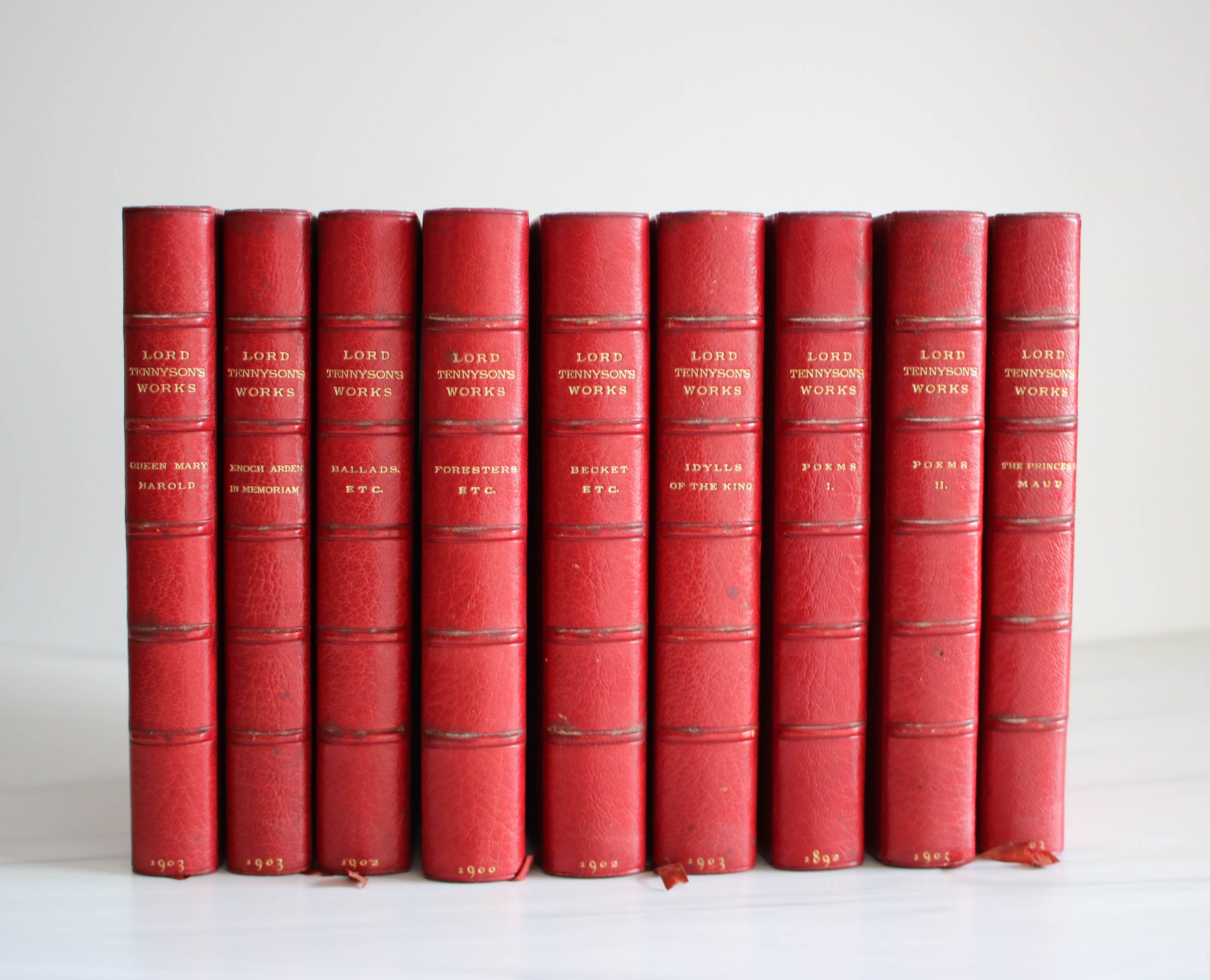 5b 1892-1905 inscribed of Lord and Lady Tennyson, 9 red leather volumes of poems.