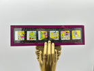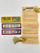 Twelve colored slides in two glass slides with red cloth seal around the edges. Each slide is 1 1/2in x 5 1/4in painted in vibrant colors. Comes in original vintage pictorial box with original slide dialogue pages. Fully intact.