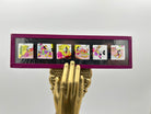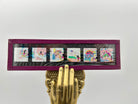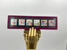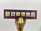 Twelve colored slides in two glass slides with purple seal around the edges. Each slide is 1 1/2in x 5 1/4in painted in vibrant colors. Comes in original vintage pictorial box.