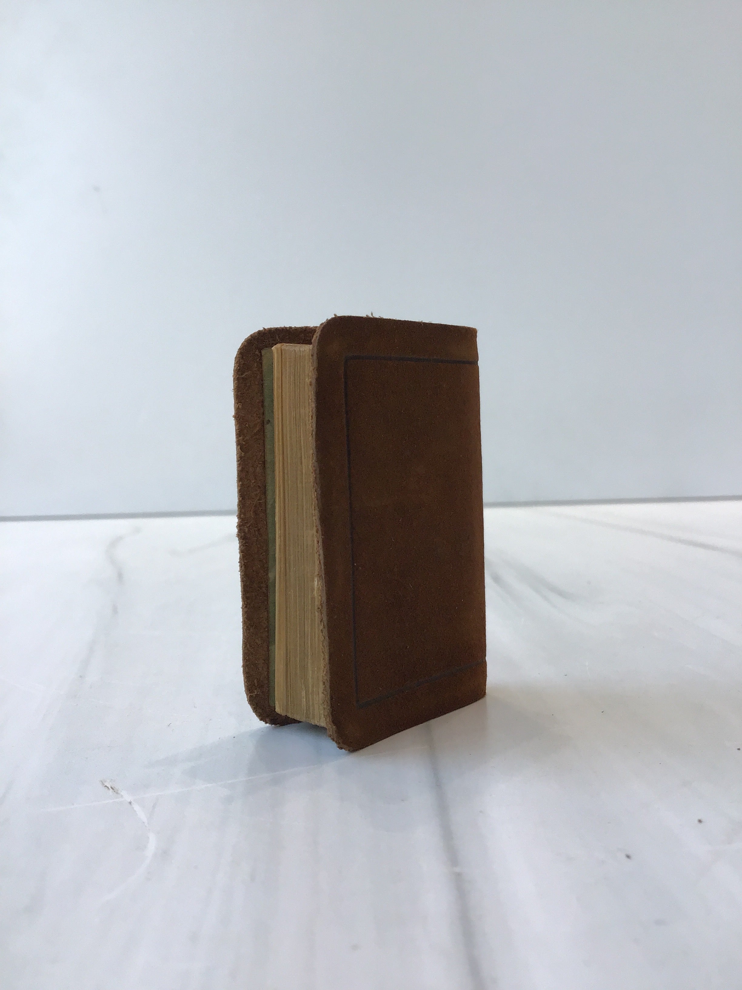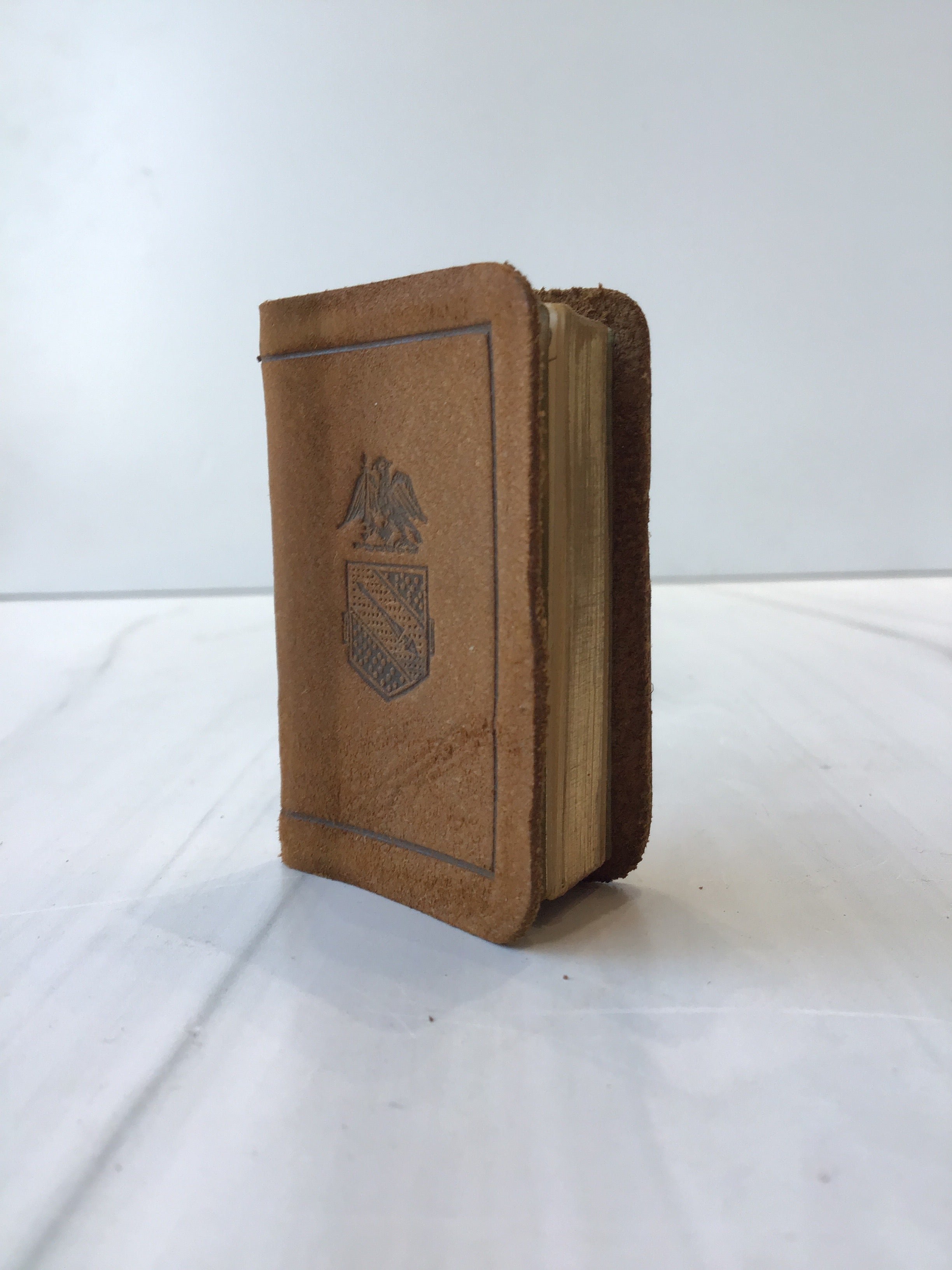 Miniature brown leather bound book, design embossed on front, three edge gold, very good condition.