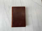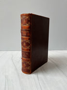 Dark brown textured leather with embossed design around the perimeter. Four raised bands, gold embossed lettering and designs on the spine, and red marbled fore edges. Leather along edges and the spine are worn down to a caramel color and cracking along the spine. Back cover is beginning to separate from the binding. Good condition overall.