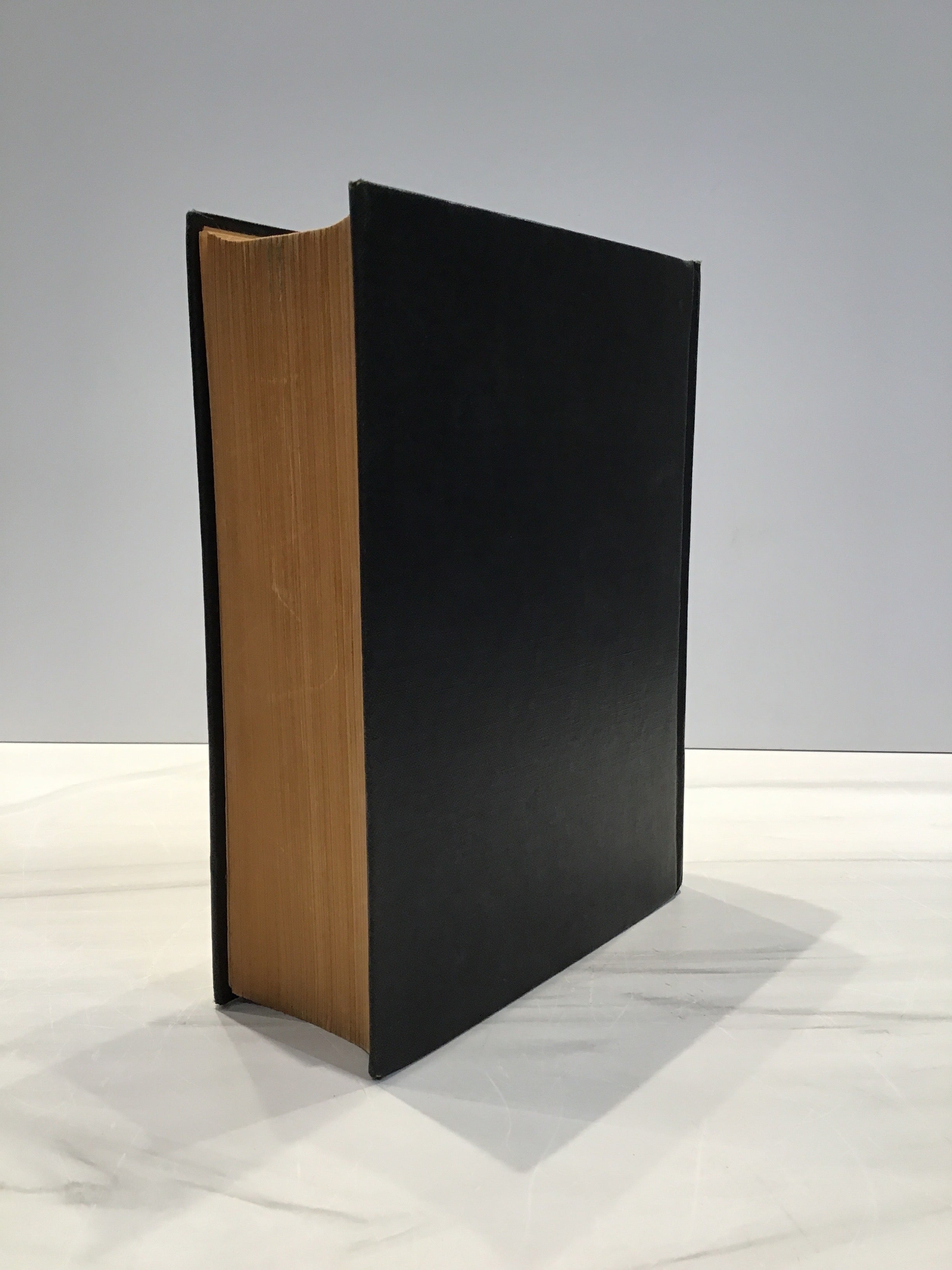 Black canvas hardcover with silver embossed illustrations and lettering on the front cover and spine. Fading to some of the silver designs on the spine. Wear to the top and bottom of the spine softening the canvas and tearing slightly at the corners. Browning to pages from age. Beige facsimile dust jacket with black and deep blue lettering and designs. Great condition overall.