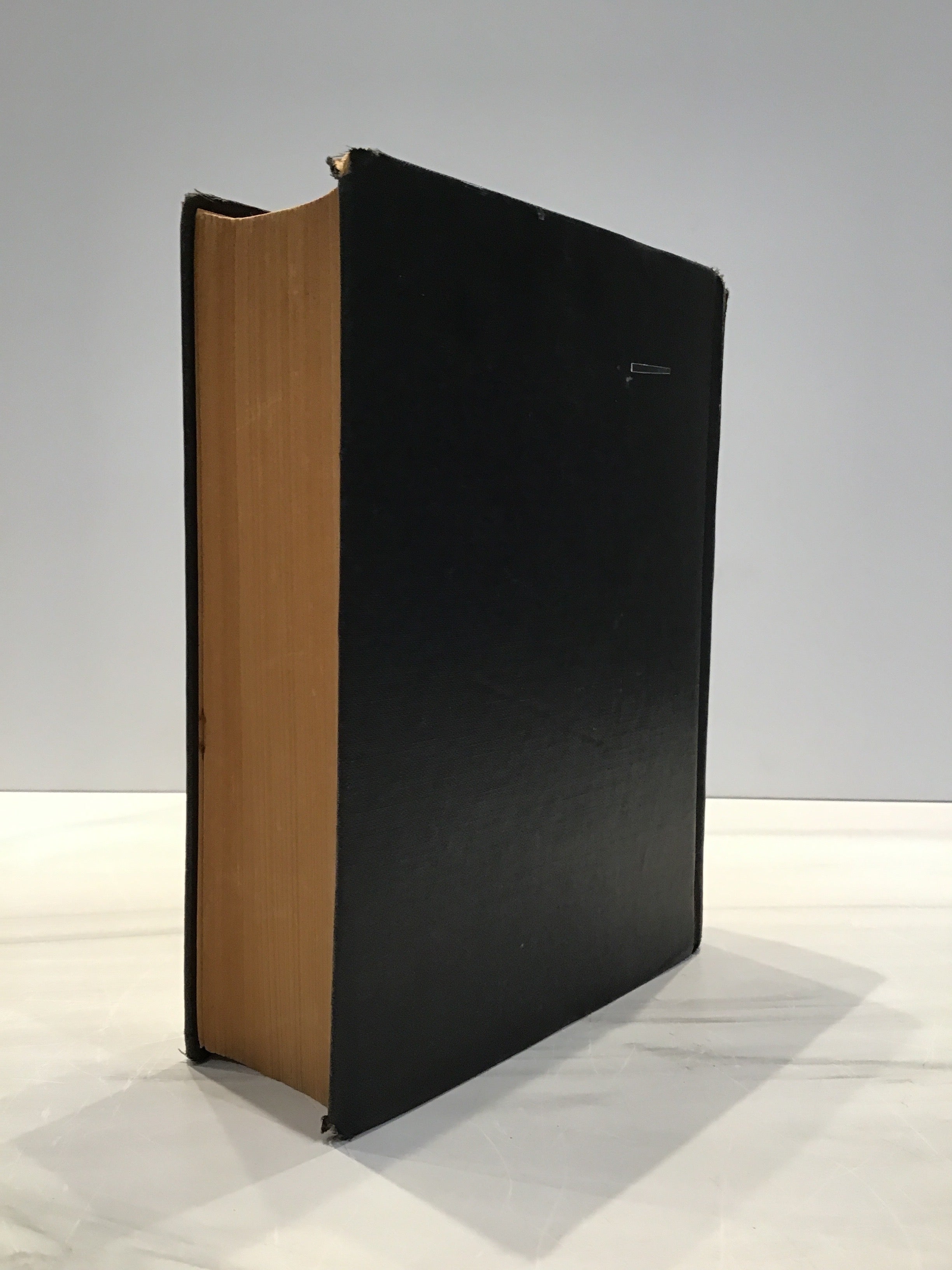 Black canvas hardcover with silver embossed illustrations and lettering on the front cover and spine. Fading to some of the silver designs on the cover. Wear to the top and bottom of the spine softening the canvas and tearing slightly at the corners. Tearing and frayed edges at top of the spine.