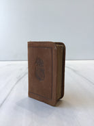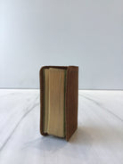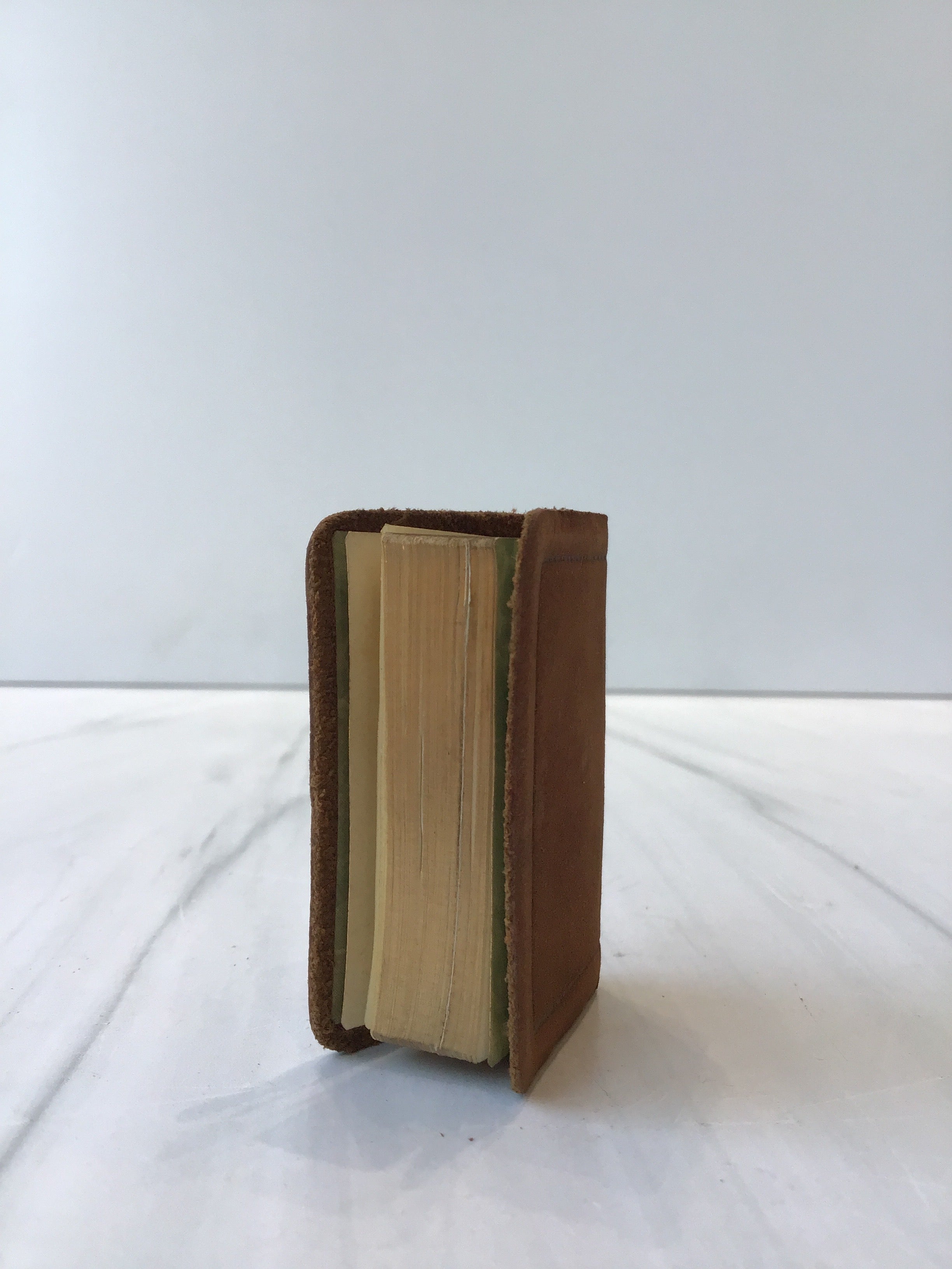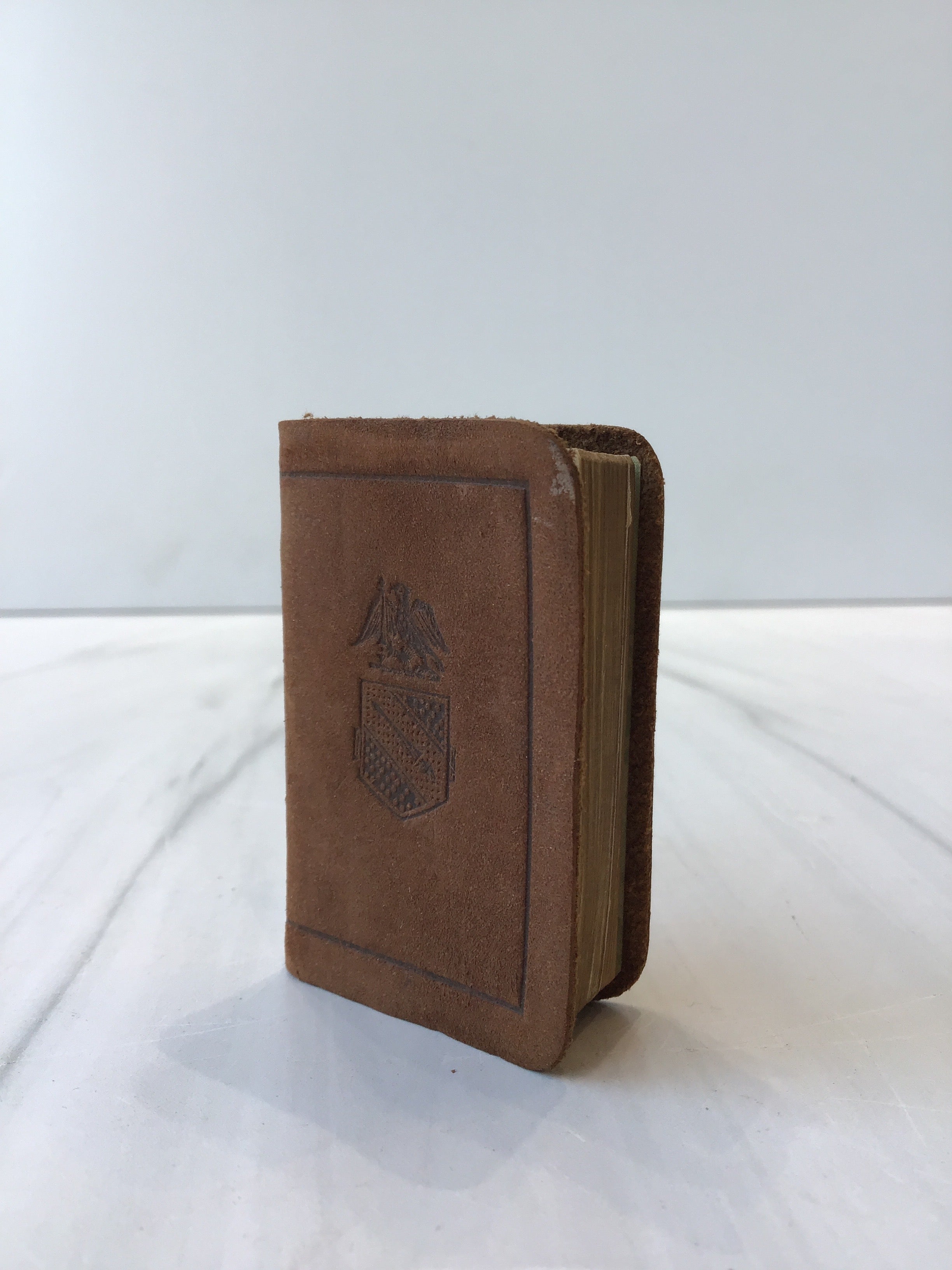 Miniature brown leather bound, three gold edge, design embossed on front, very good condition.