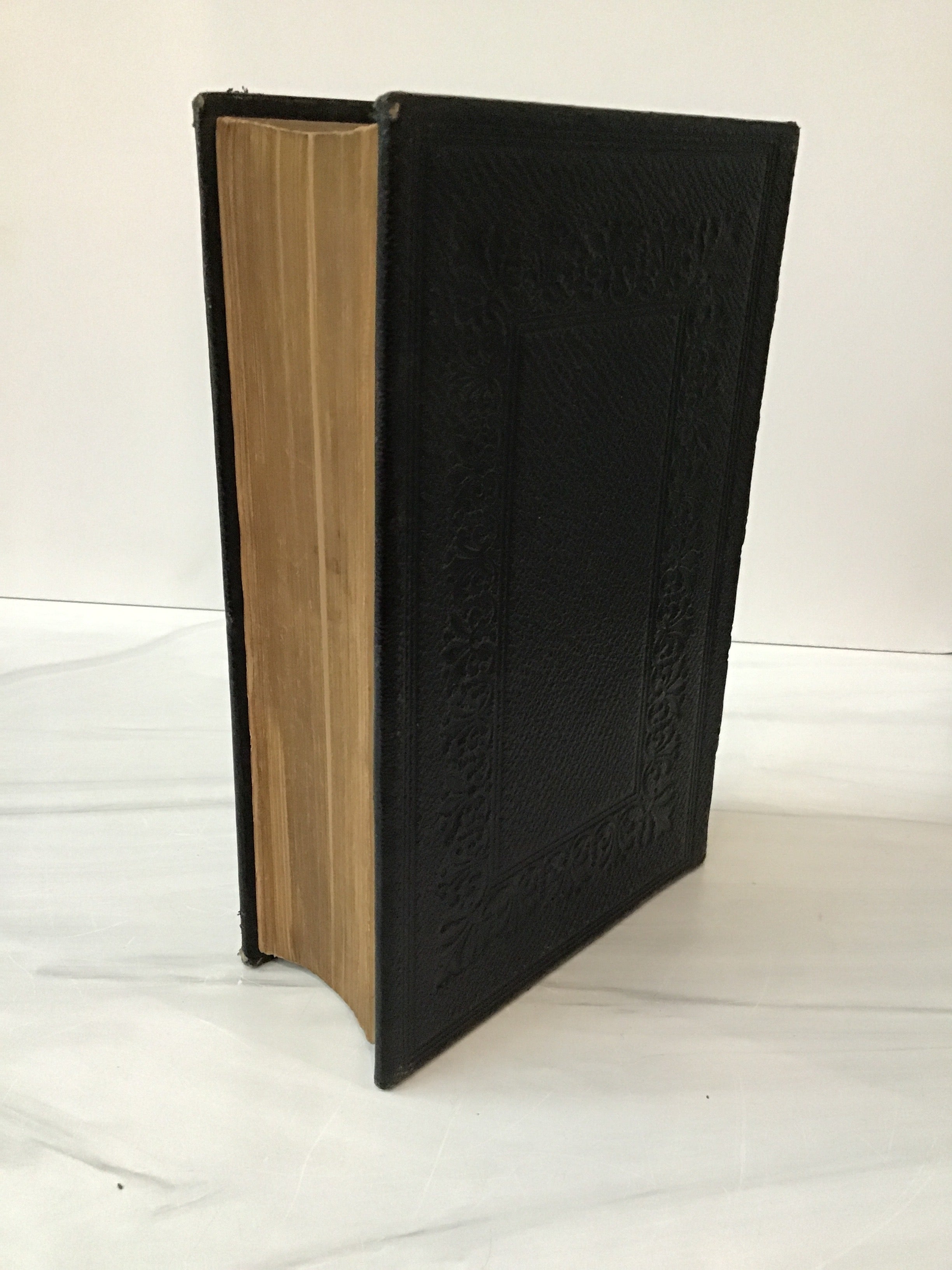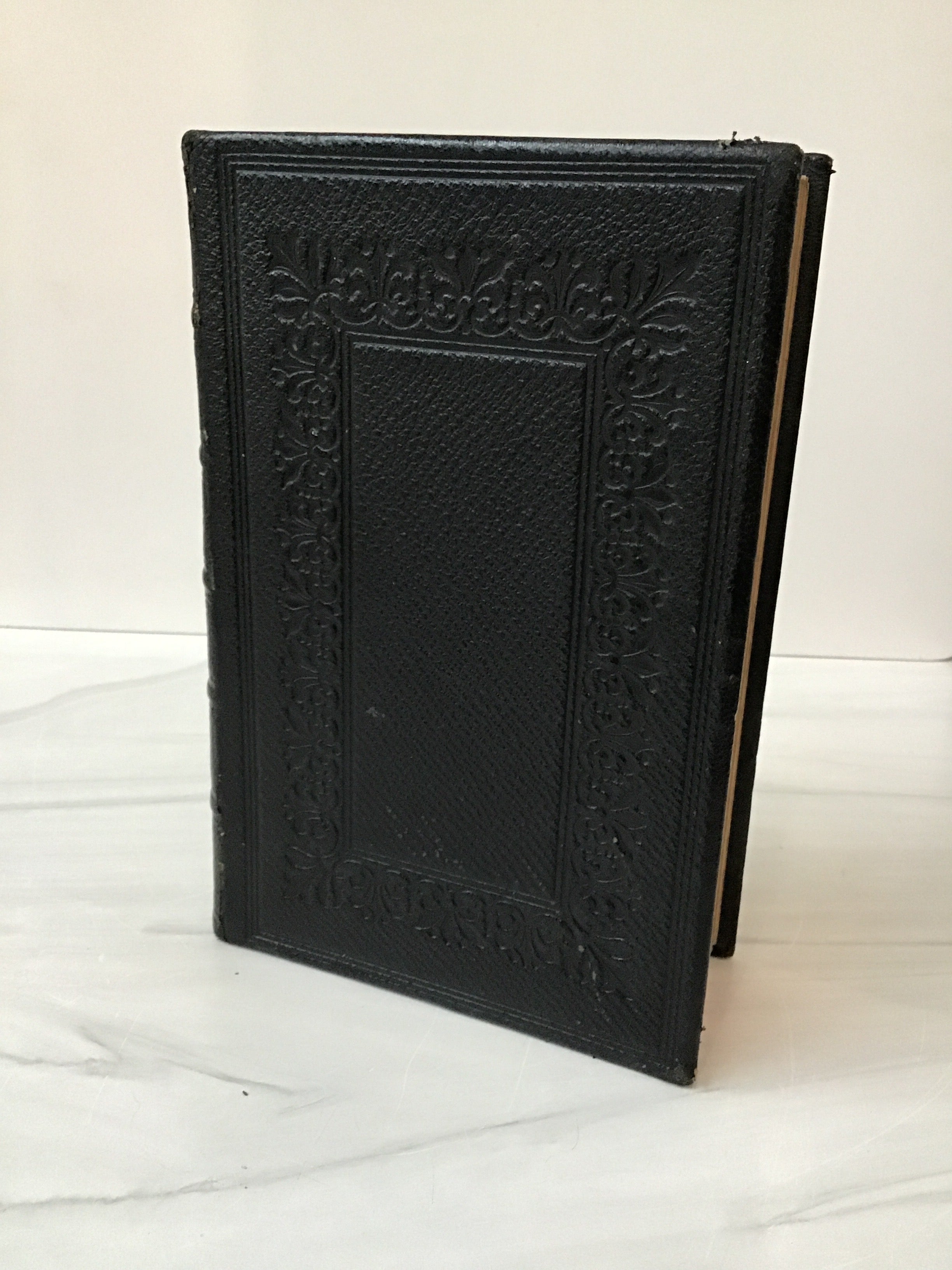 Beautiful black leather with design front, back and spine, five raised bands on spine with gold tooled title label, three gold edge, very good condition.