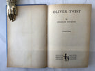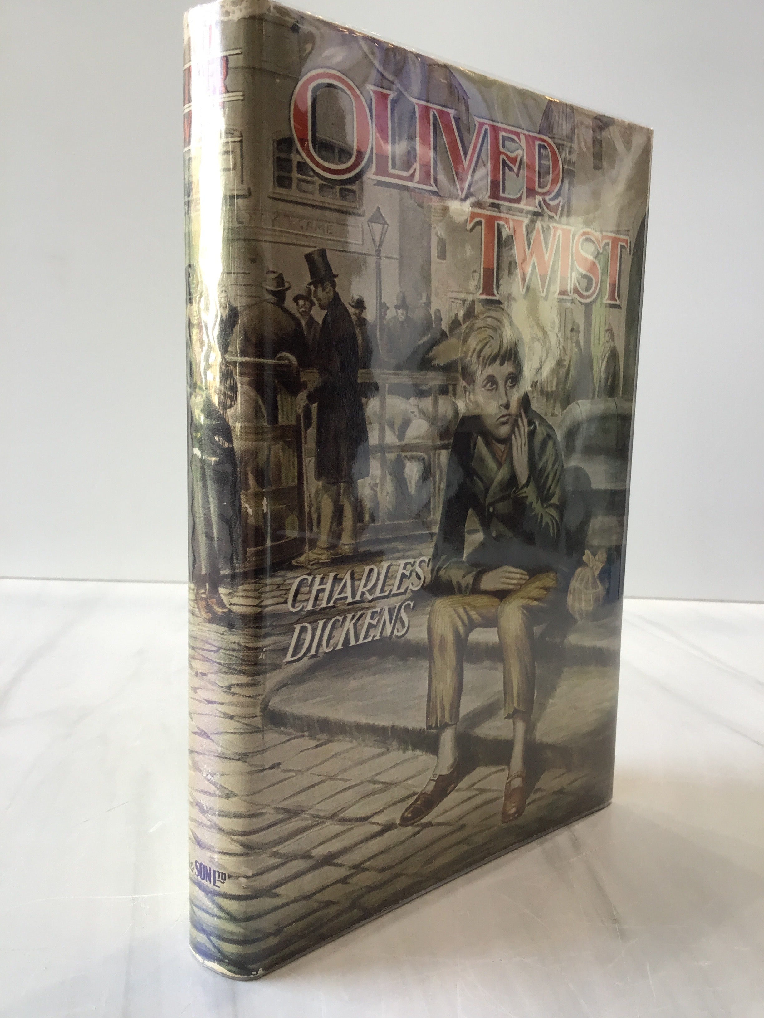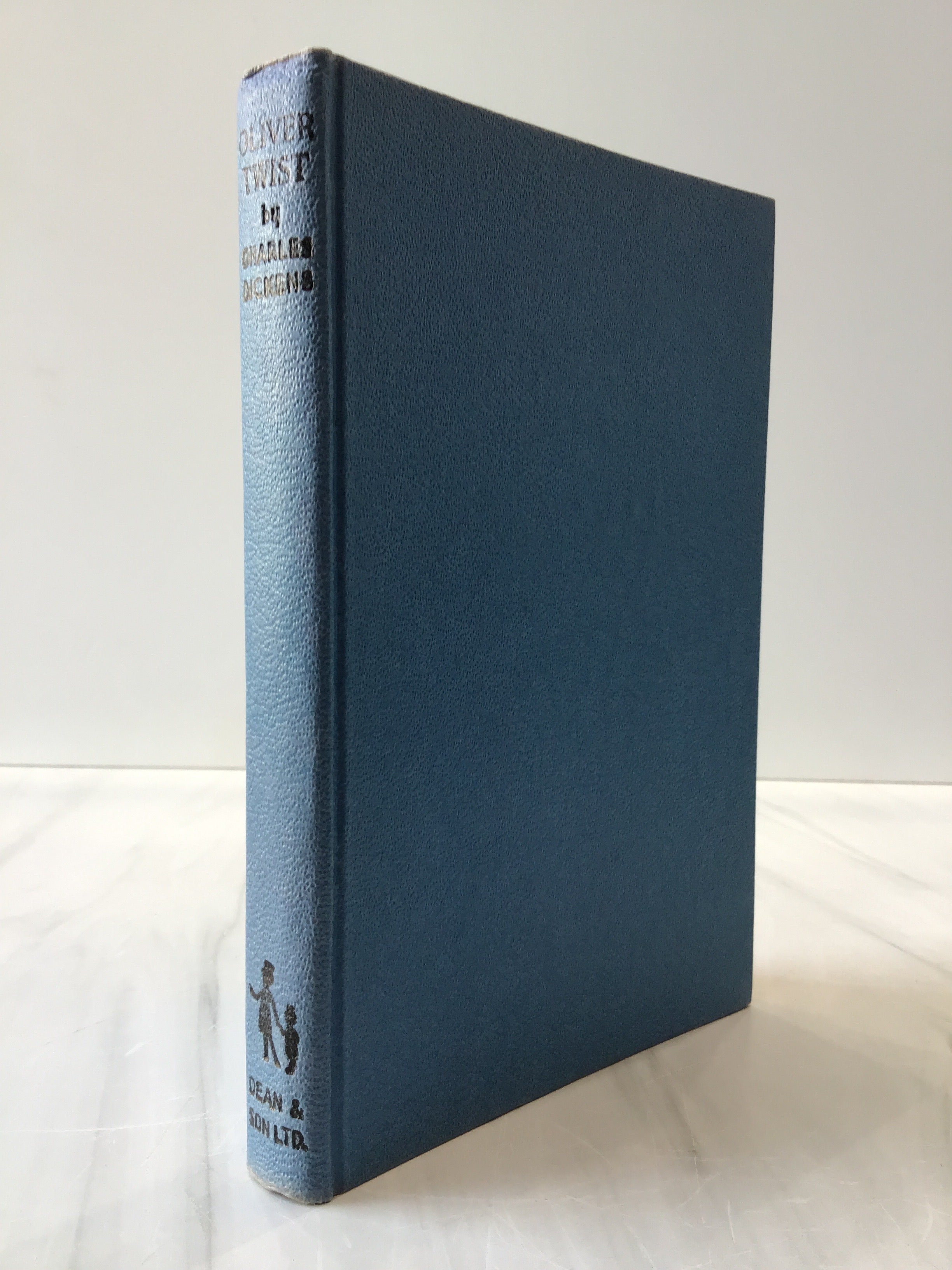 Blue pebble leather hardback copy with black lettering on the spine and illustrated dust jacket with depiction of Oliver Twist and red lettering on the cover and spine. Small spots of pigment loss on the corners and top of spine of dust jacket. Browning to pages over time