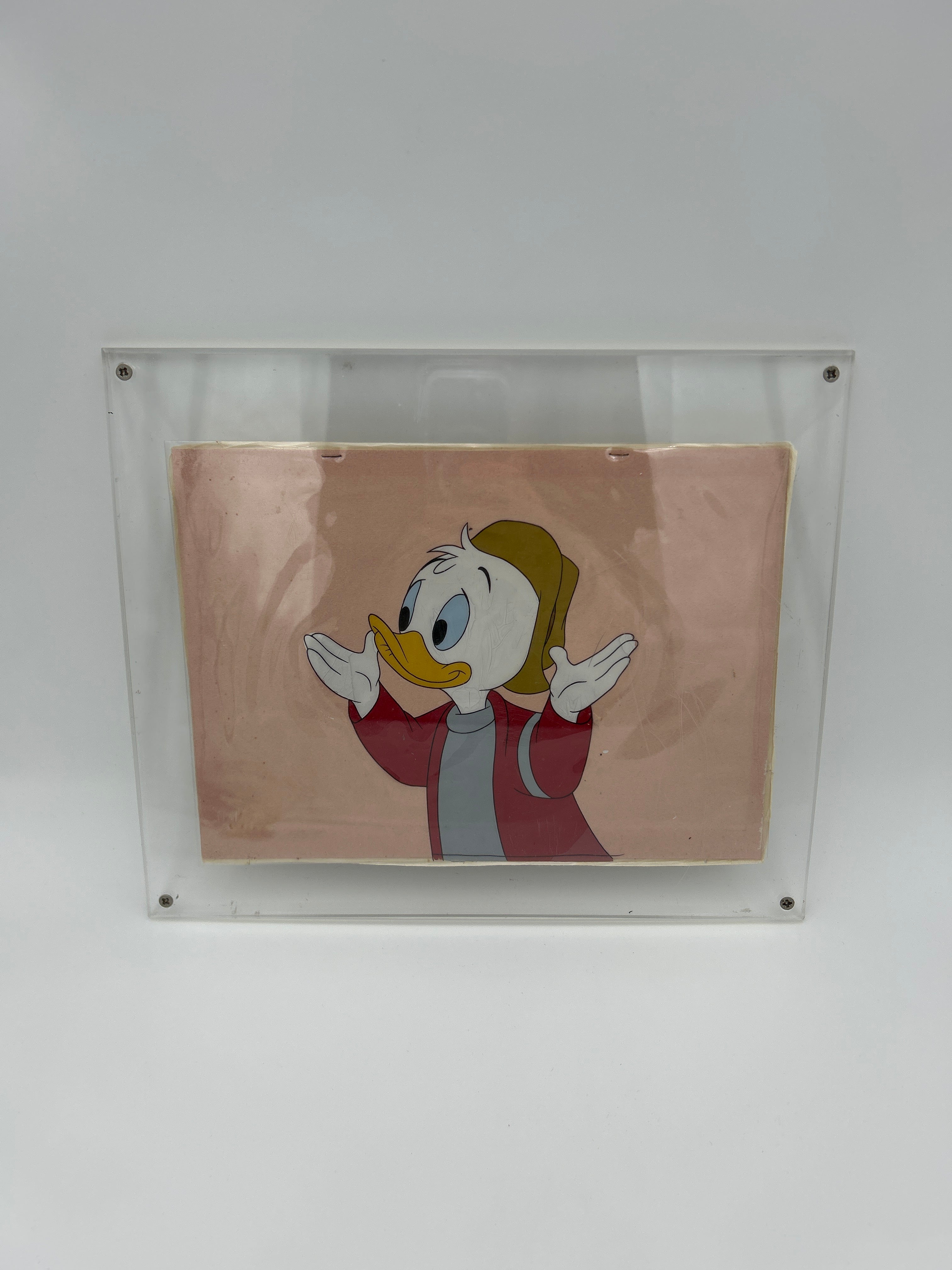 The creation of celluloid drawings for Donald Duck and his nephews followed the traditional animation techniques developed at Walt Disney Studios in the 1930s and 1940s. The process began with storyboarding and layout design, where animators planned out the key scenes and actions. Characters like Donald Duck, who debuted in The Wise Little Hen (1934), and his nephews, introduced in Donald’s Nephews (1938), were carefully designed by animators to ensure consistent looks across various scenes. The animation was first sketched on paper, with the key poses drawn to outline the character movements and actions.