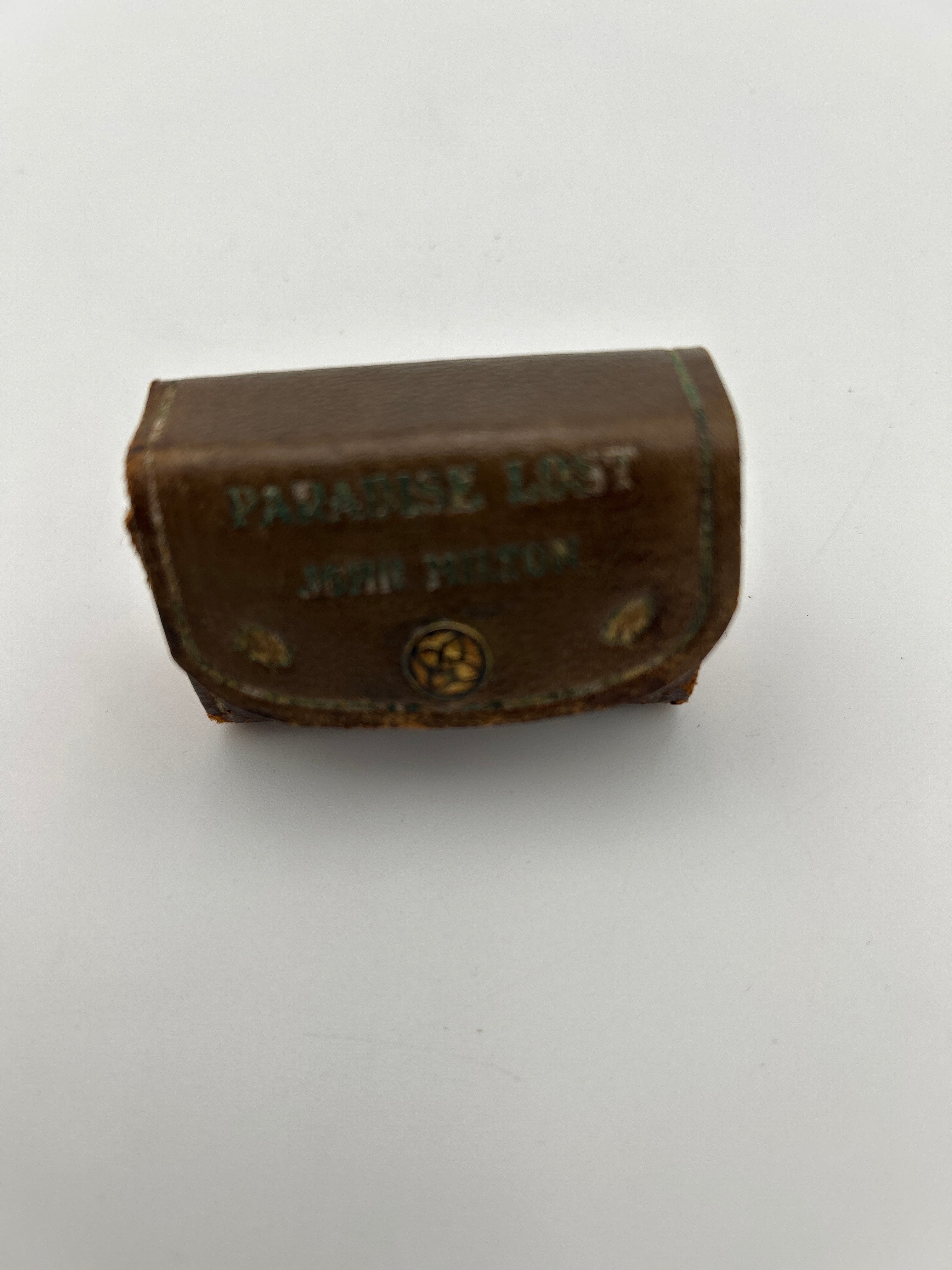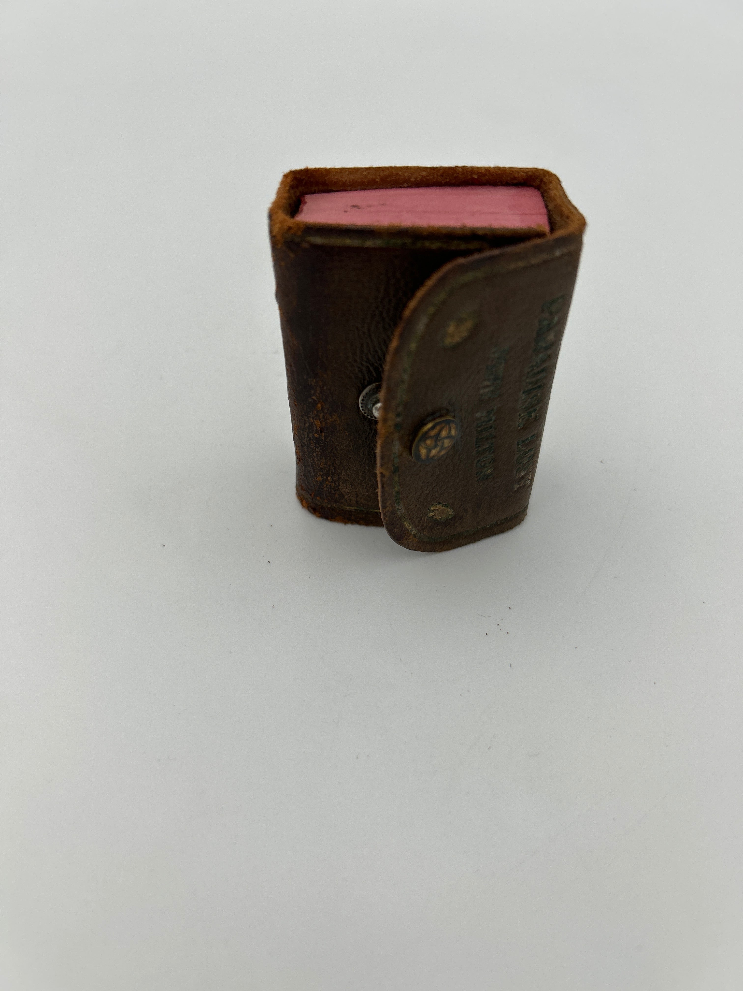 Brown leather miniature enclosure case, red three edge, intact, good condition.
