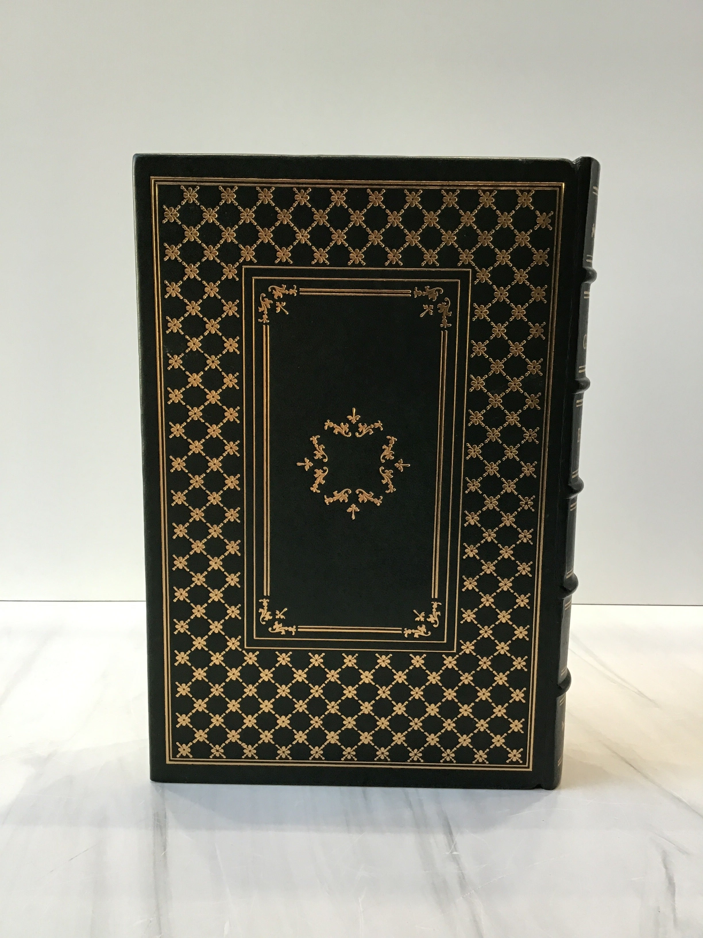 Deep green leather bound edition with gold embossed detailing on spine, front, and back cover as well as gold embossed lettering on the spine. Gold fore edge with deep green silk bookmark and five raised bands. Pristine Franklin Library Edition with illustrations throughout.